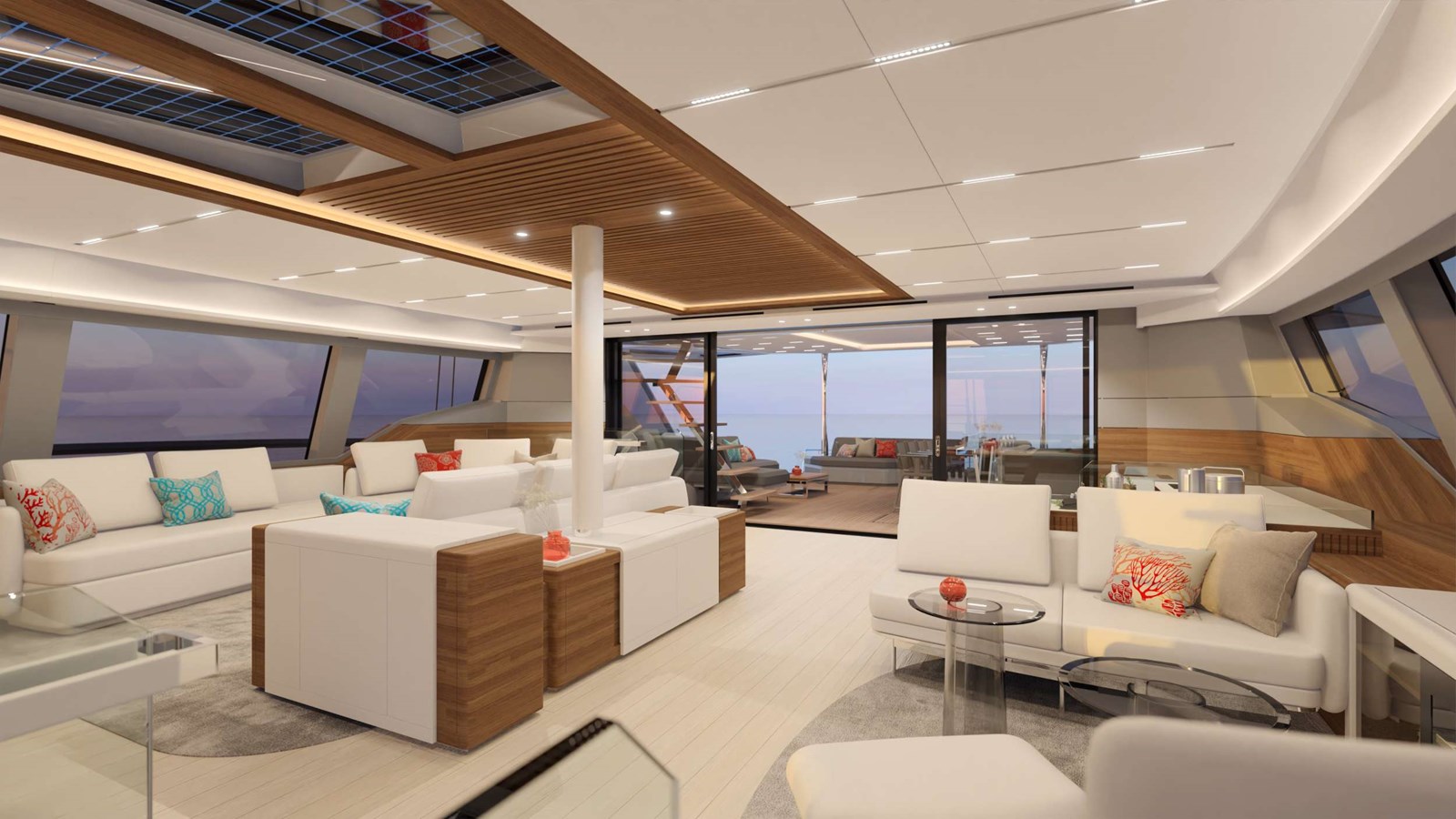 Deep sofas to starboard and free-standing seating to port with cocktail tables both enjoy fantastic views of the sea through the wrap-around windows.