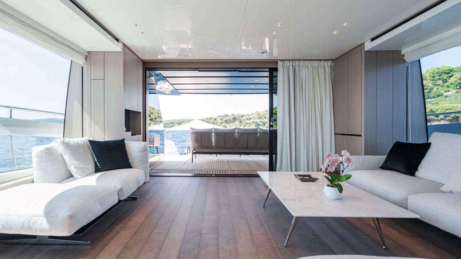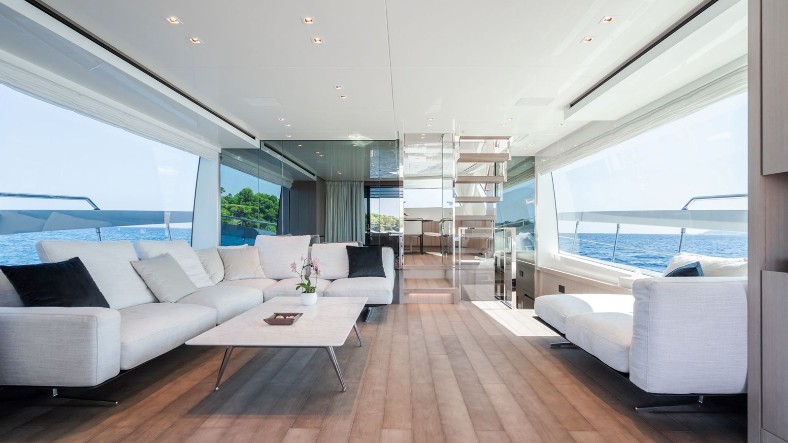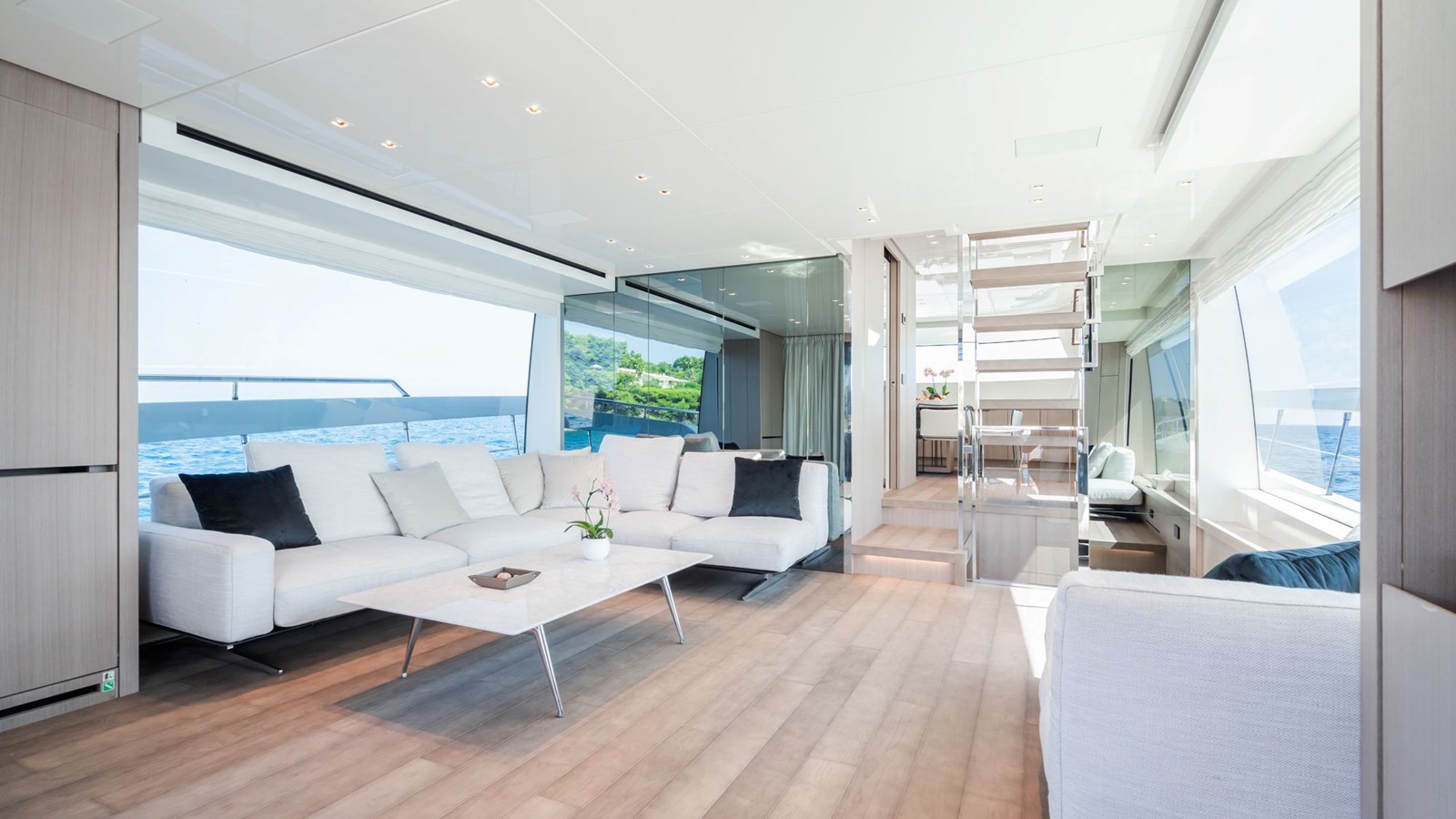 FITLINE is a Sanlorenzo SX76, perfectly designed for luxurious coastal exploration. Her crossover layout places the helm on the flybridge, leaving the main deck entirely dedicated to an open-plan living space. The galley is located next to the dining area, while the spacious saloon, bathed in natural light from its large windows, provides a relaxing environment with stunning sea views.The yacht’s outdoor spaces are equally impressive. The expansive swim platform, equipped with a hidden sea crane, offers plenty of room to unwind and easy water access through a hydraulic system and stepped passerelle. The foredeck features a cozy lounge ideal for sunbathing or enjoying cocktails, while the flybridge boasts panoramic views, a bar, a grill, and space for al fresco dining. Below deck, FITLINE accommodates up to eight guests in four stylish en suite cabins, each with a private shower. With her modern design and thoughtful amenities, FITLINE promises a luxurious and memorable journey at sea.