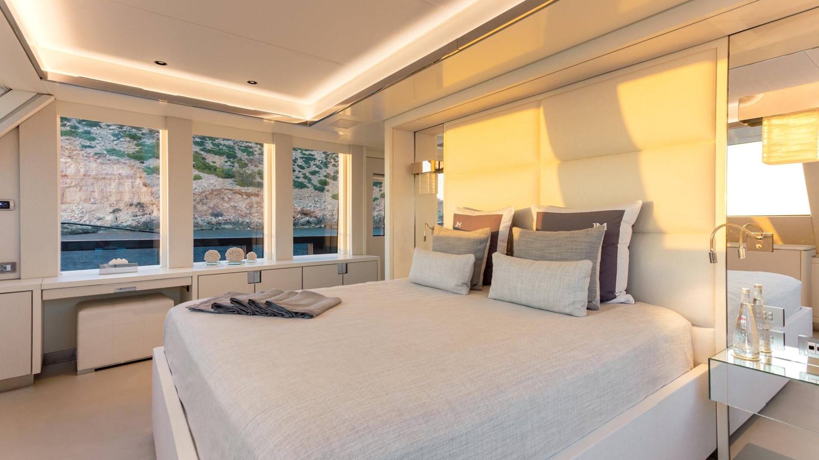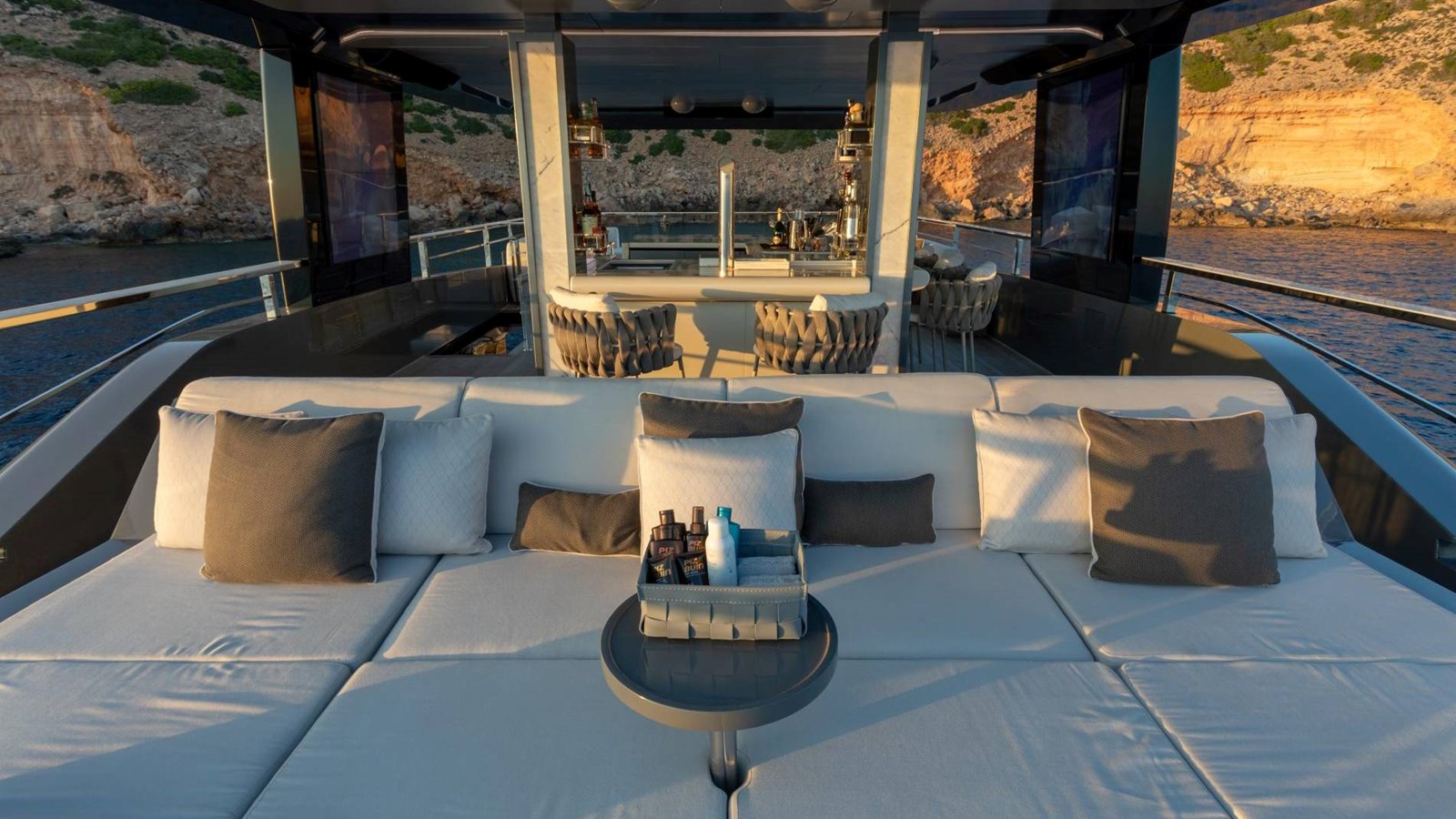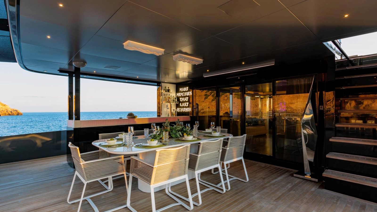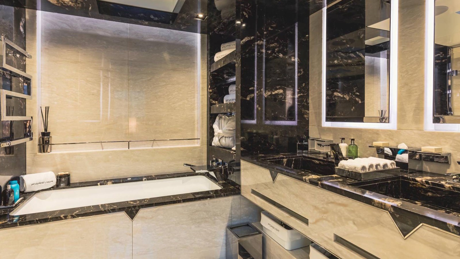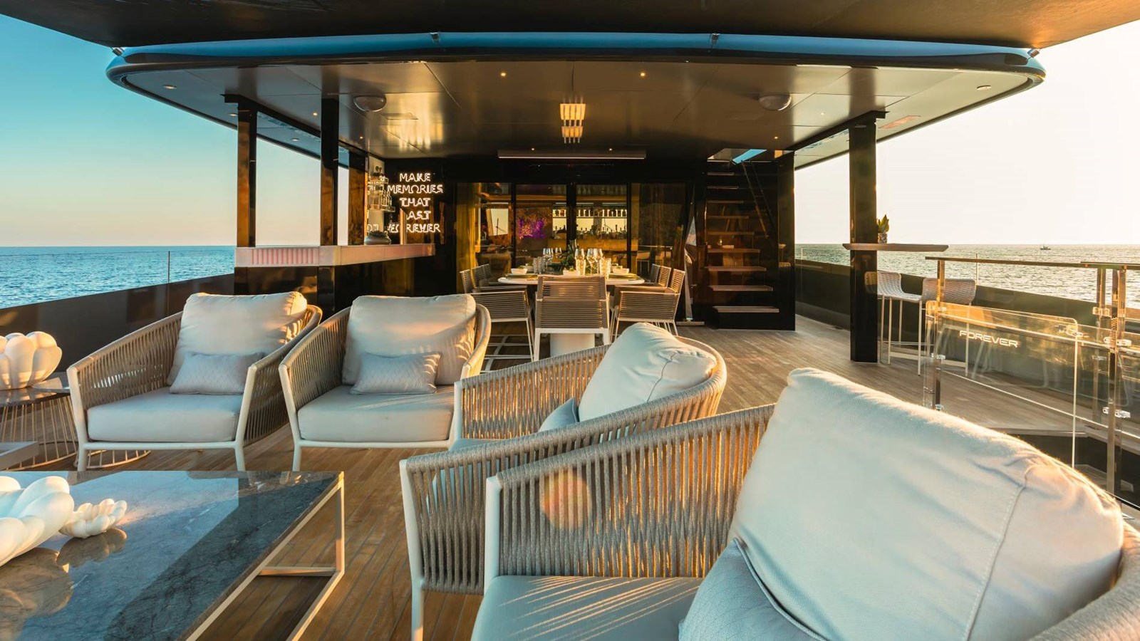 Designed for entertaining, FOREVER has a 5.5-meter (18 ft) foredeck pool with Jacuzzi and jet system, expansive al fresco dining spaces, and a flybridge featuring a statement bar counter. Additional highlights include a gym-equipped beach club with an adjacent steam room, state-of-the-art lighting and sound systems, and partially new teak decks. The interior adopts a Miami beach-inspired style with brushed marble and Loro Piana-lined walls, creating a chic yet inviting ambiance.