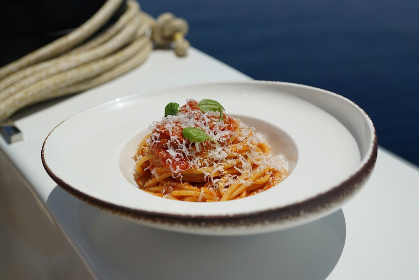 Sepia paste with calamari: This elegant and rustic dish combines spaghetti with the captivating flavours of lightly cooked fresh squid, squid ink, garlic, white wine and parsley.
