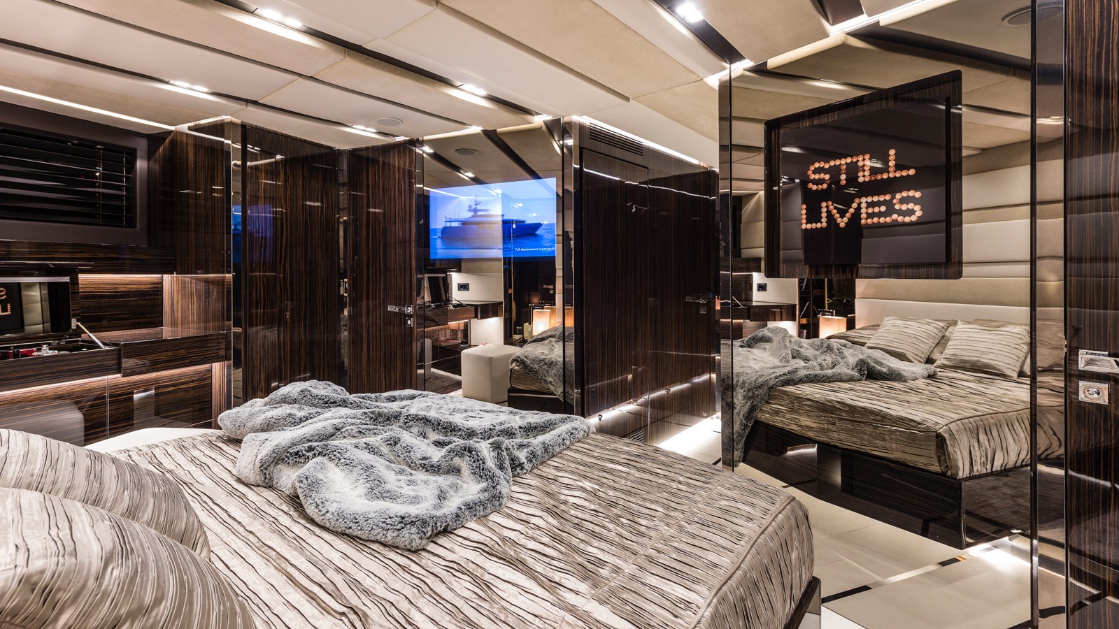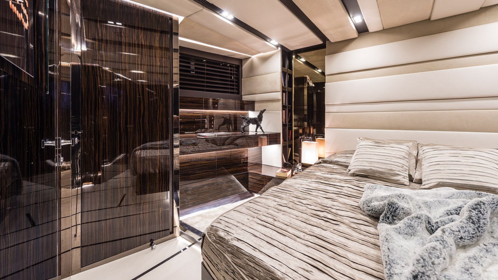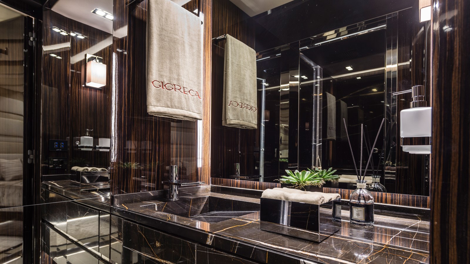Designed with liveability in mind, generous volumes throughout Gigreca equal that of a much larger yacht, while her sleek design gives the feeling of being right on the water. Highlights include the multi-purpose cockpit, styled as a ‘terrace on the sea,’ beach club space, and spacious main saloon with a stunning backlit marble bar. Perfect for living the good life at sea, Gigreca is a true beauty with a modern luxe vibe.