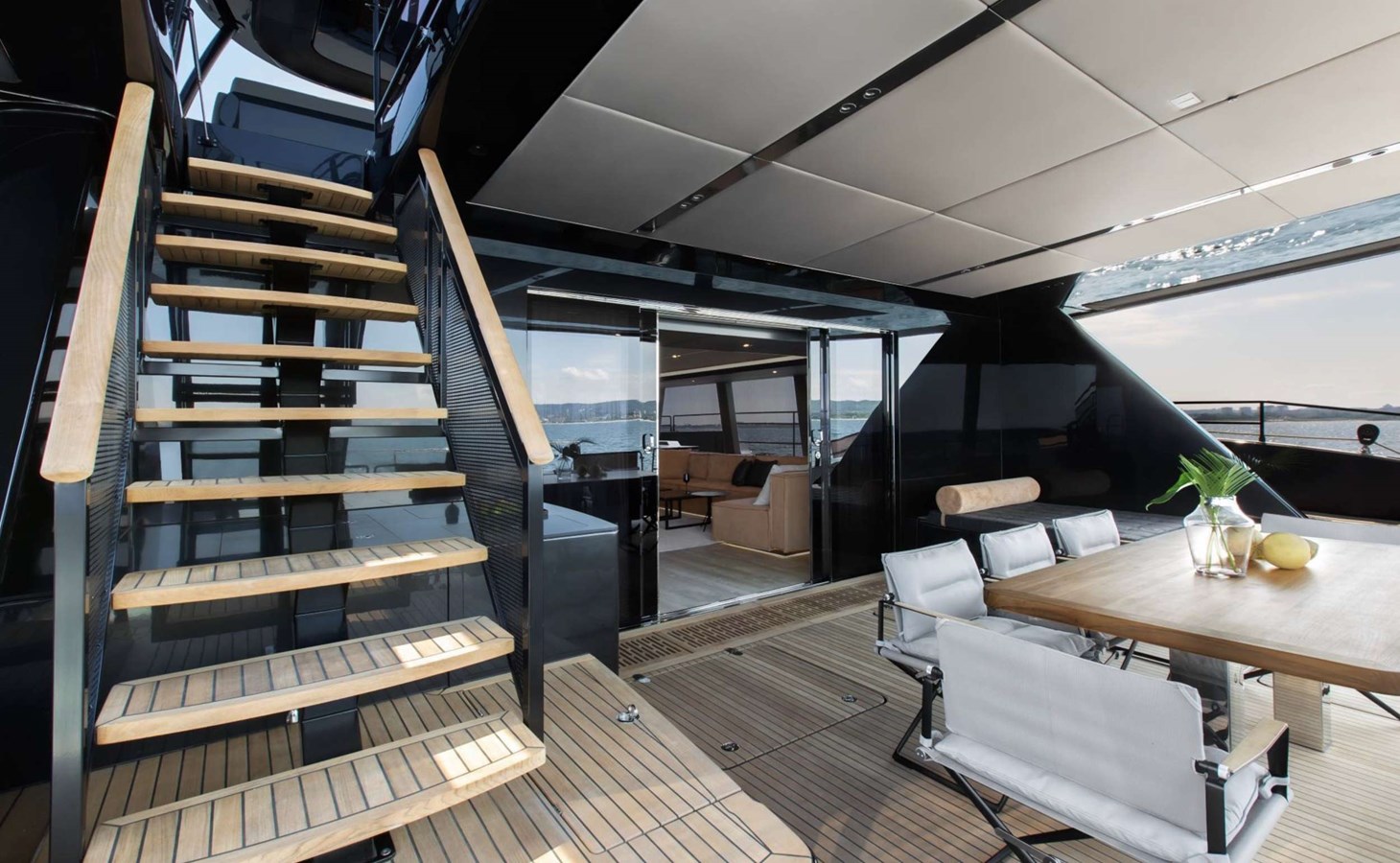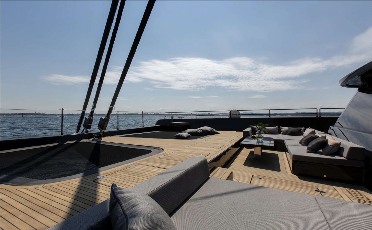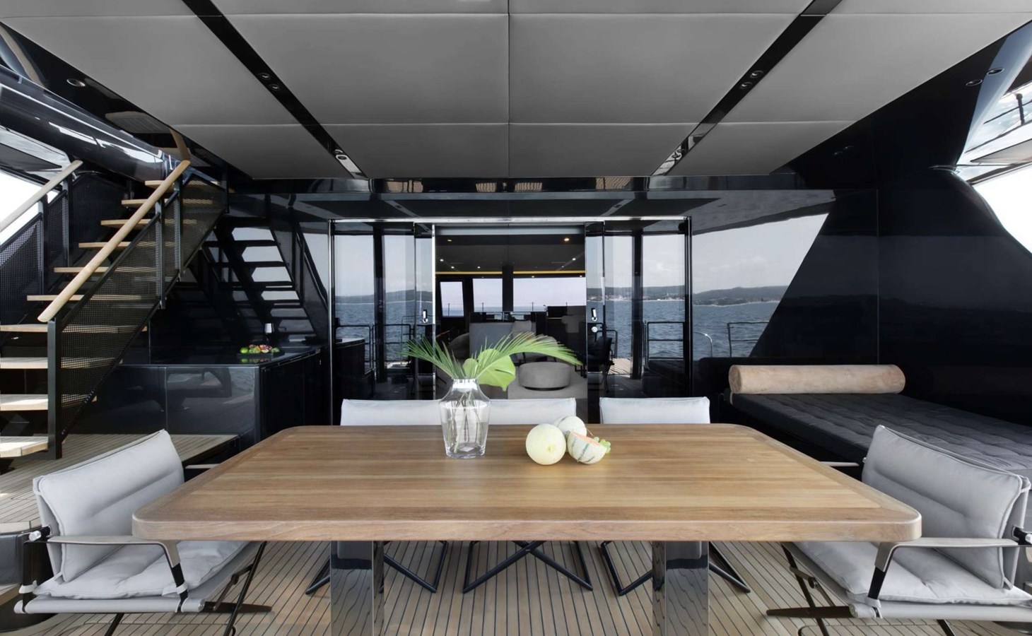 GRAYONE is a very fashionable dark grey hull color highlighting her gorgeous exterior lines and the enormous deck area covering the three teak decks. The formal dining area is located to port, while a luxurious sofa and matching drop-down table are located in the centre area, beneath the port windows. The opposite side features a comfy L-shaped sofa accompanied by coffee tables, armchairs, and footstools, all of which can be used as extra gathering and resting spaces. In contrast to the traditional nautical decor found on other luxury yachts of a comparable size, the interior of this one features a light ceiling and floors, dark blue and white tones, and a warm, welcome soft orange utilized in part for the materials.
