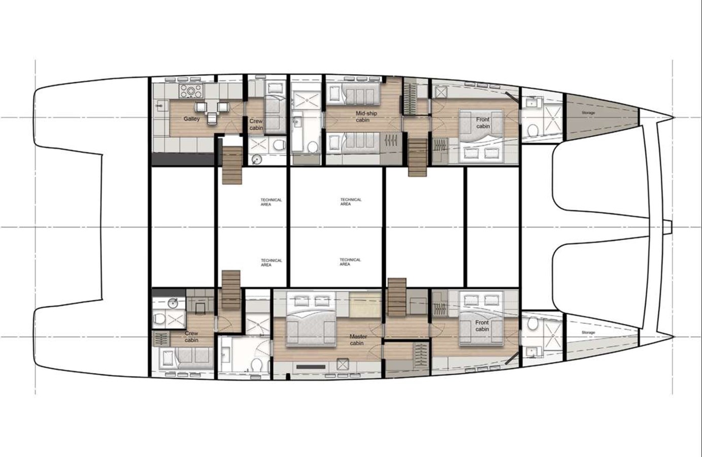 The GRAYONE luxury catamaran’s clever internal layout allows for a front bar complete with a wine cellar to serve guests both inside the boat and on the foredeck. Guests will have a hard time deciding between the aft cockpit, the spacious flybridge, and the upper deck, which features two loungers, integrated seating with breathtaking views of the water, and a cocktail table.