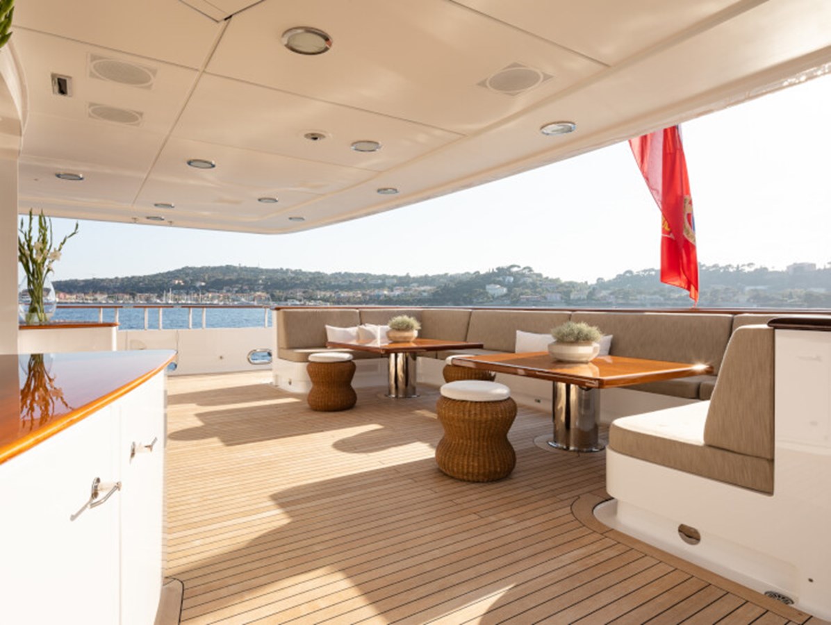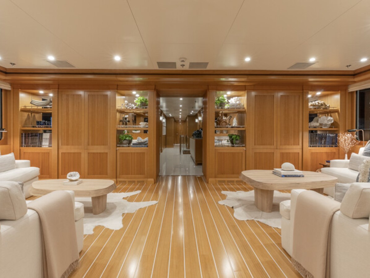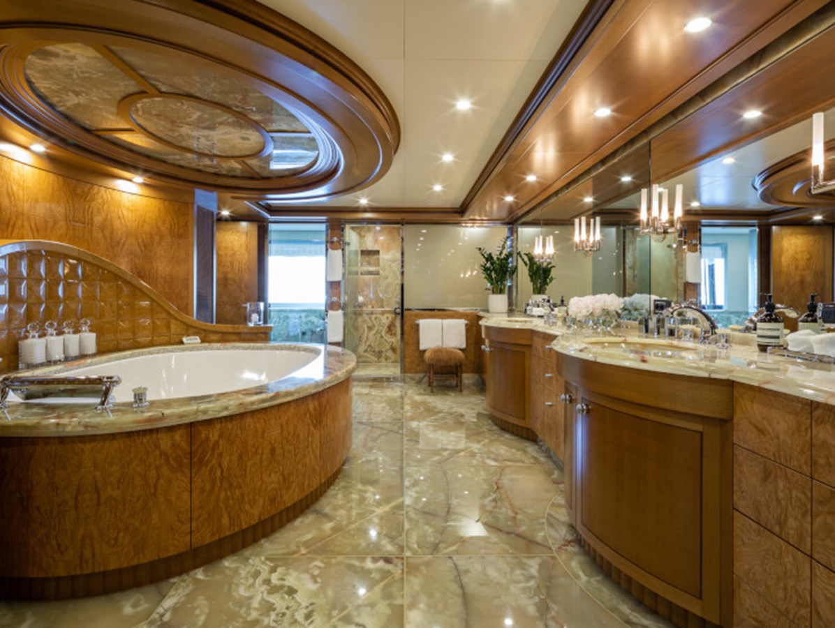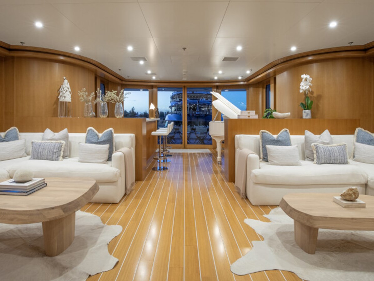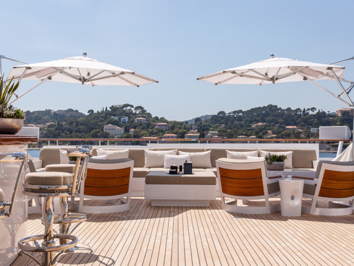 Inside, her fresh and neutral interiors combine shades of gold and beige with sophisticated light wood panelling, to create a relaxing indoor environment. Fully-equipped bars can be found in both her main and upper salons and entertainment systems feature throughout all her cabins.