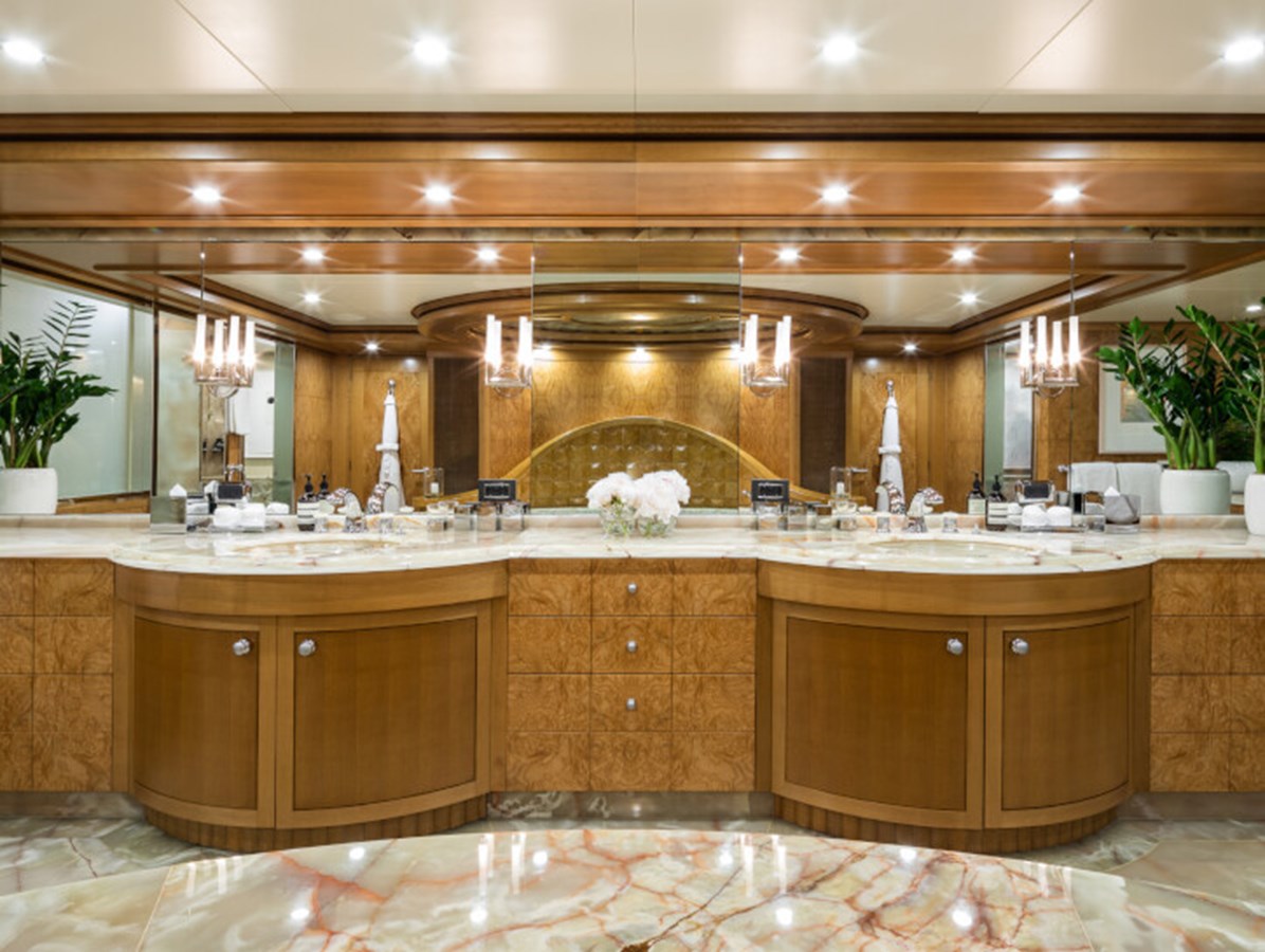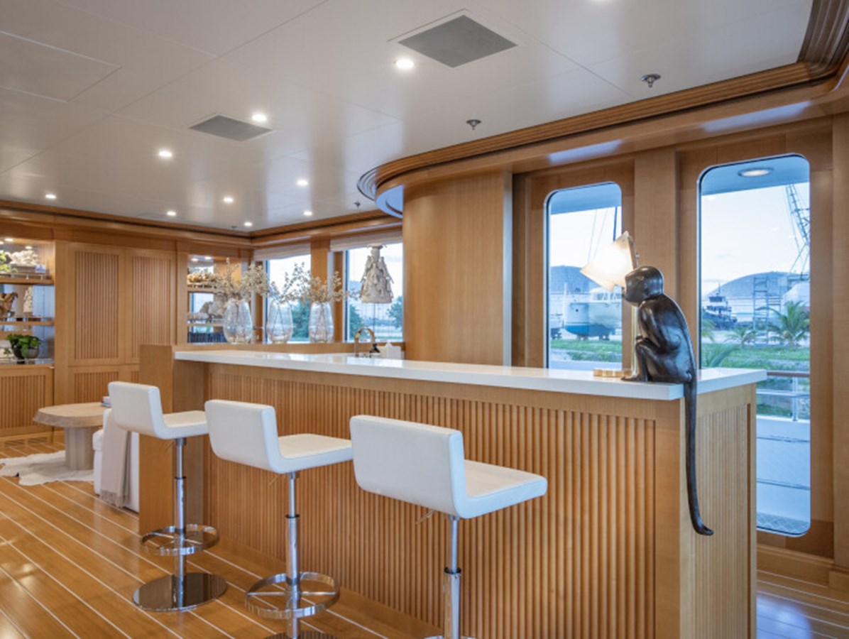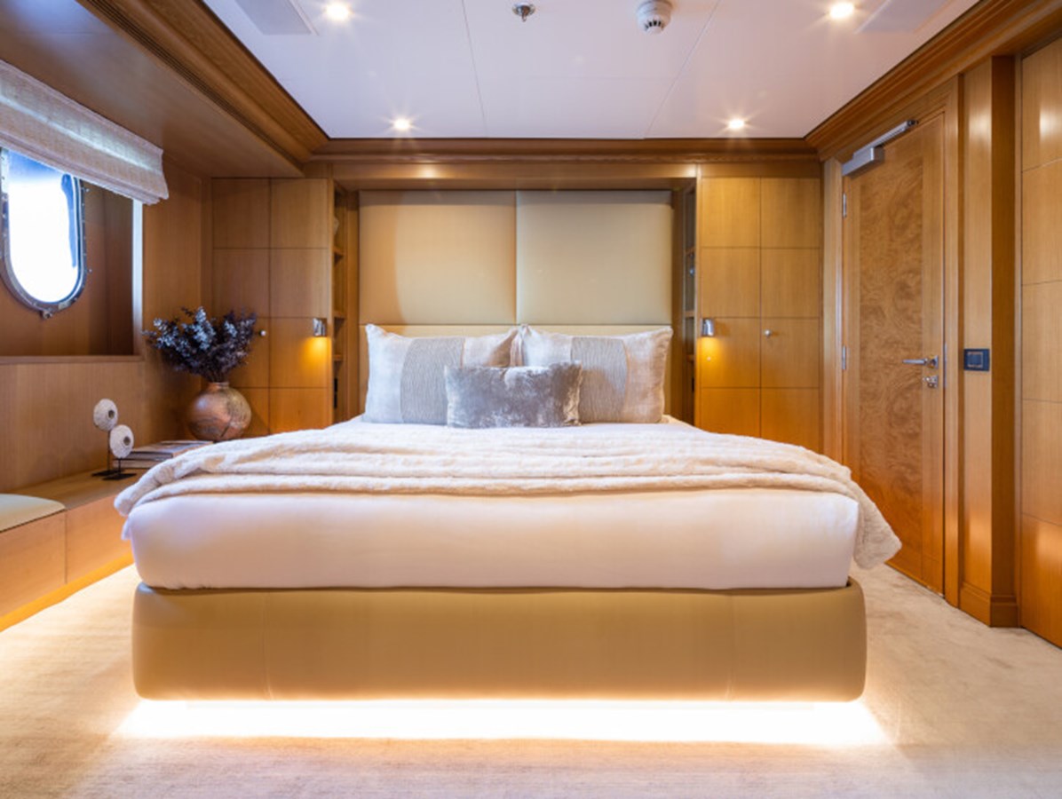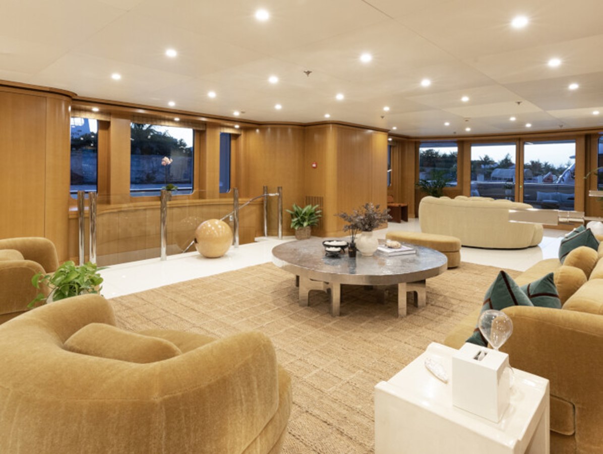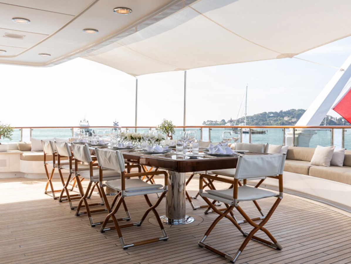 Inside, her fresh and neutral interiors combine shades of gold and beige with sophisticated light wood panelling, to create a relaxing indoor environment. Fully-equipped bars can be found in both her main and upper salons and entertainment systems feature throughout all her cabins.