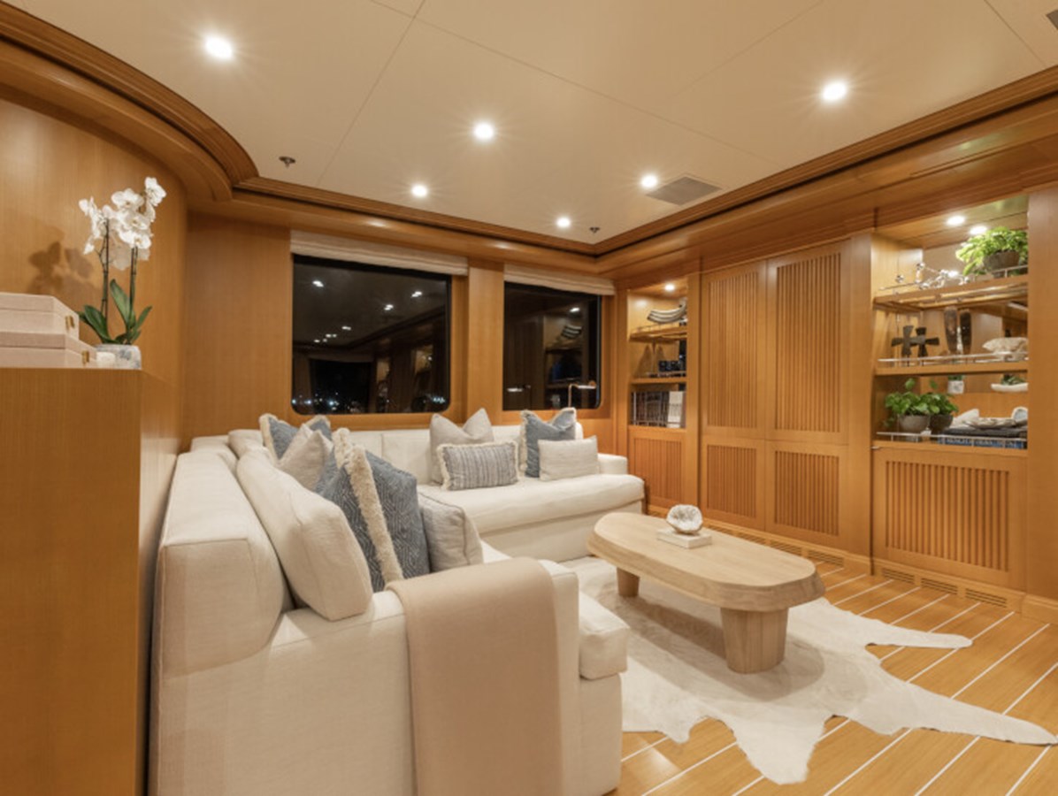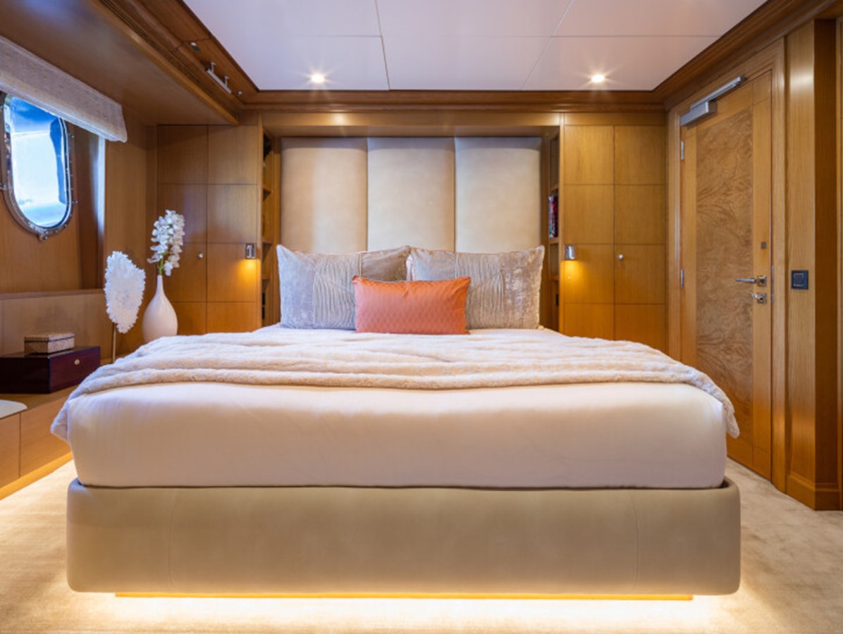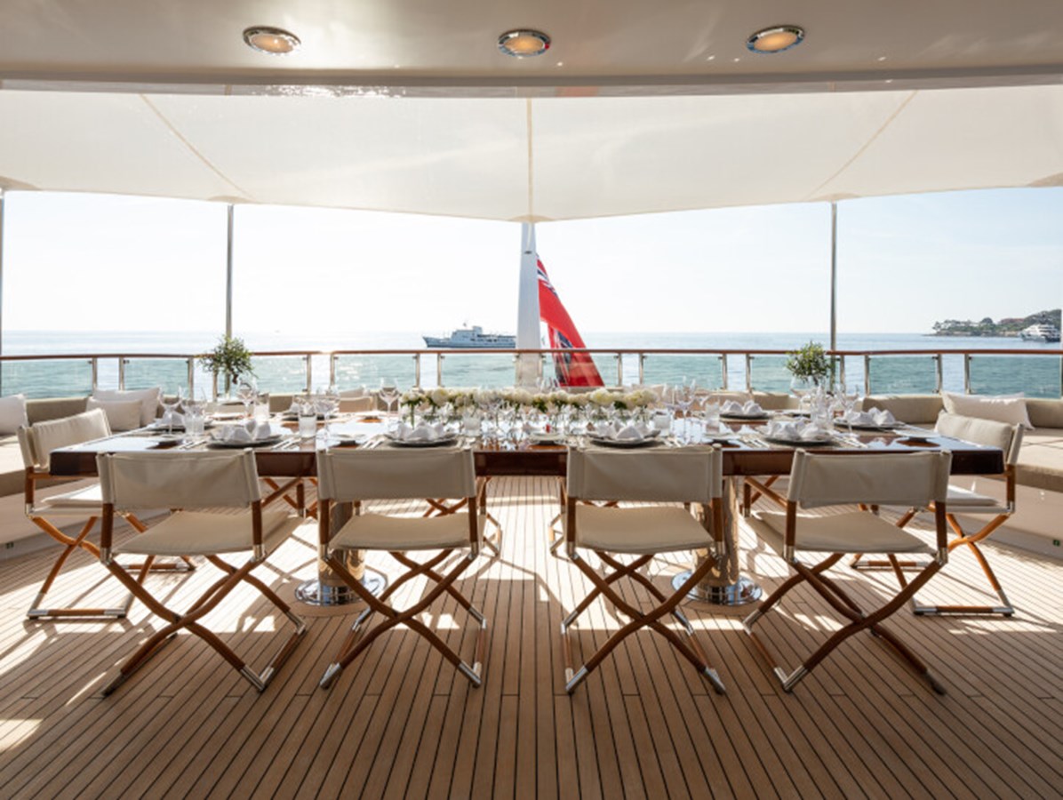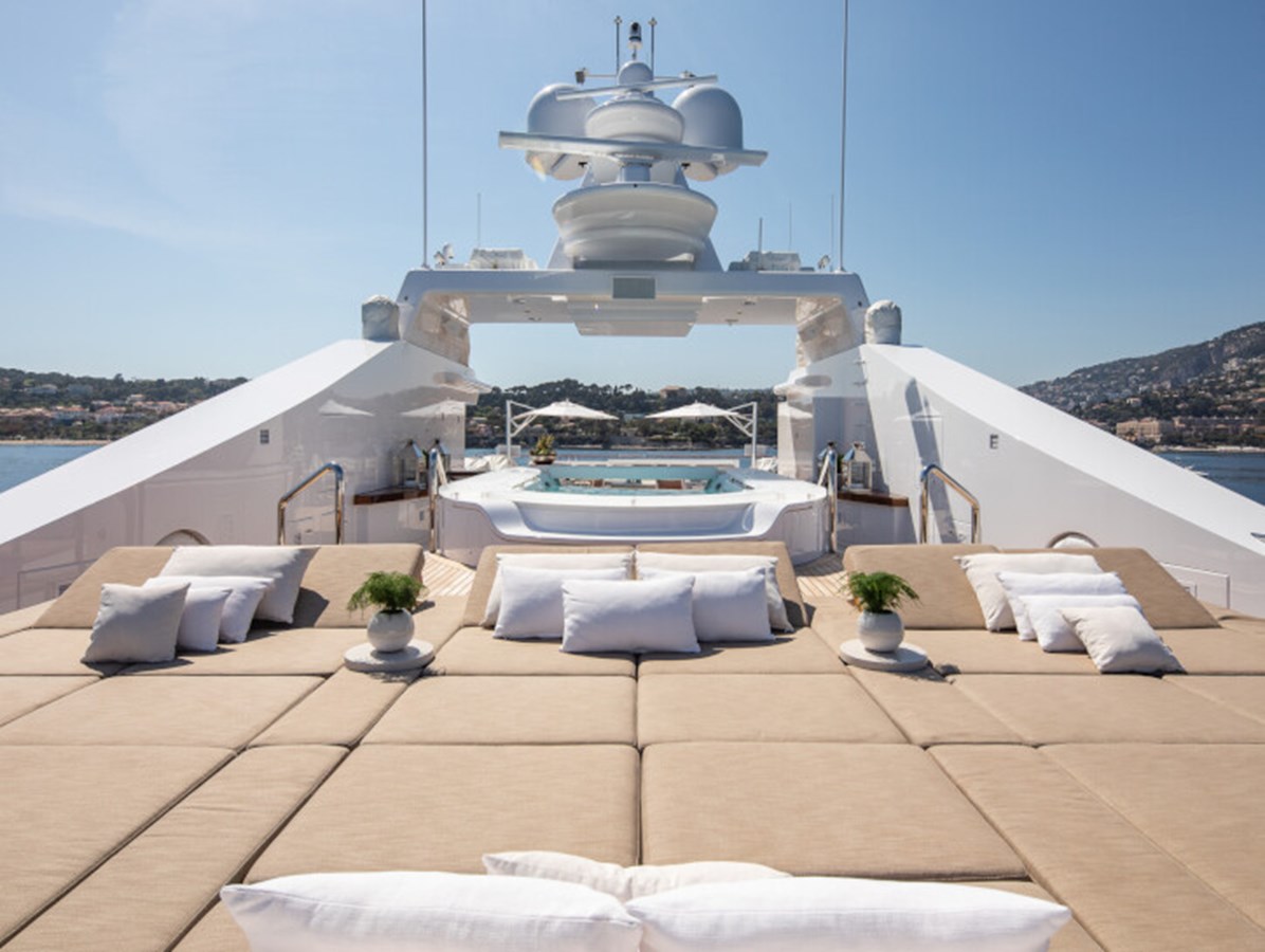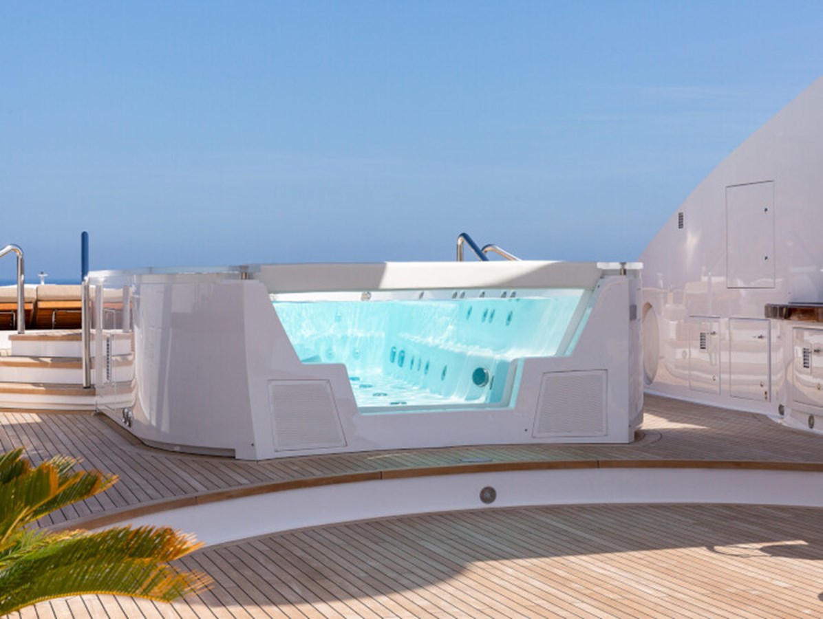 Inside, her fresh and neutral interiors combine shades of gold and beige with sophisticated light wood panelling, to create a relaxing indoor environment. Fully-equipped bars can be found in both her main and upper salons and entertainment systems feature throughout all her cabins.