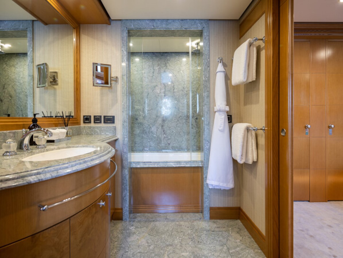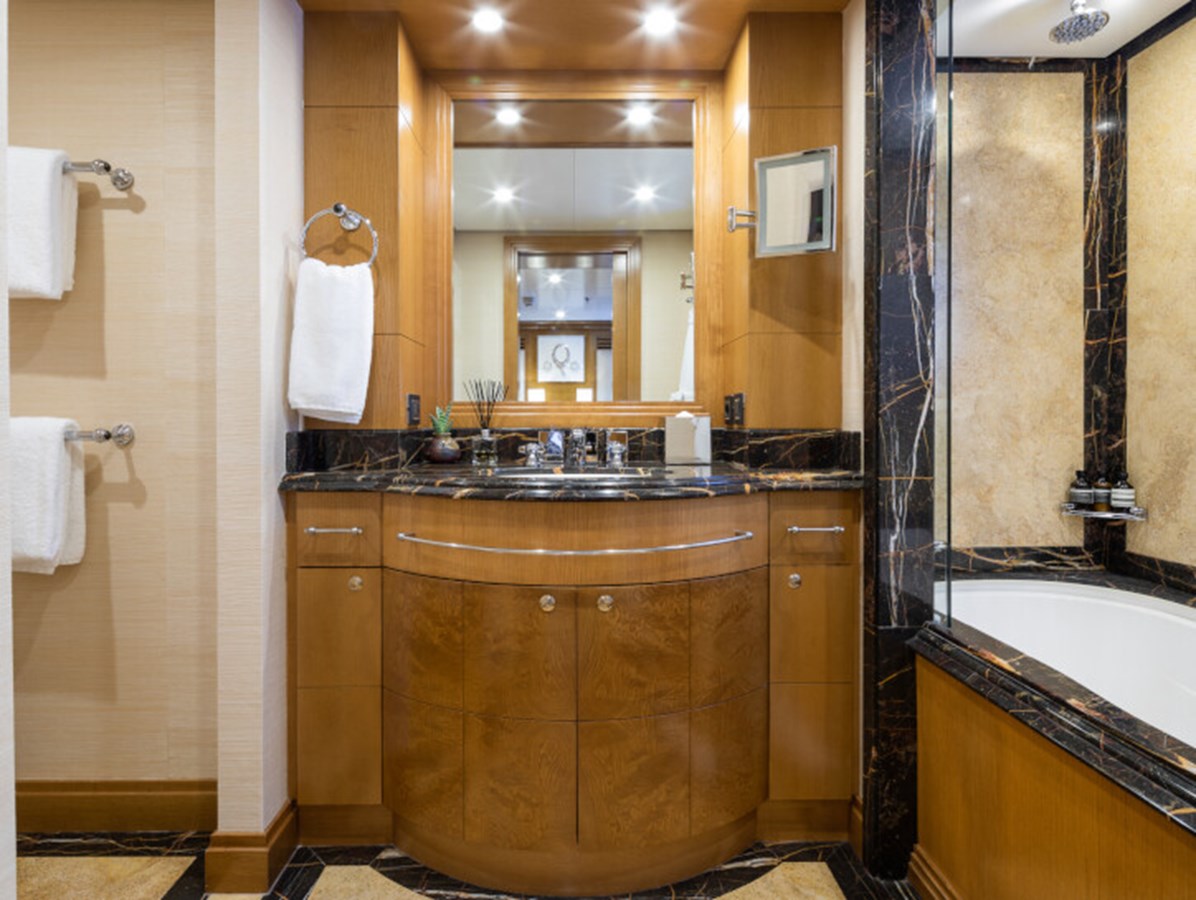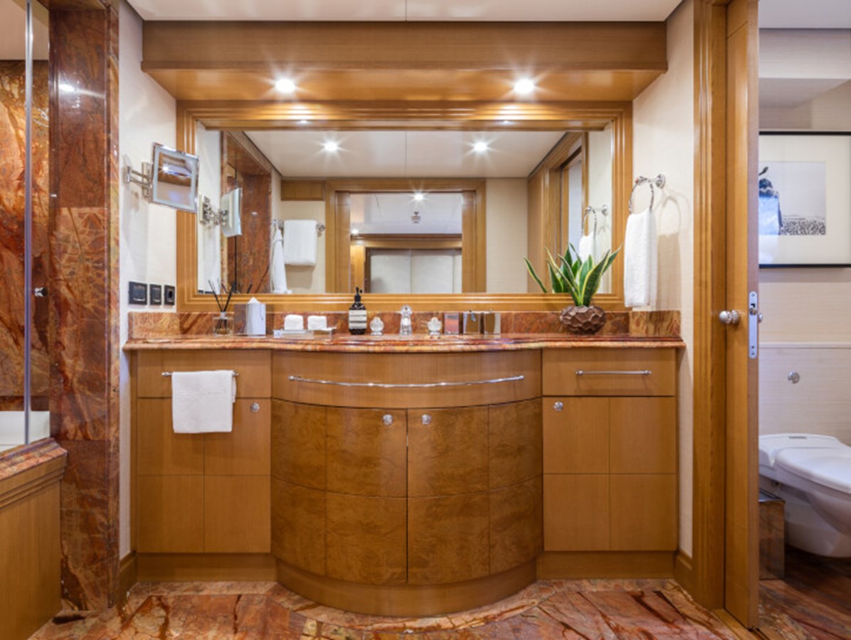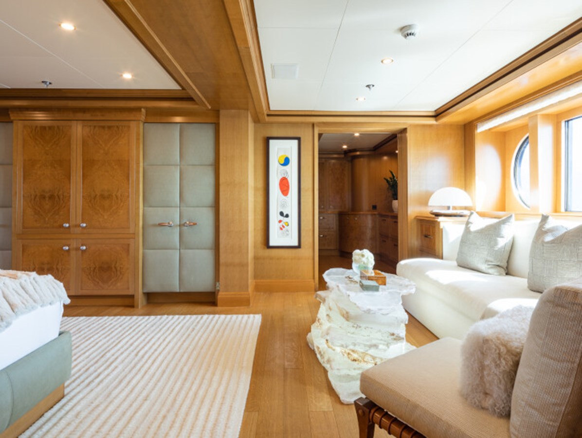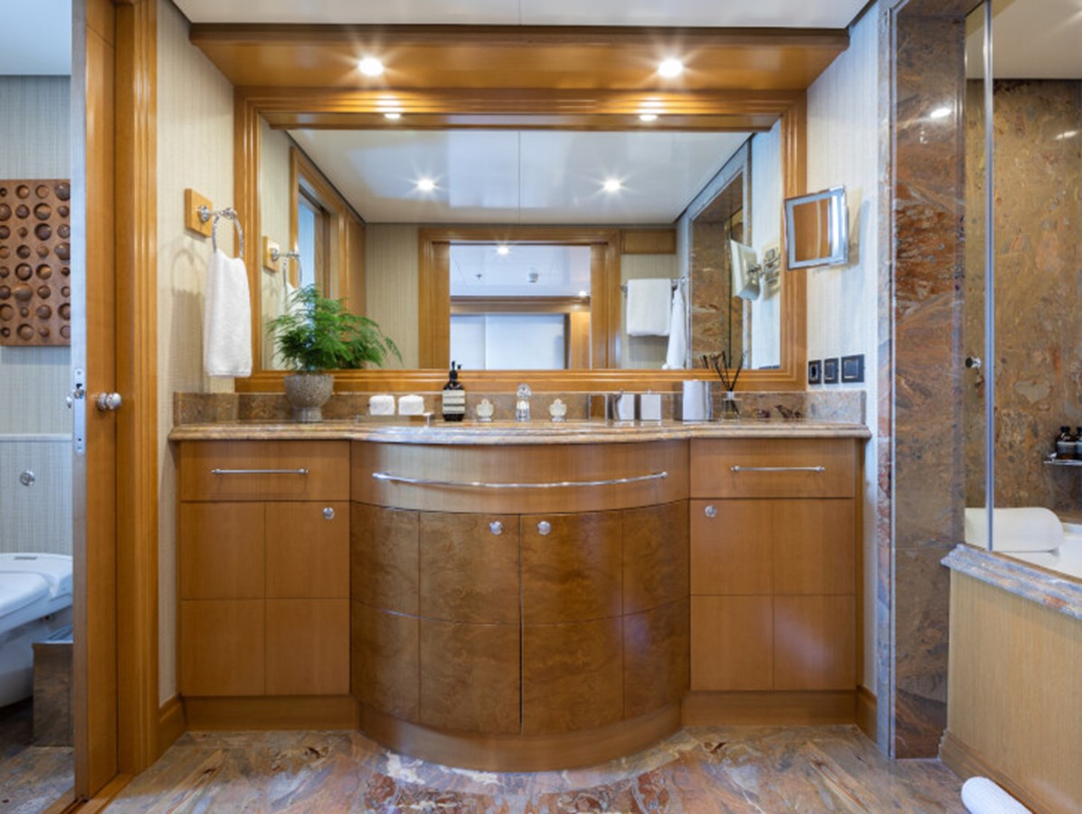 Inside, her fresh and neutral interiors combine shades of gold and beige with sophisticated light wood panelling, to create a relaxing indoor environment. Fully-equipped bars can be found in both her main and upper salons and entertainment systems feature throughout all her cabins.