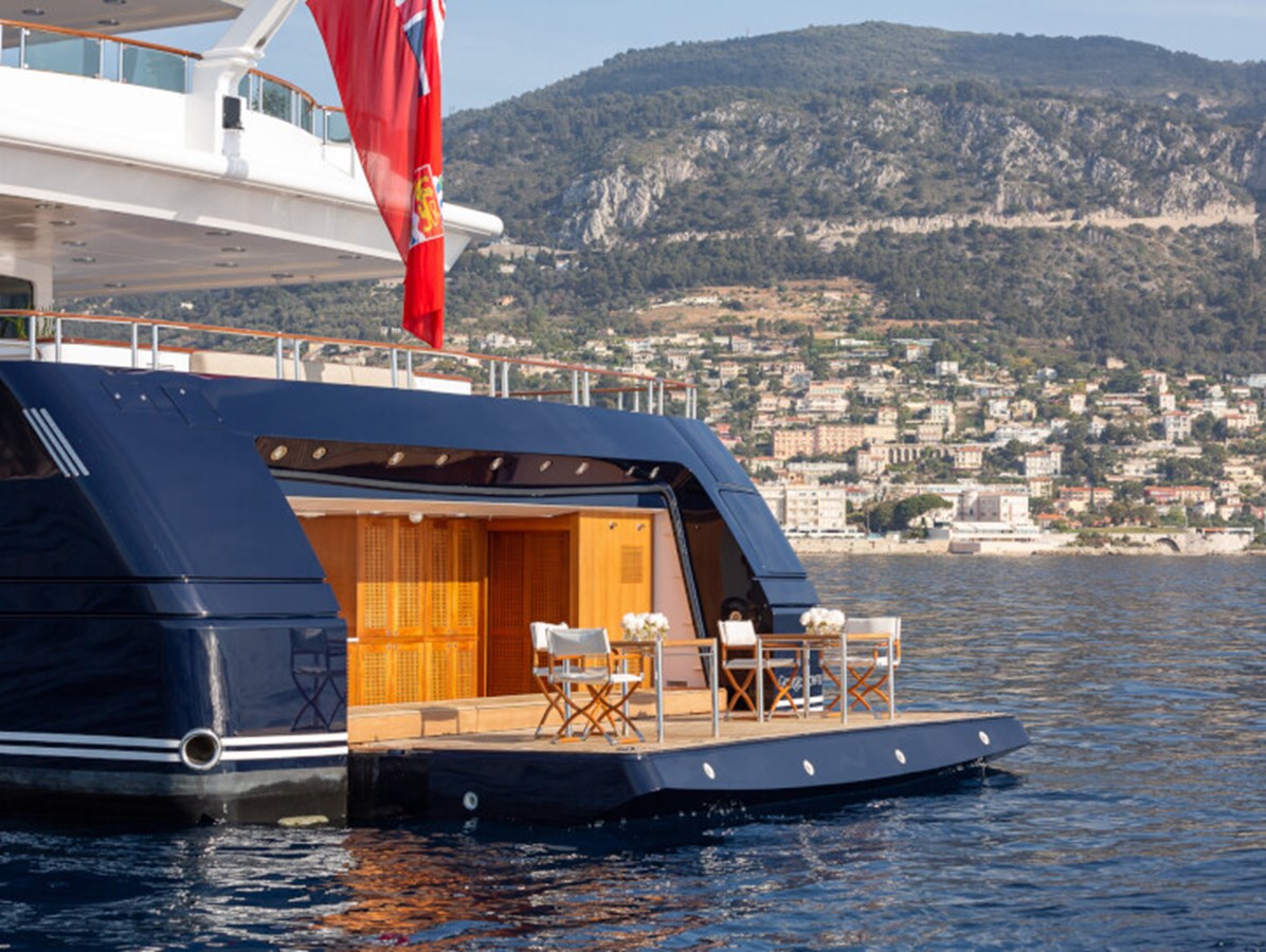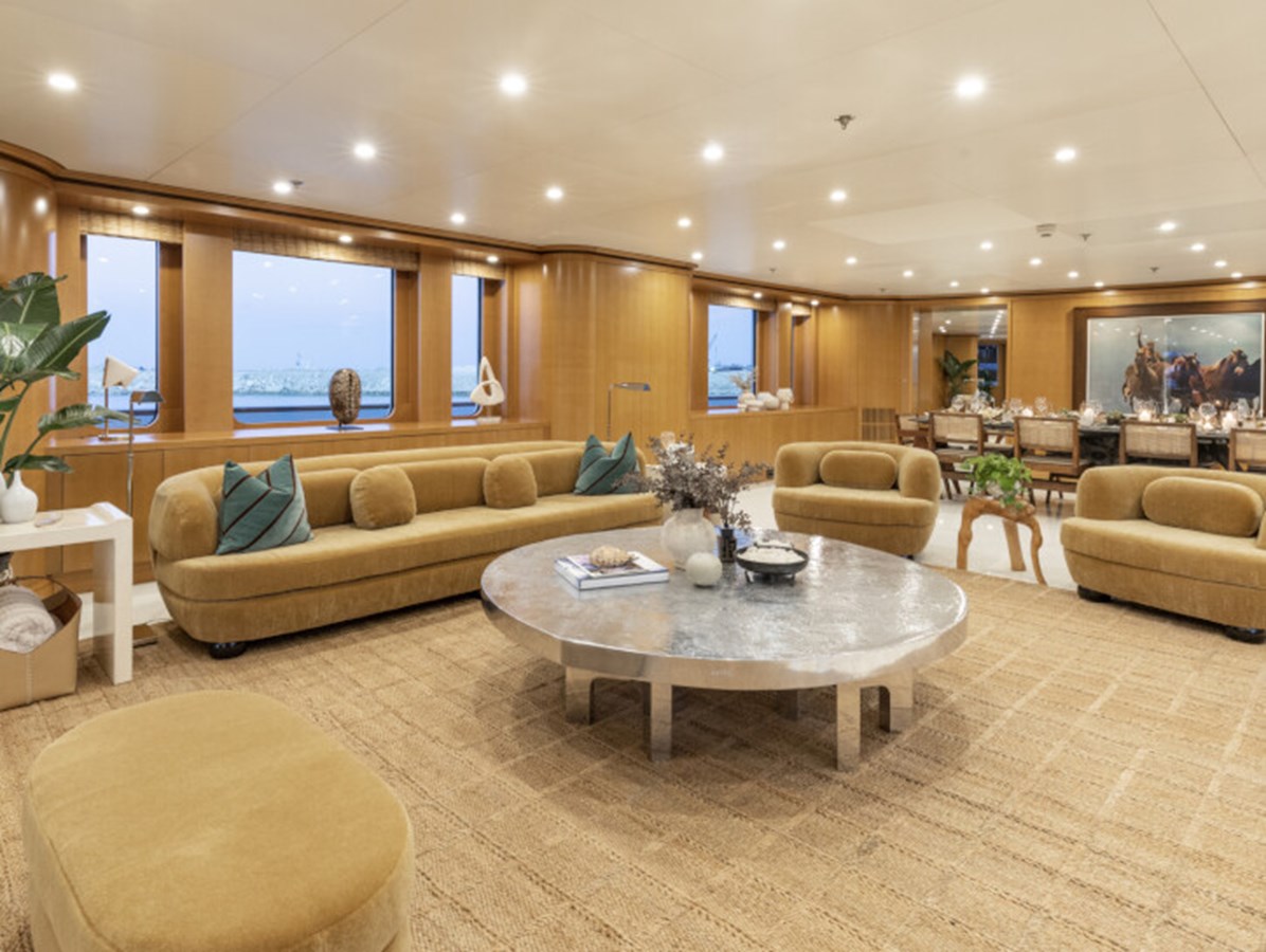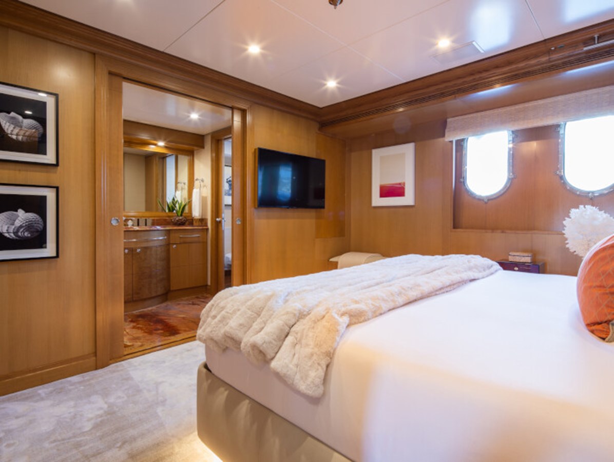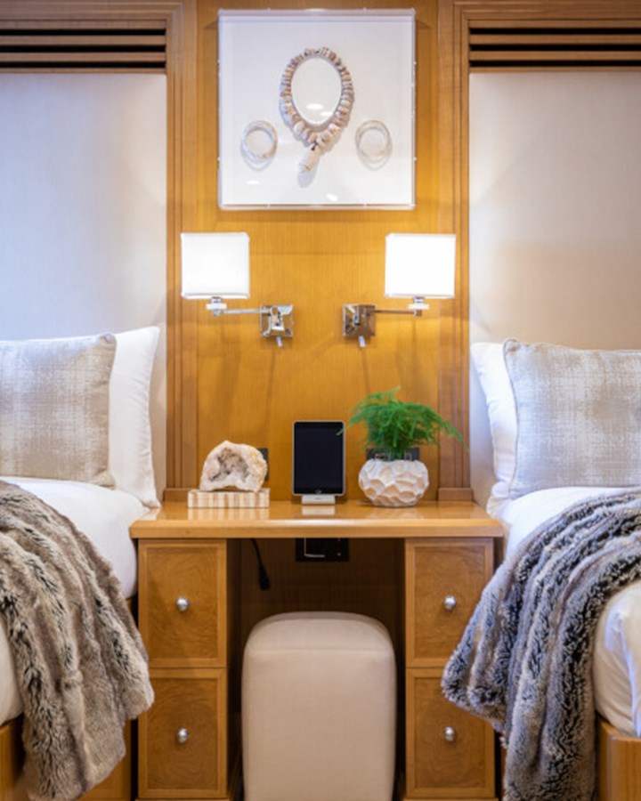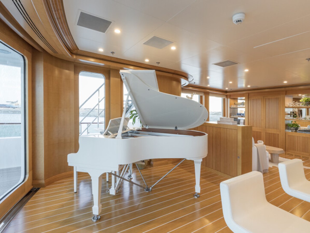 Inside, her fresh and neutral interiors combine shades of gold and beige with sophisticated light wood panelling, to create a relaxing indoor environment. Fully-equipped bars can be found in both her main and upper salons and entertainment systems feature throughout all her cabins.