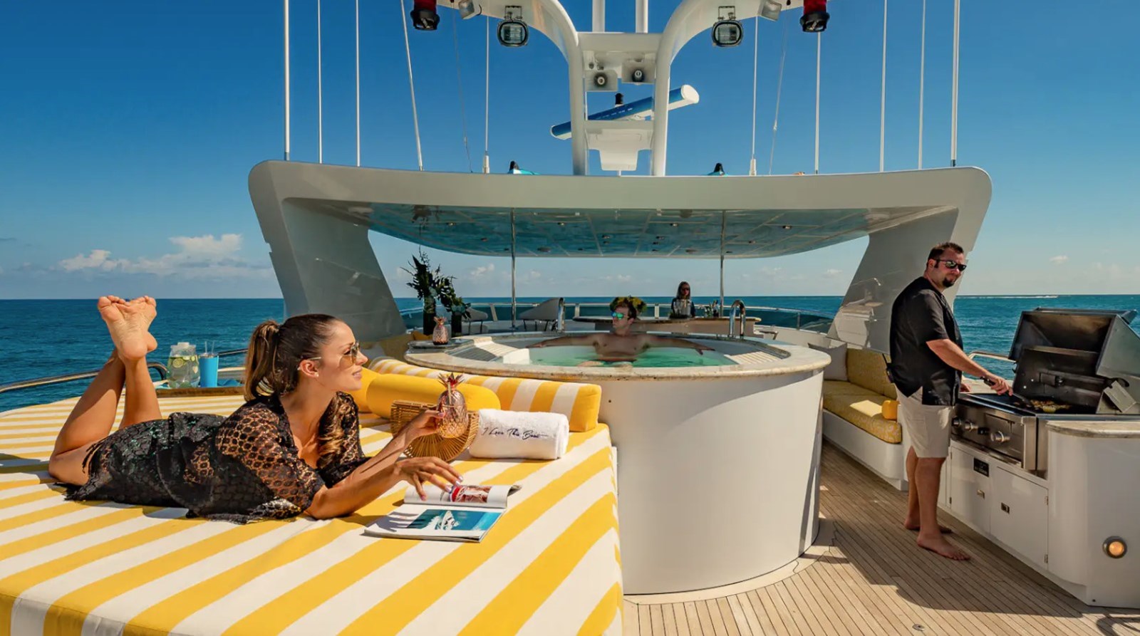 A favorite spot among charter guests is the yacht’s spectacular sundeck. Featuring a Jacuzzi, large sunpads and a bar with a frozen drink machine – the sundeck is the ultimate place to unwind. I LOVE THIS BOAT also offers a chic bi-level beach club where charter guests can lounge under umbrellas near the water’s edge and enjoy the yacht’s large array of water toys. For a more private retreat, guests can venture to I LOVE THIS BOAT’s bow and lounge on the sunpads while enjoying the surroundings.