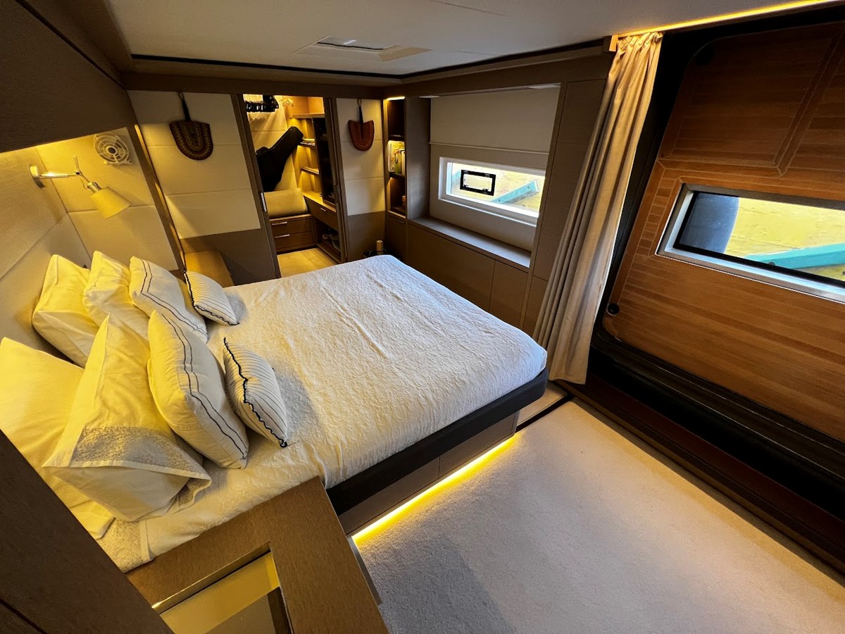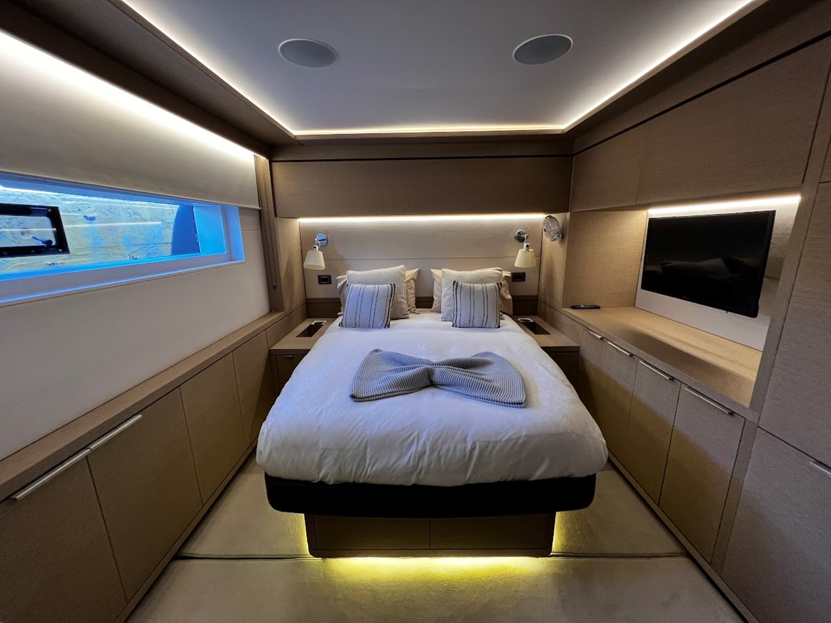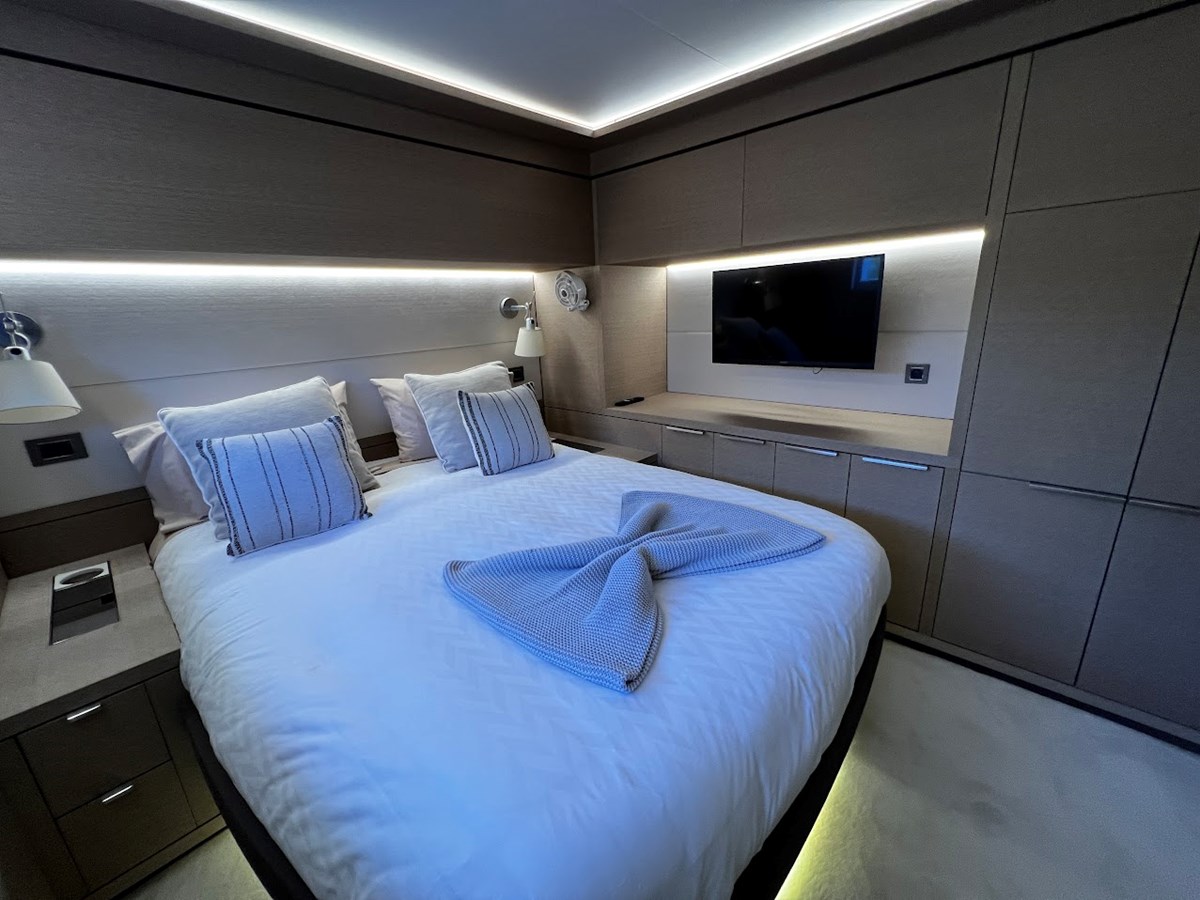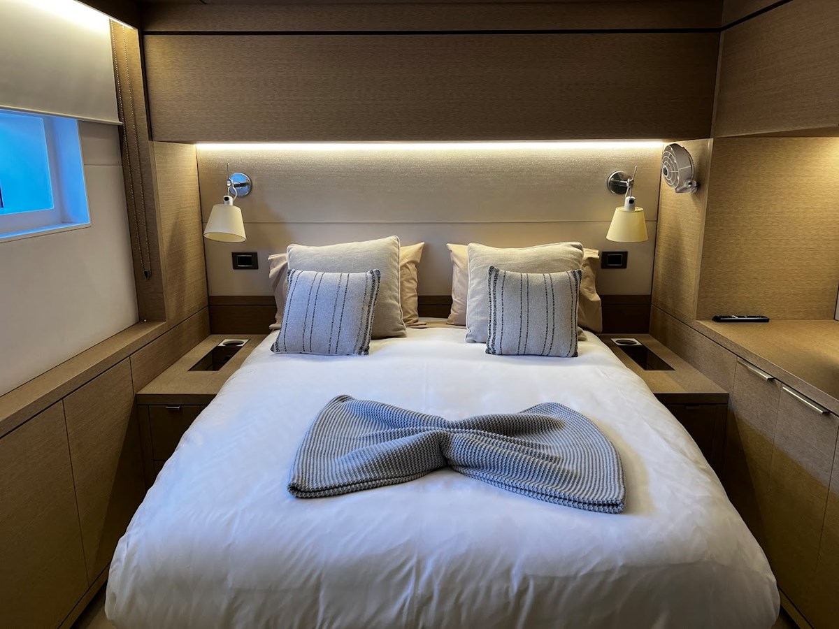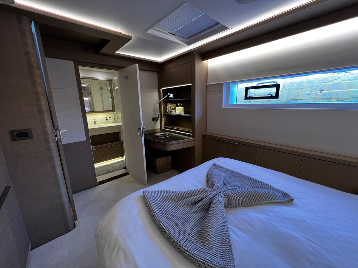 Two VIP cabins both feature queen berths all with private bathrooms. Her 36ft beam, provides such volume to her guests. In the fore deck is ideal for those how want to take in some sun. The space is epic!