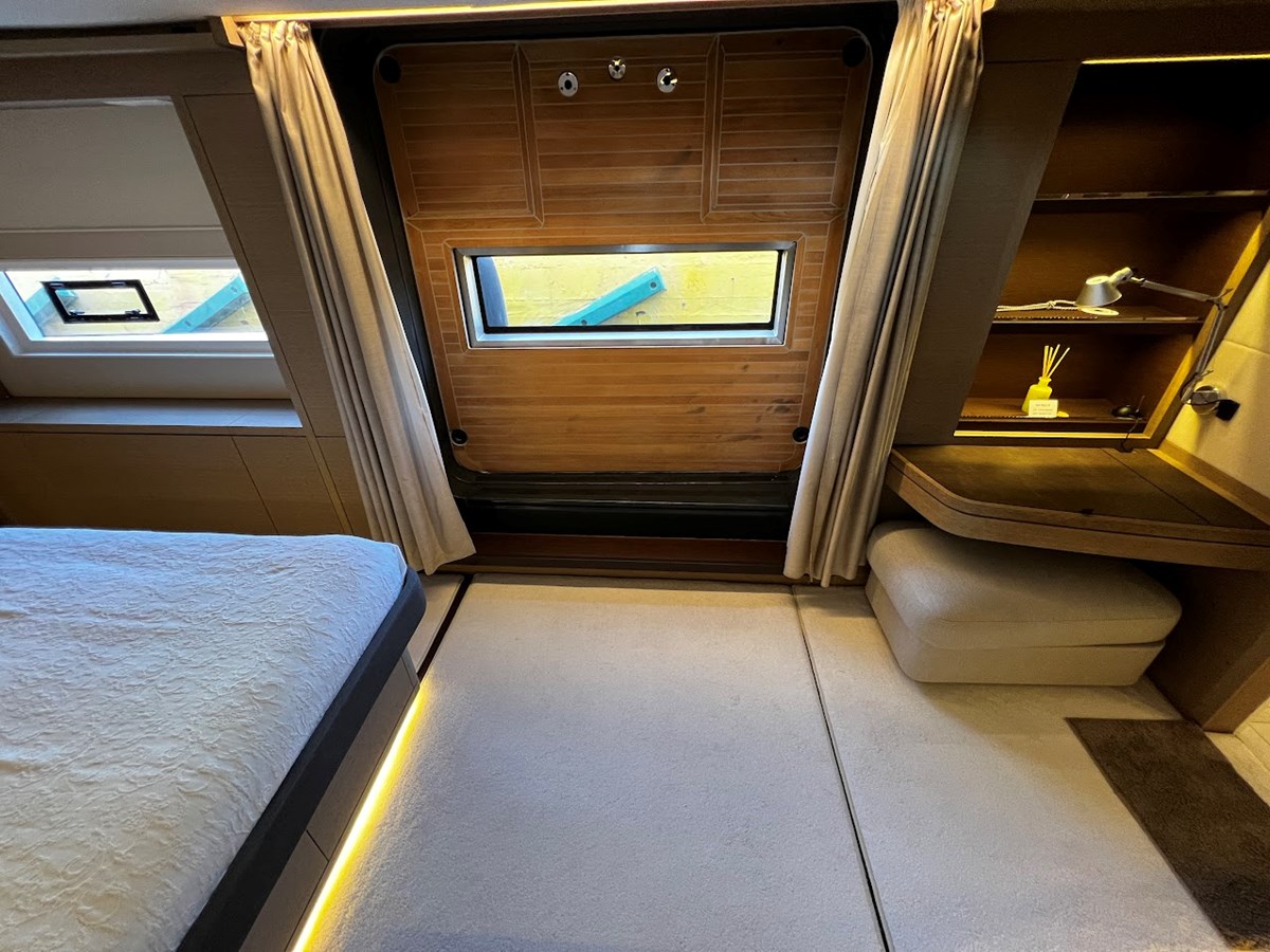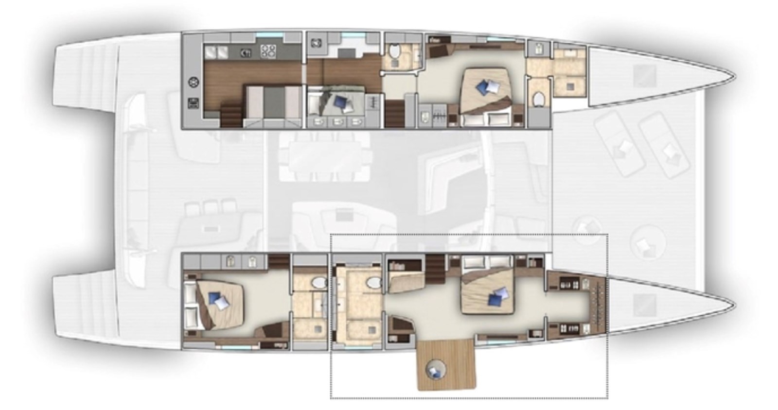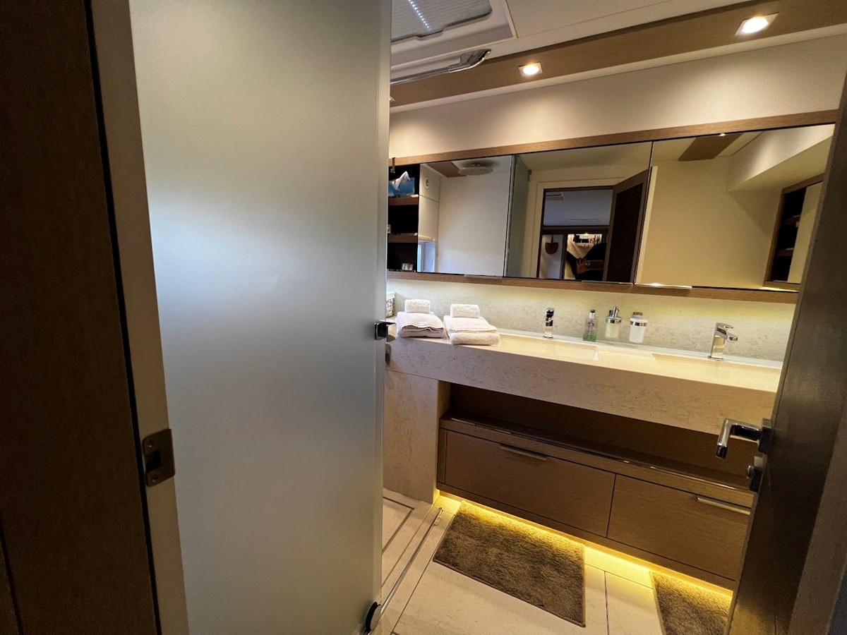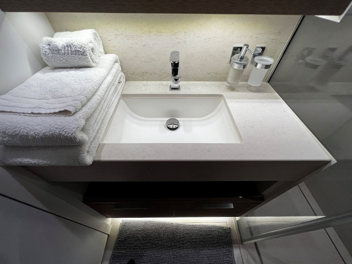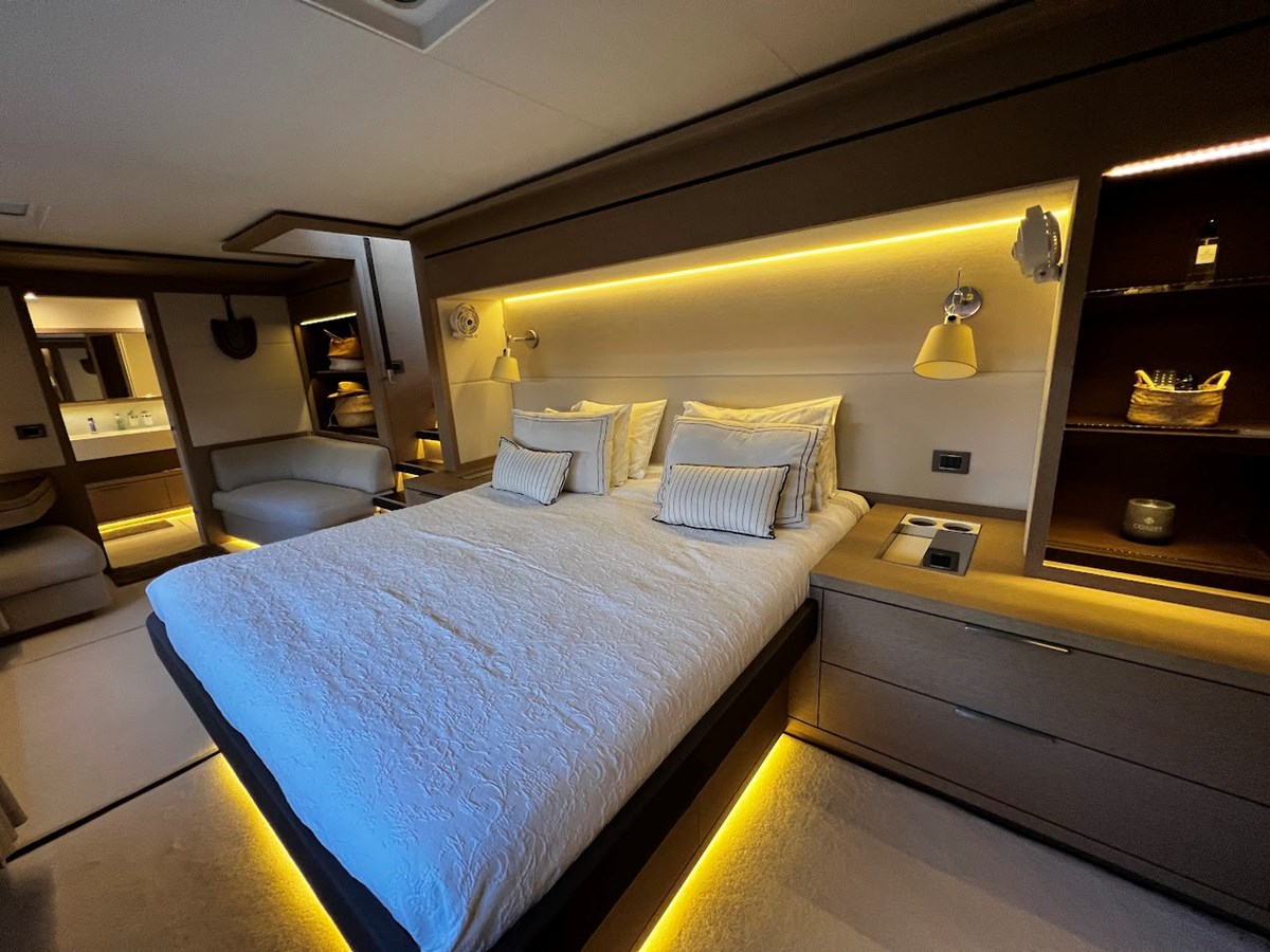 Two VIP cabins both feature queen berths all with private bathrooms. Her 36ft beam, provides such volume to her guests. In the fore deck is ideal for those how want to take in some sun. The space is epic!