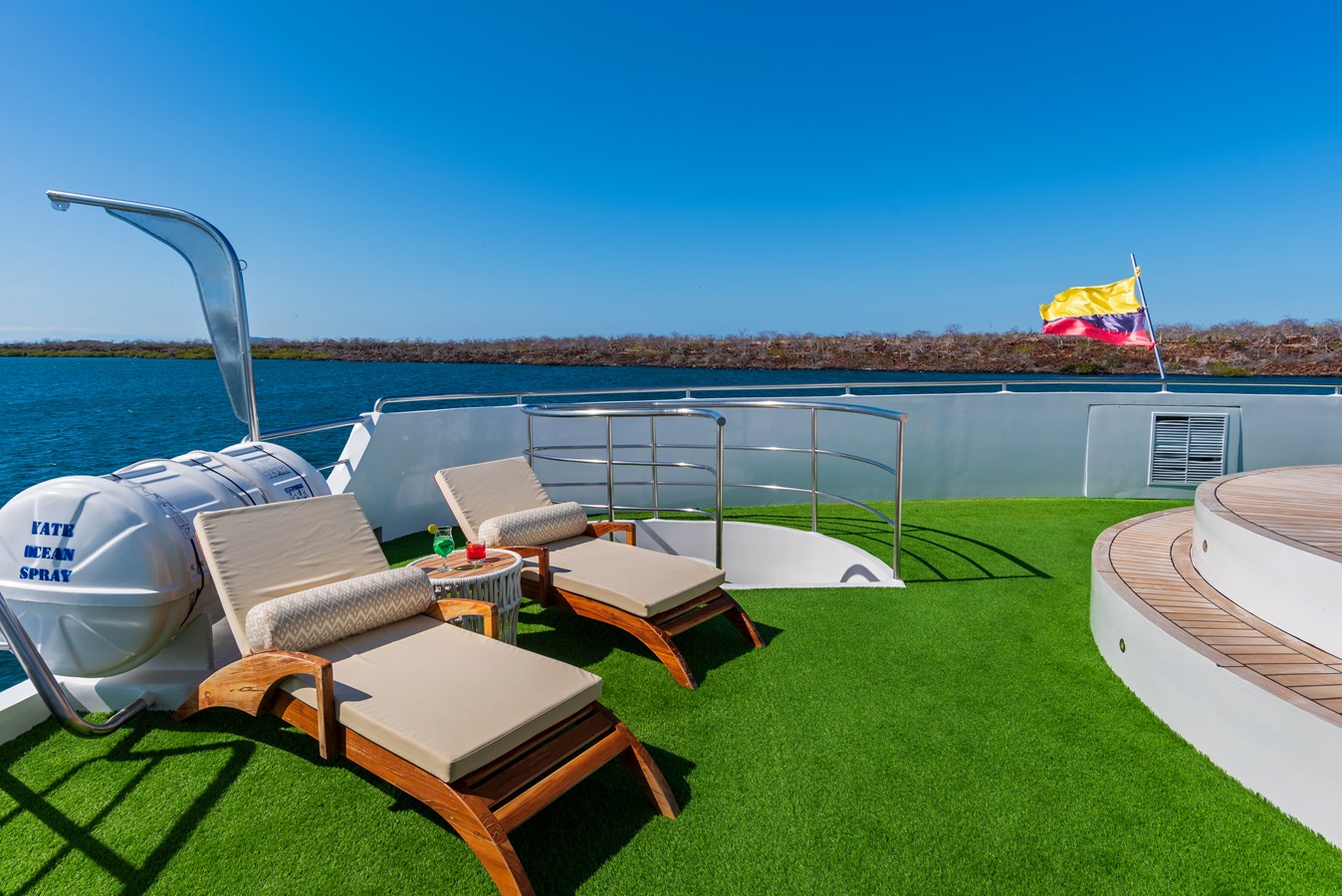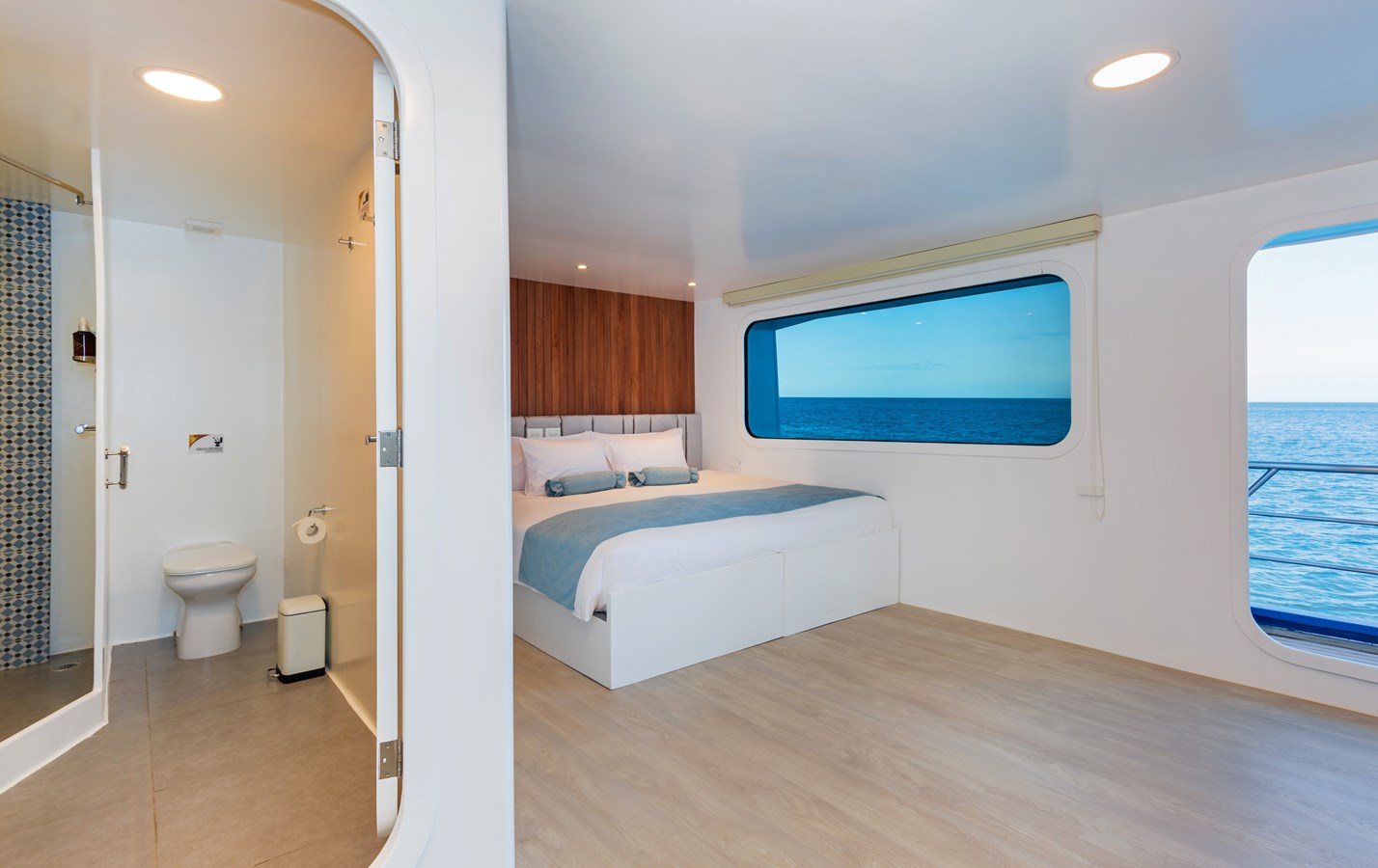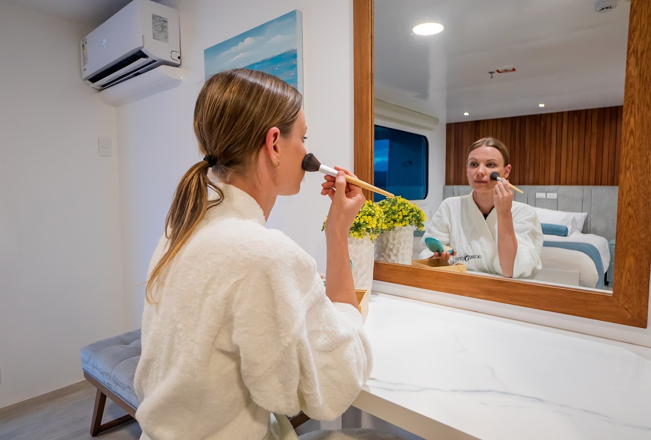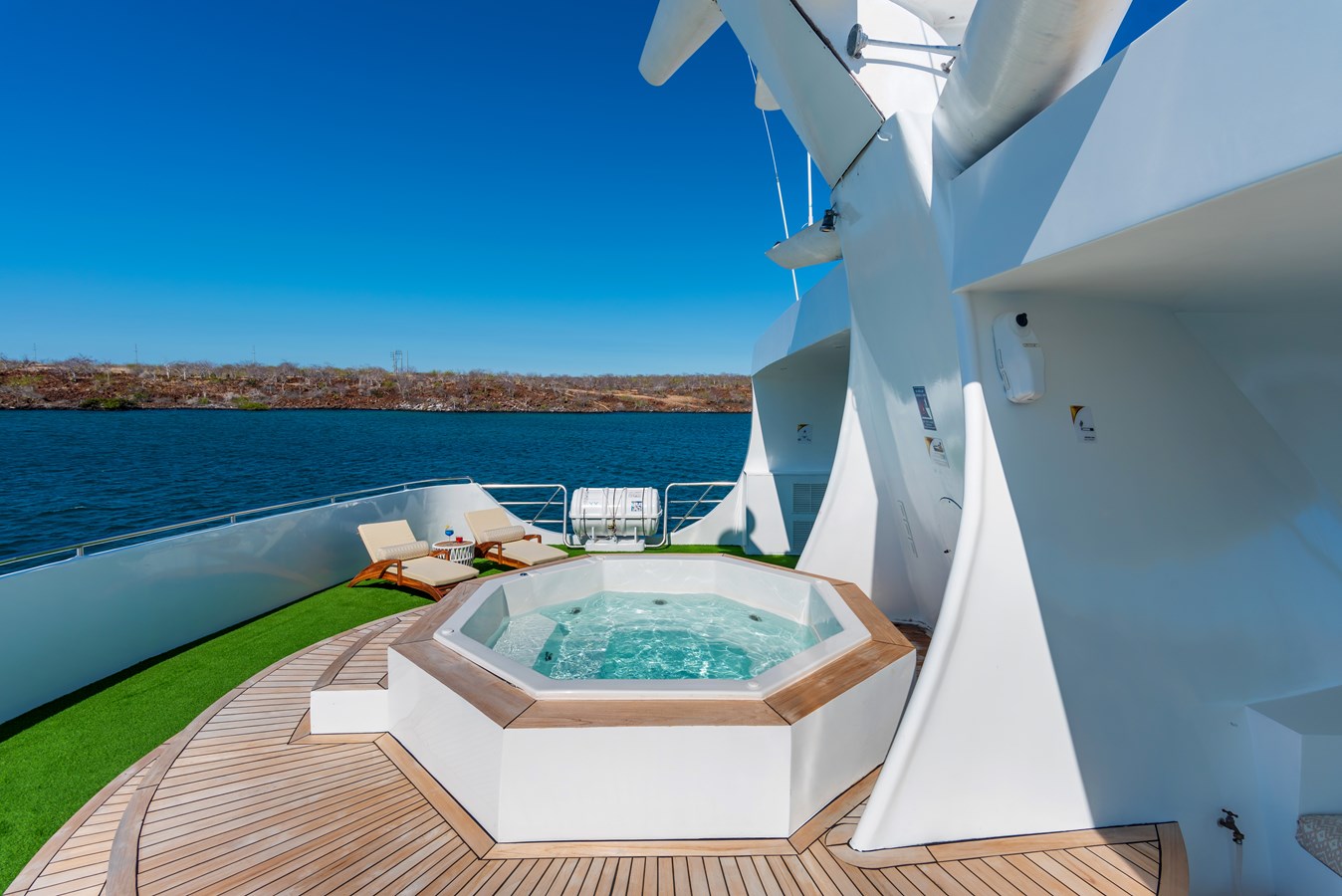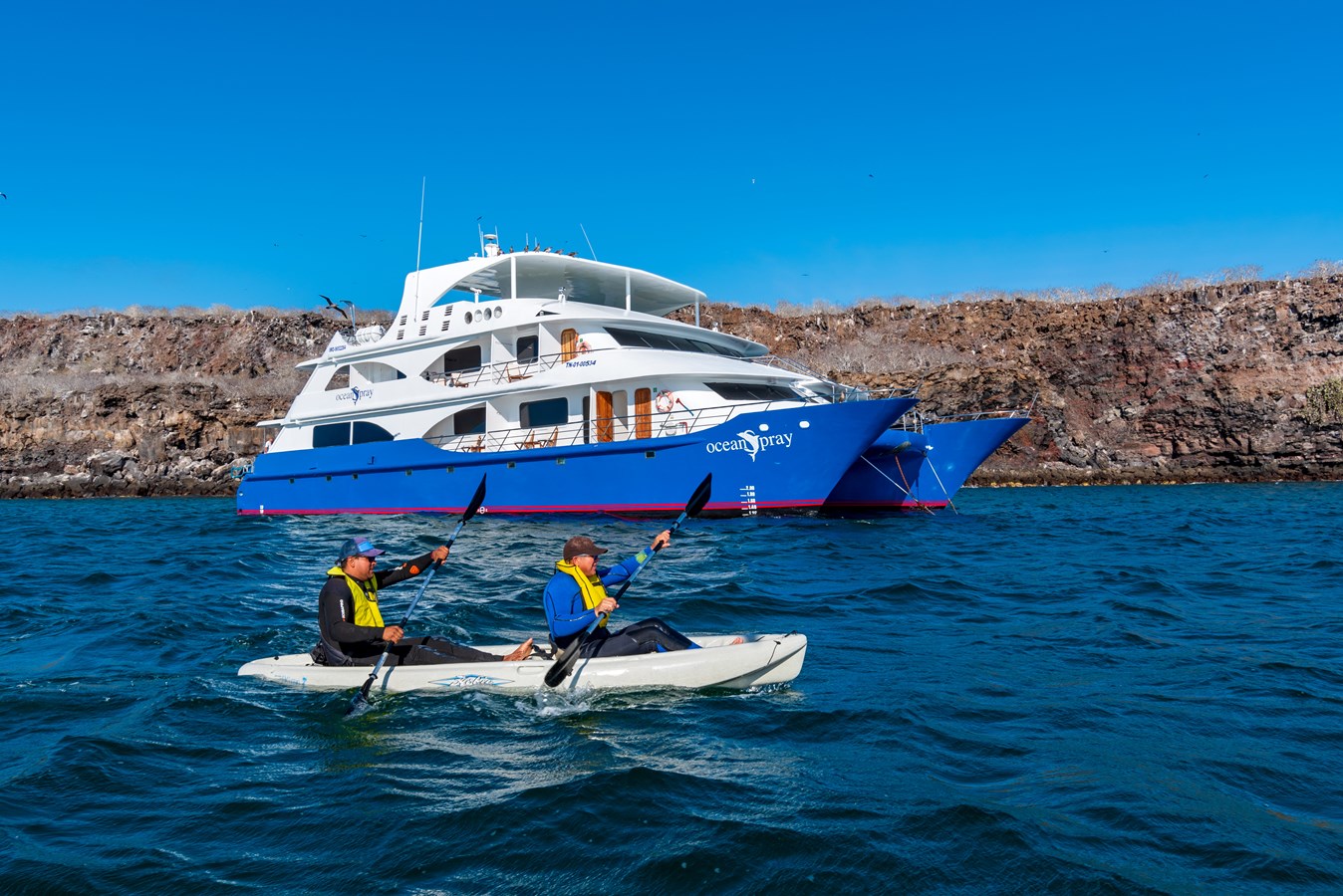 The classic catamaran Ocean Spray offers exceptional performance and comfort for cruising in the Galapagos. Its elegant design includes a spacious shaded sundeck with a Jacuzzi and sun chairs, providing guests with the perfect place to relax while on board. Each of the spacious cabins features a private balcony, enhancing the comfort and luxury of your Galapagos cruise experience. Ocean Spray’s impressive speed, top-notch guides, and well-planned itineraries make it an ideal choice for exploring the Galapagos in style. Kayaks and paddleboards are also available for guests to use, adding to the adventure.