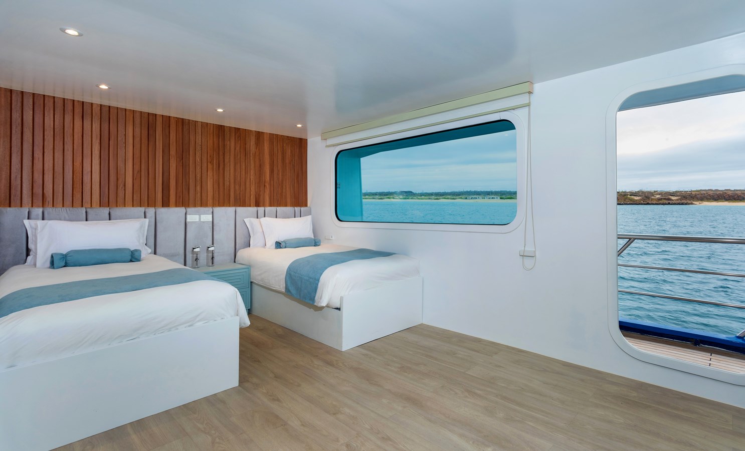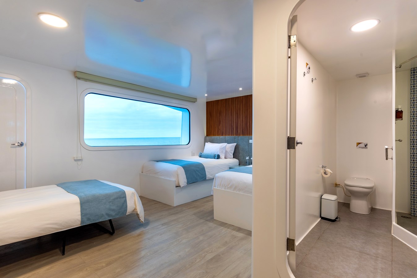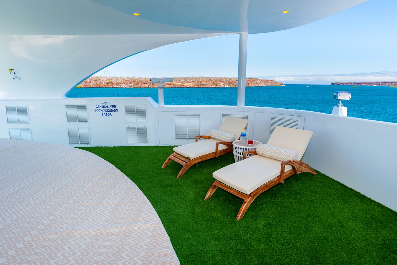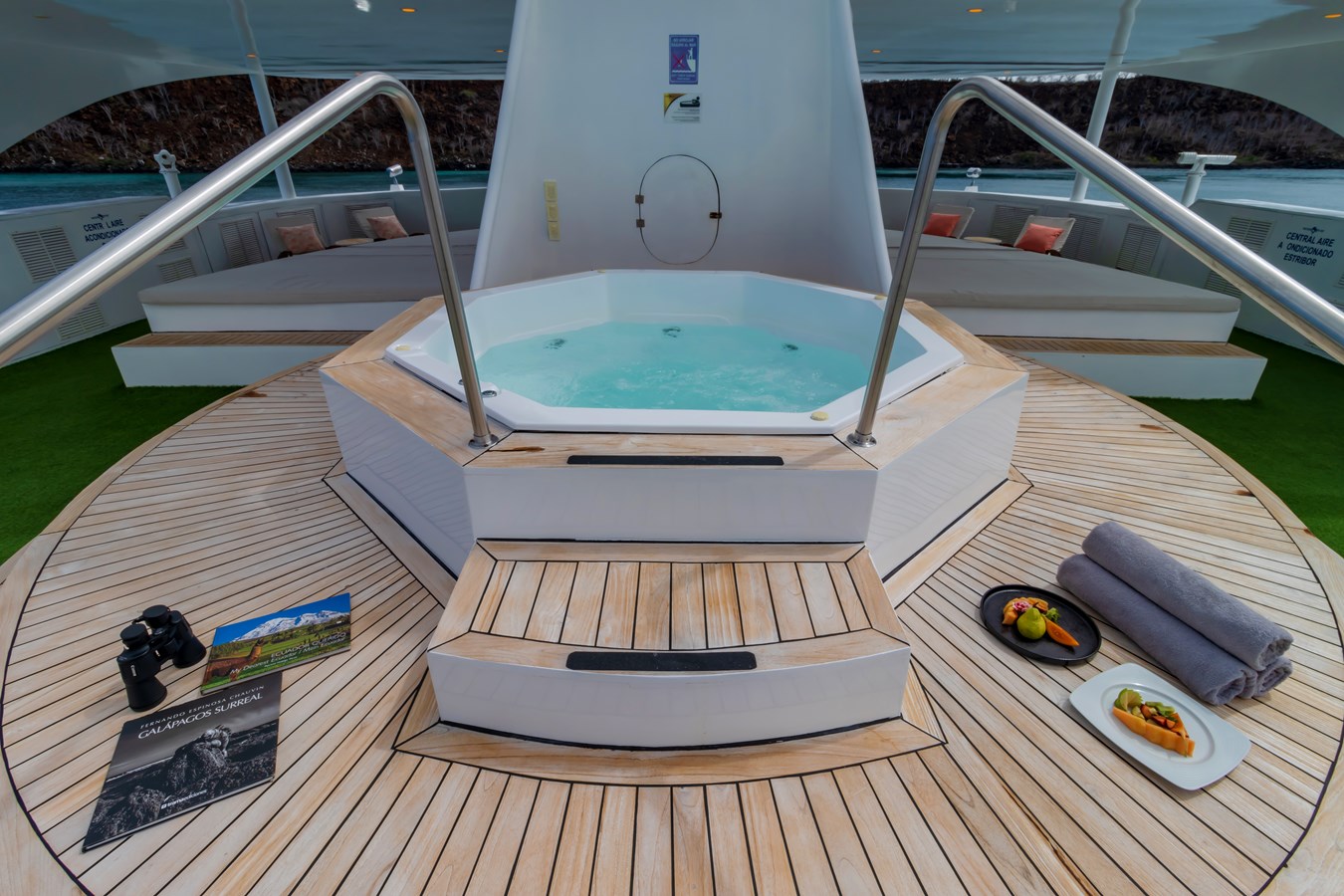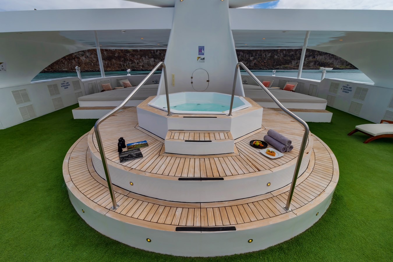 The classic catamaran Ocean Spray offers exceptional performance and comfort for cruising in the Galapagos. Its elegant design includes a spacious shaded sundeck with a Jacuzzi and sun chairs, providing guests with the perfect place to relax while on board. Each of the spacious cabins features a private balcony, enhancing the comfort and luxury of your Galapagos cruise experience. Ocean Spray’s impressive speed, top-notch guides, and well-planned itineraries make it an ideal choice for exploring the Galapagos in style. Kayaks and paddleboards are also available for guests to use, adding to the adventure.