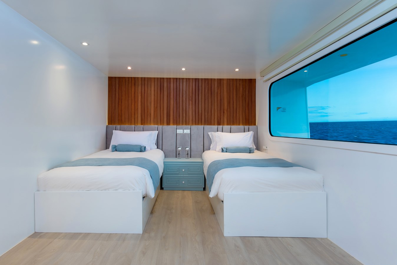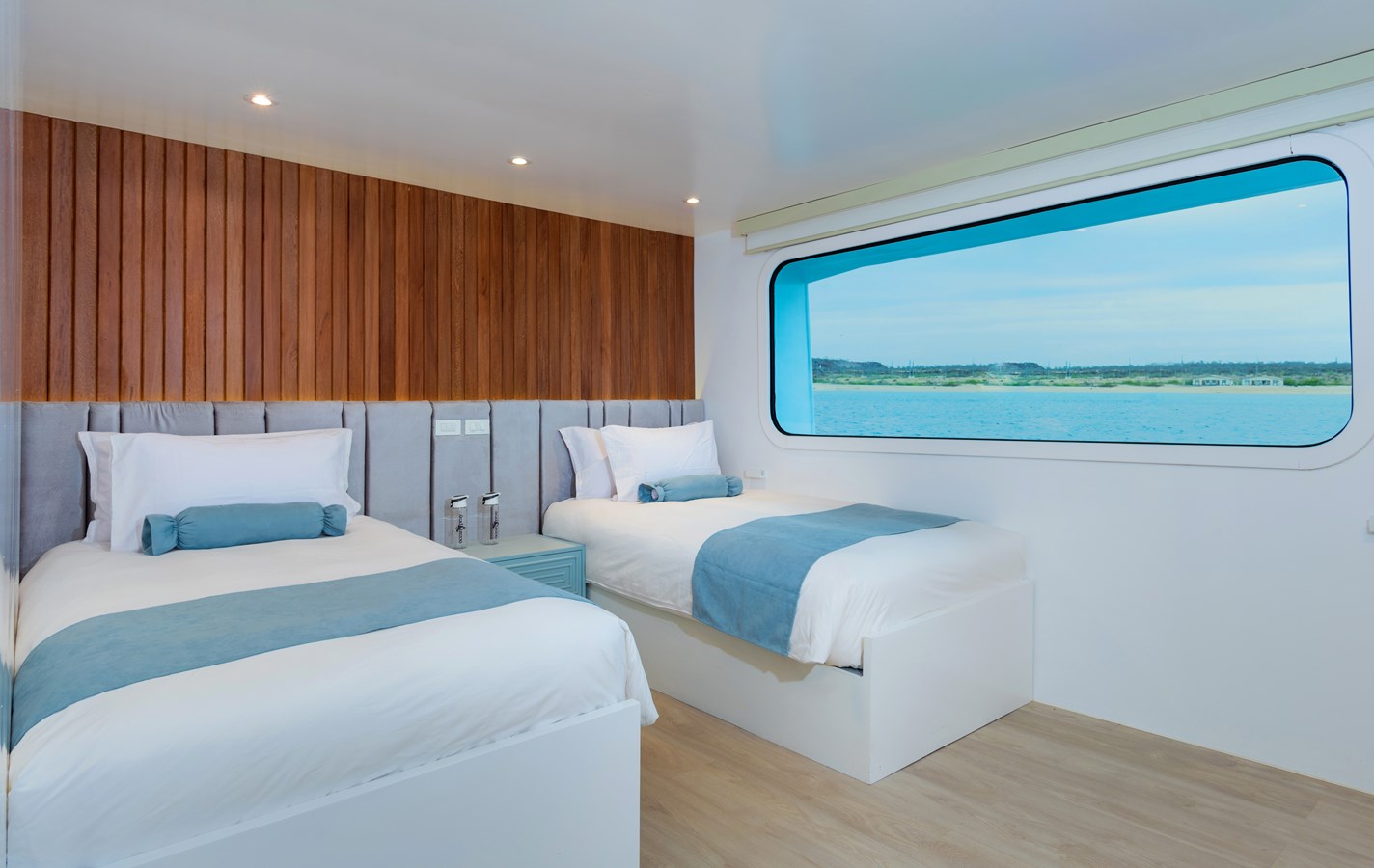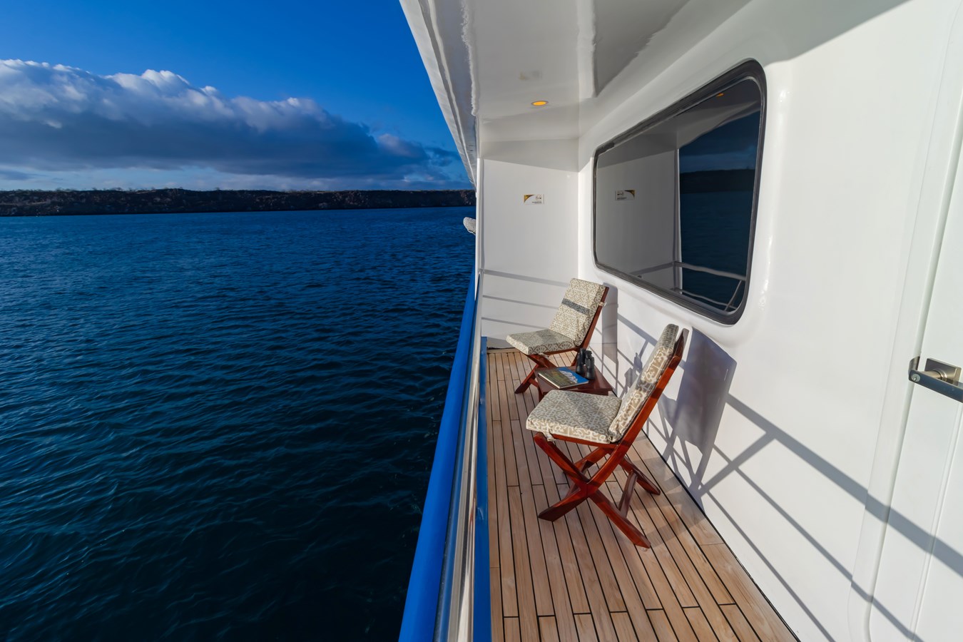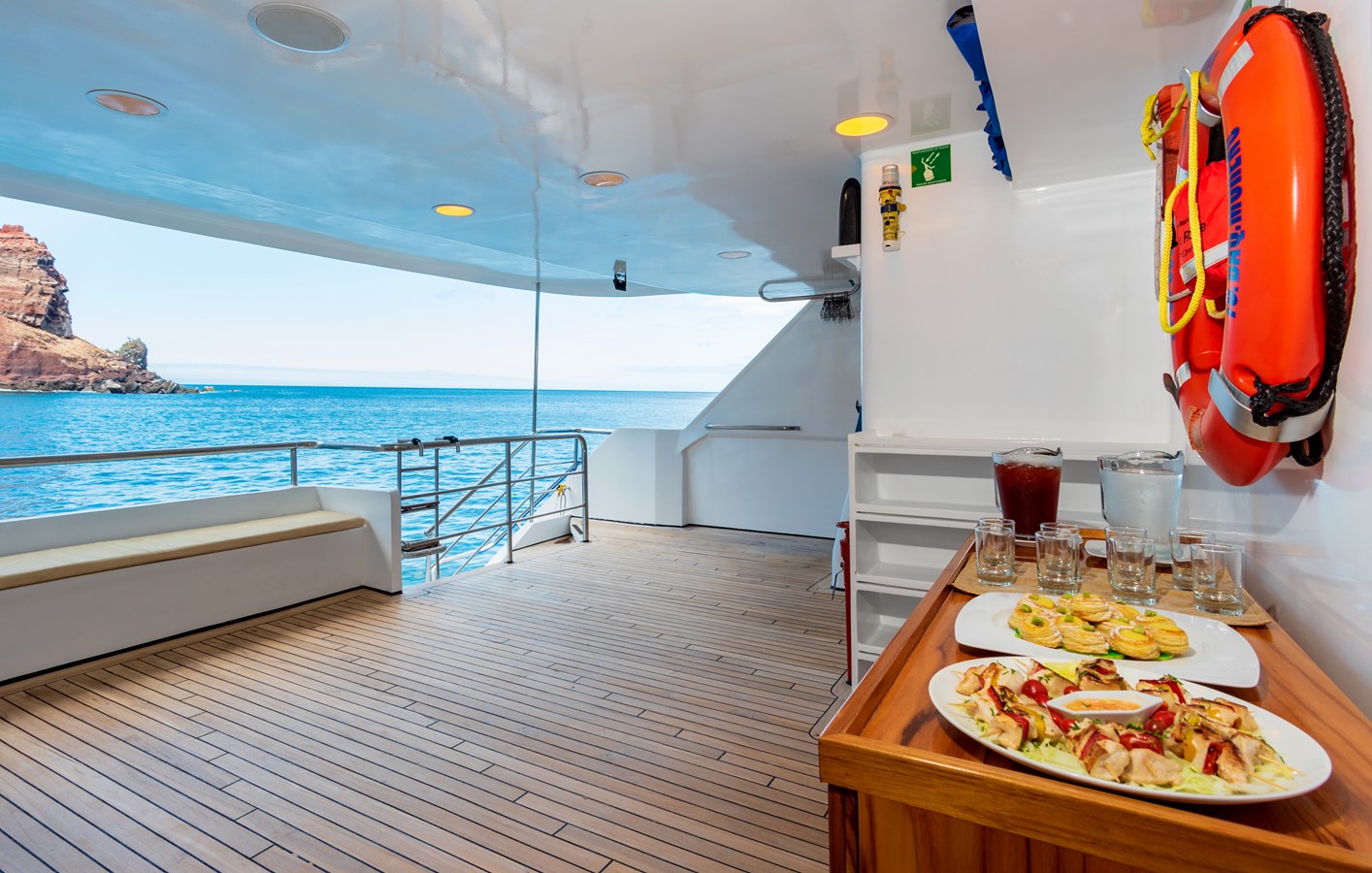 The classic catamaran Ocean Spray offers exceptional performance and comfort for cruising in the Galapagos. Its elegant design includes a spacious shaded sundeck with a Jacuzzi and sun chairs, providing guests with the perfect place to relax while on board. Each of the spacious cabins features a private balcony, enhancing the comfort and luxury of your Galapagos cruise experience. Ocean Spray’s impressive speed, top-notch guides, and well-planned itineraries make it an ideal choice for exploring the Galapagos in style. Kayaks and paddleboards are also available for guests to use, adding to the adventure.