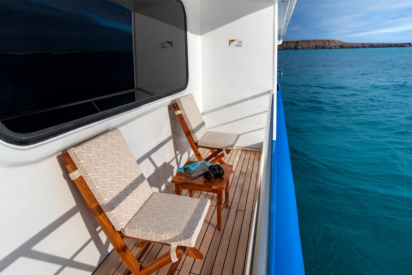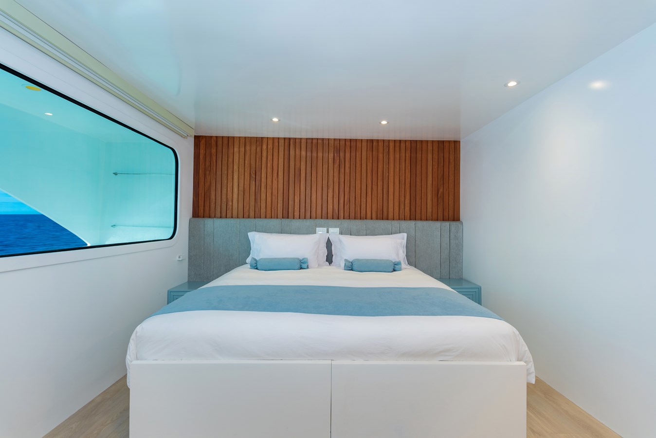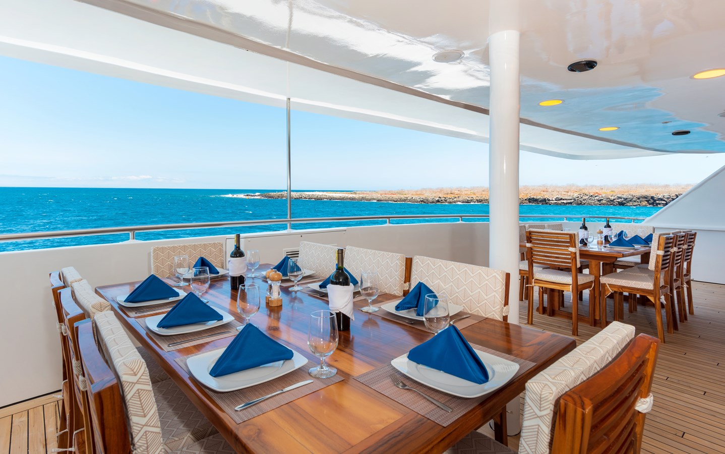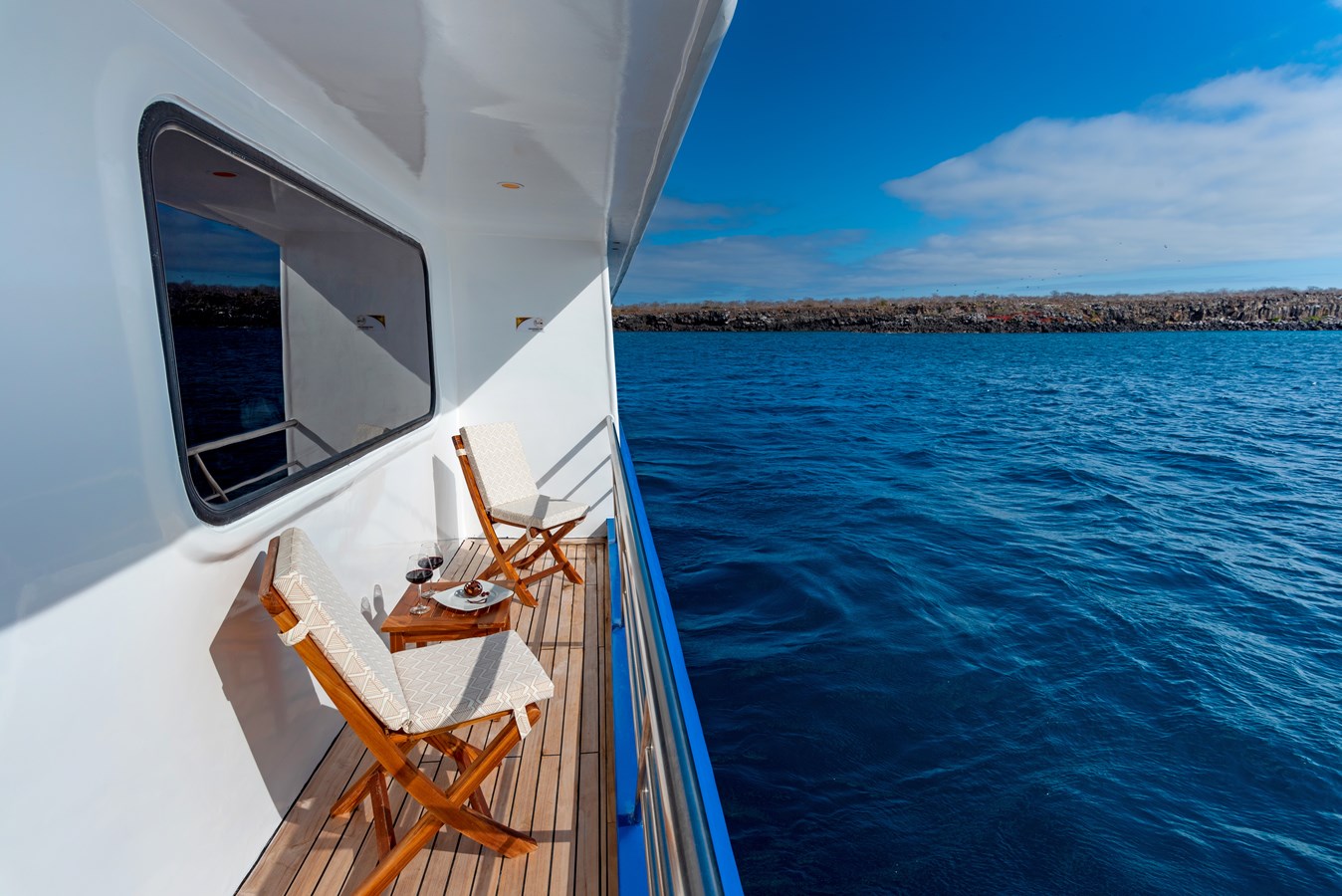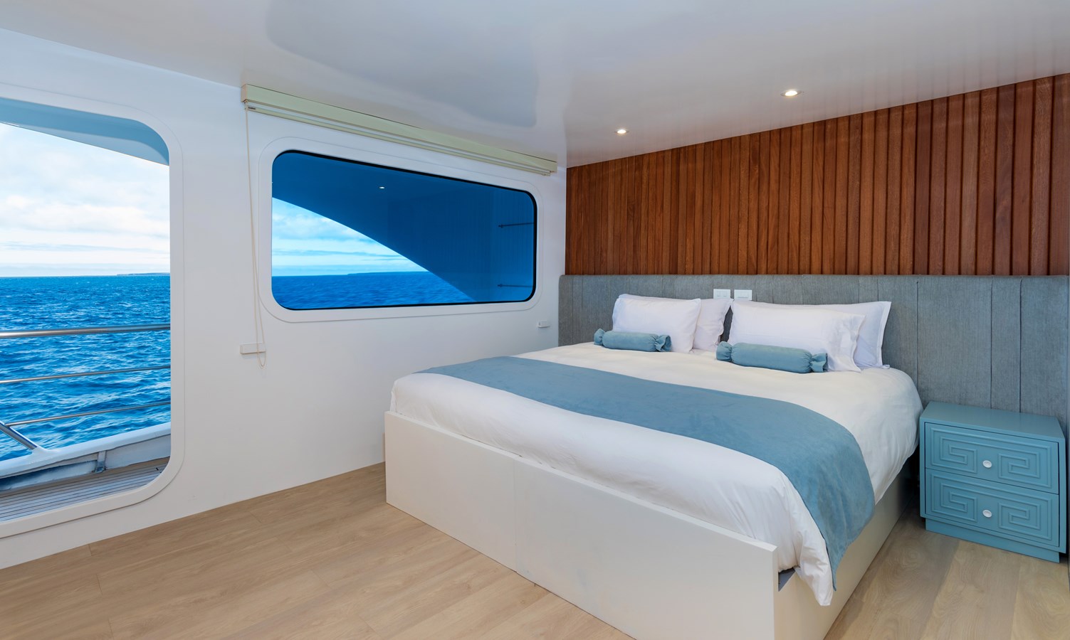 The classic catamaran Ocean Spray offers exceptional performance and comfort for cruising in the Galapagos. Its elegant design includes a spacious shaded sundeck with a Jacuzzi and sun chairs, providing guests with the perfect place to relax while on board. Each of the spacious cabins features a private balcony, enhancing the comfort and luxury of your Galapagos cruise experience. Ocean Spray’s impressive speed, top-notch guides, and well-planned itineraries make it an ideal choice for exploring the Galapagos in style. Kayaks and paddleboards are also available for guests to use, adding to the adventure.