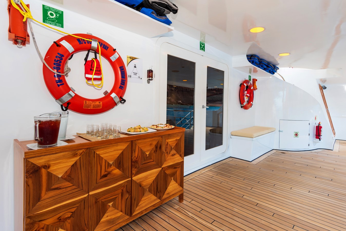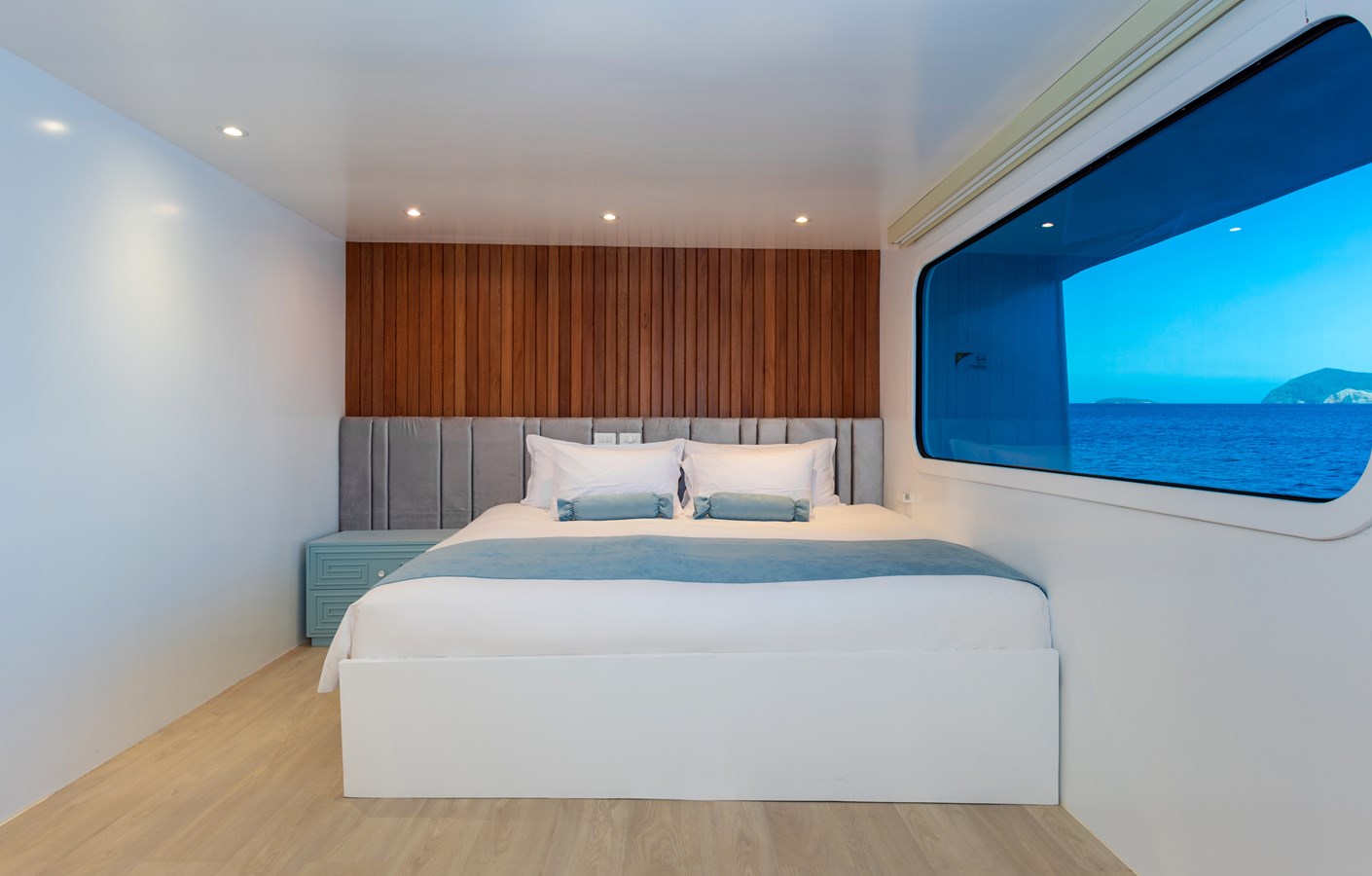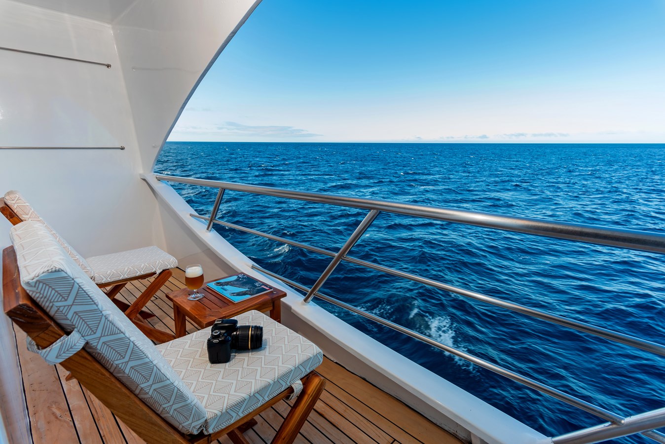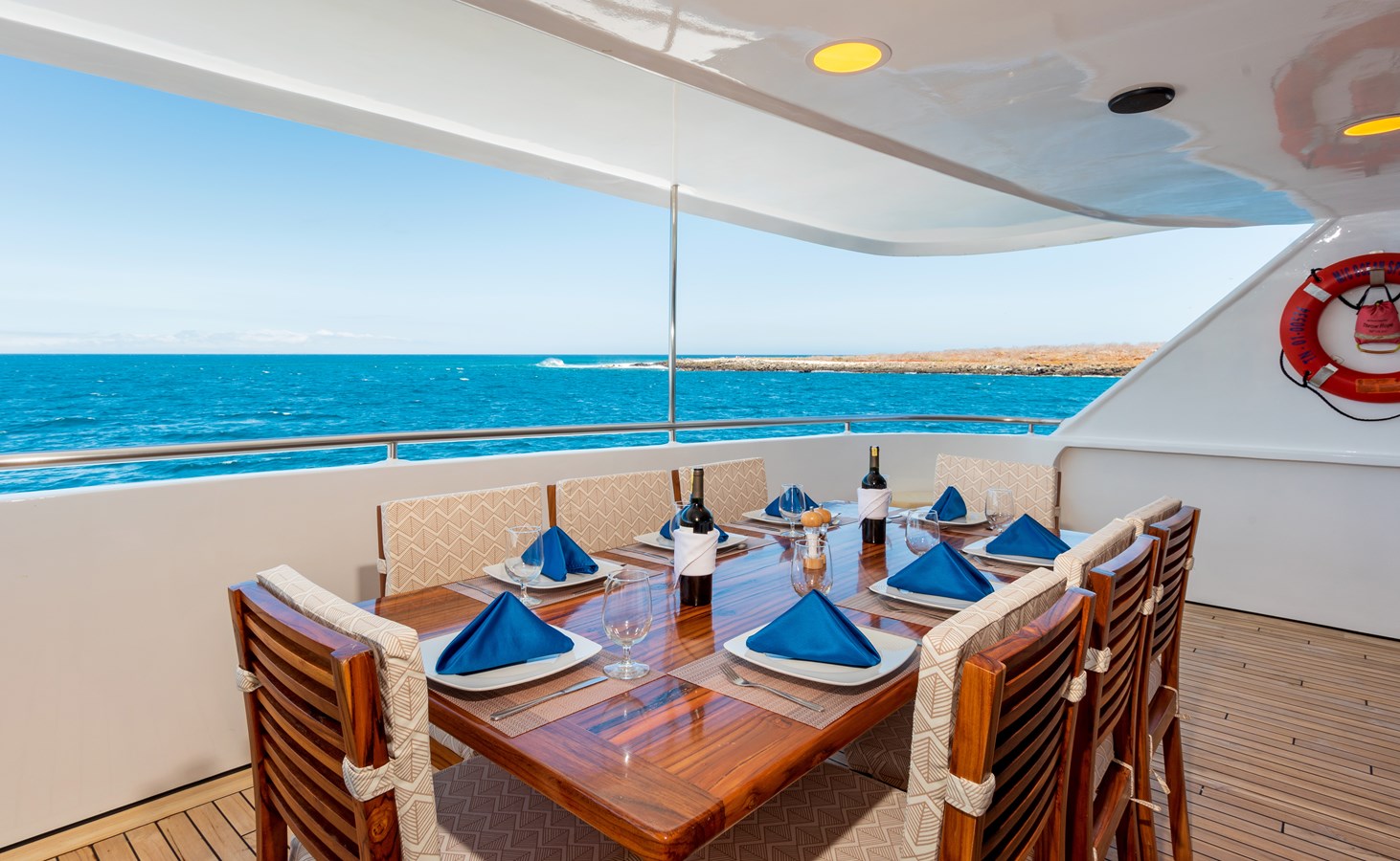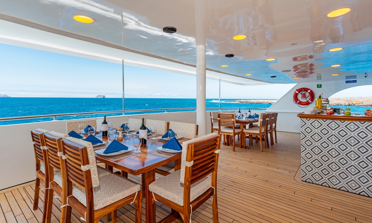 The classic catamaran Ocean Spray offers exceptional performance and comfort for cruising in the Galapagos. Its elegant design includes a spacious shaded sundeck with a Jacuzzi and sun chairs, providing guests with the perfect place to relax while on board. Each of the spacious cabins features a private balcony, enhancing the comfort and luxury of your Galapagos cruise experience. Ocean Spray’s impressive speed, top-notch guides, and well-planned itineraries make it an ideal choice for exploring the Galapagos in style. Kayaks and paddleboards are also available for guests to use, adding to the adventure.