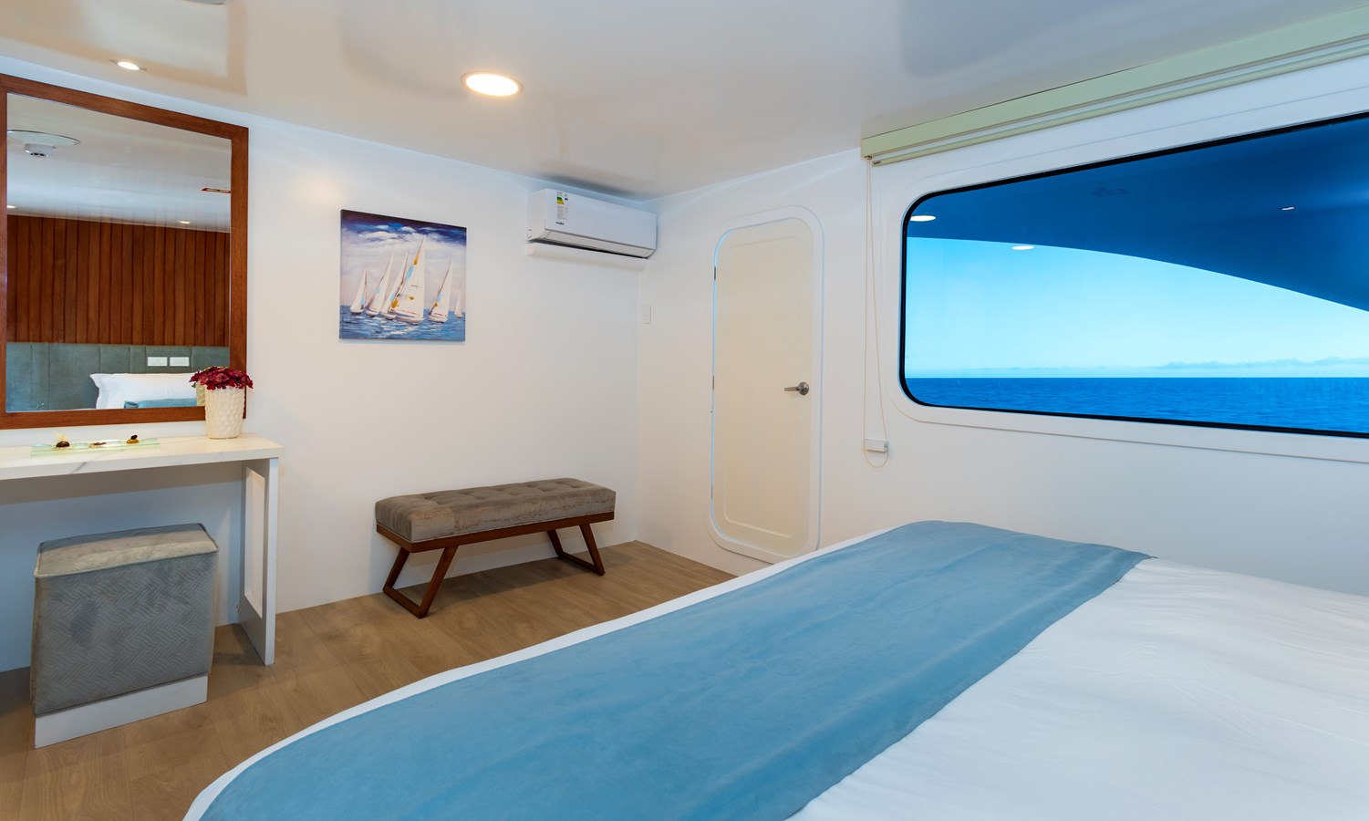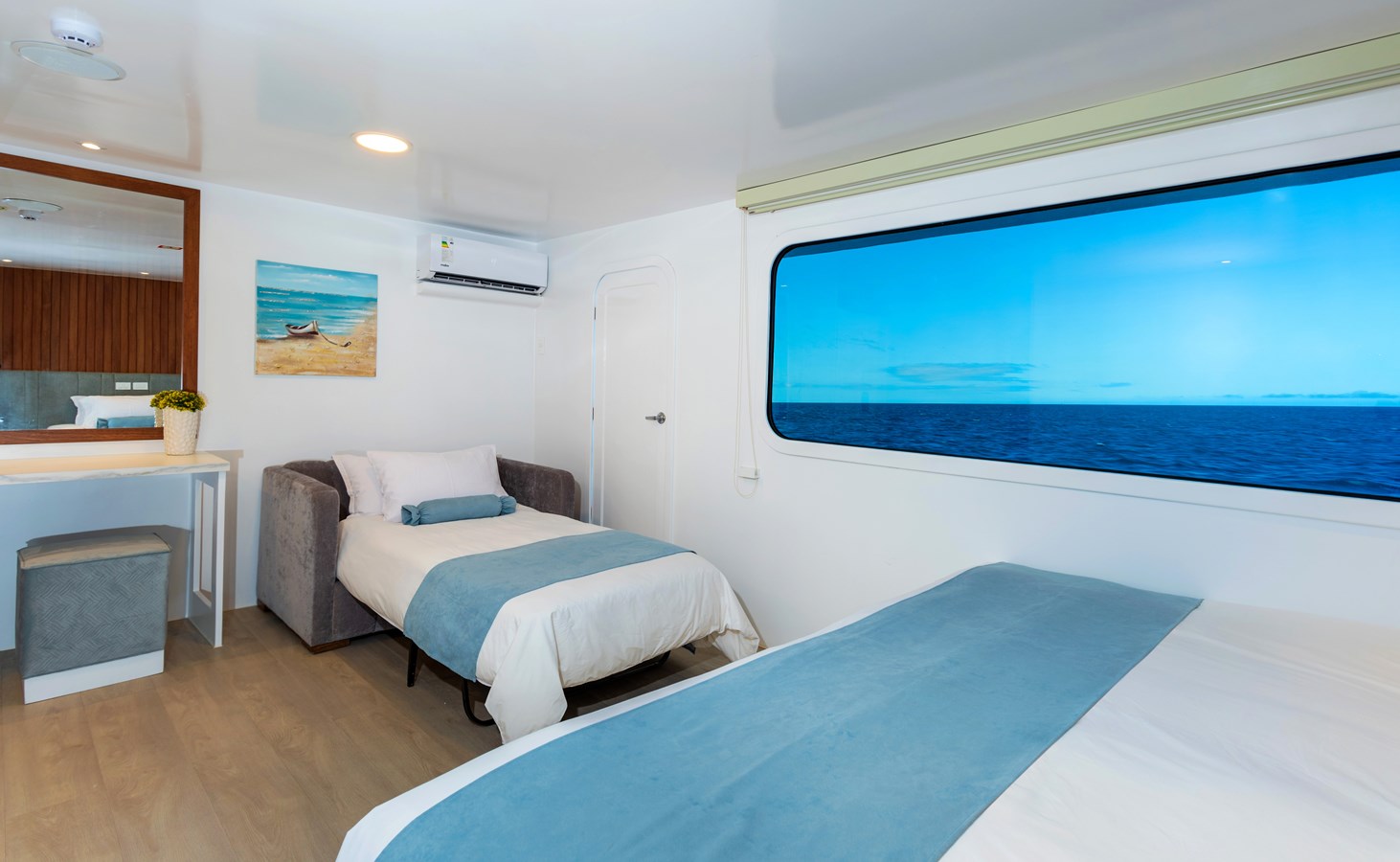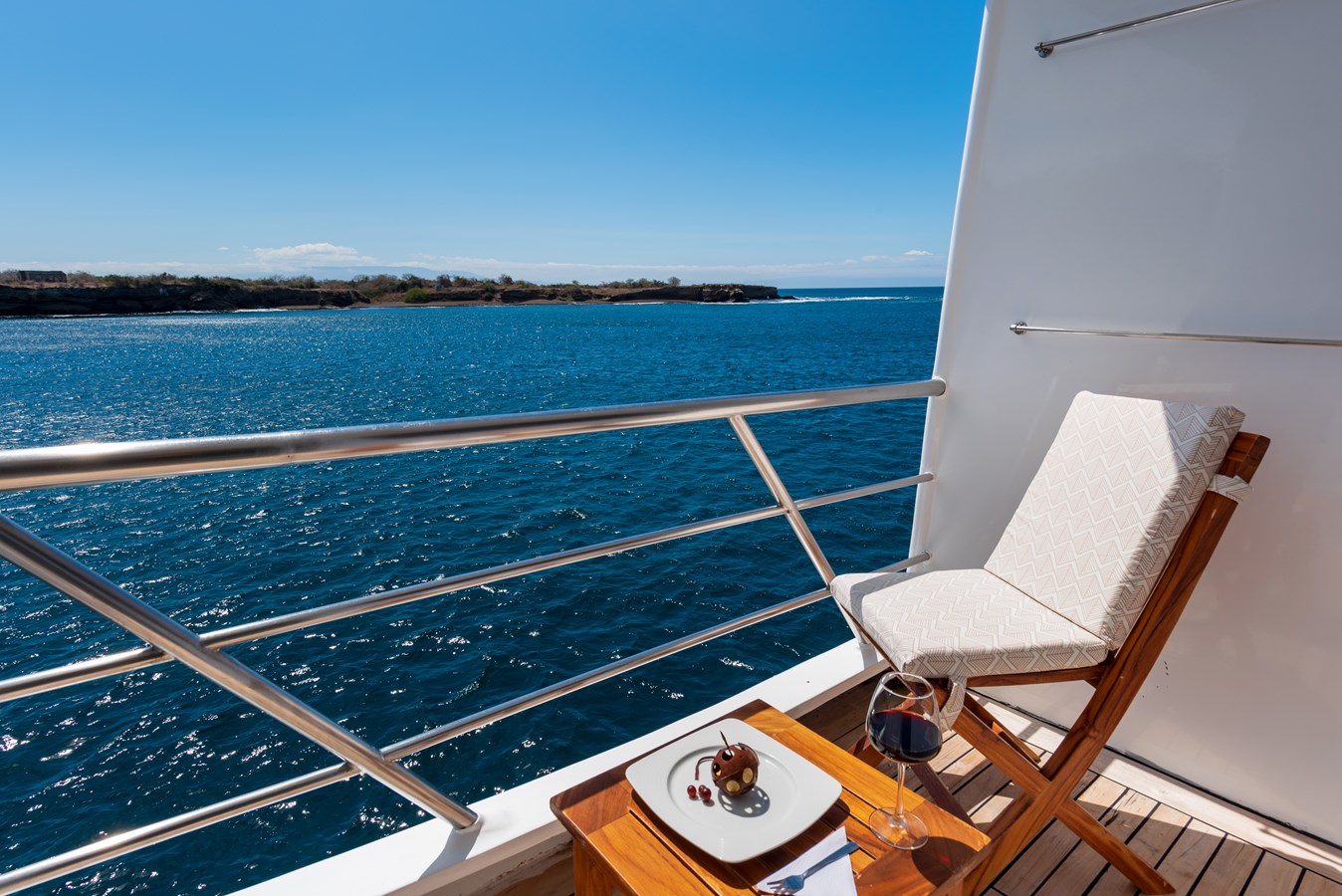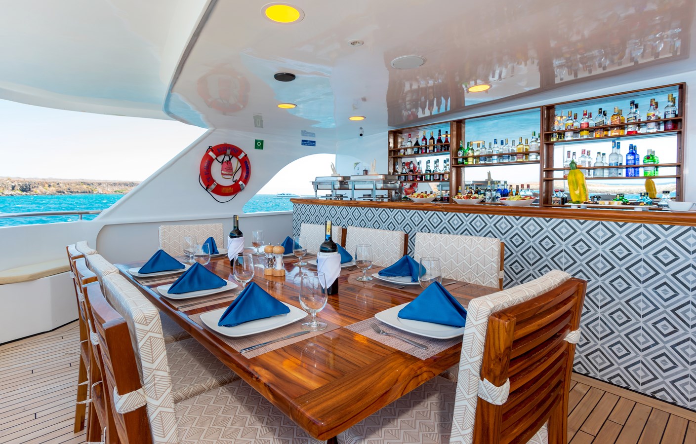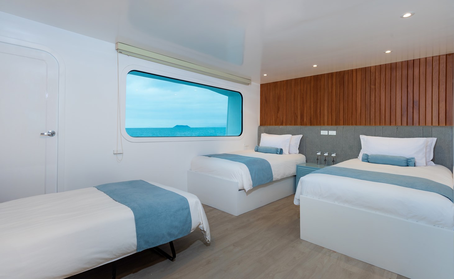 The classic catamaran Ocean Spray offers exceptional performance and comfort for cruising in the Galapagos. Its elegant design includes a spacious shaded sundeck with a Jacuzzi and sun chairs, providing guests with the perfect place to relax while on board. Each of the spacious cabins features a private balcony, enhancing the comfort and luxury of your Galapagos cruise experience. Ocean Spray’s impressive speed, top-notch guides, and well-planned itineraries make it an ideal choice for exploring the Galapagos in style. Kayaks and paddleboards are also available for guests to use, adding to the adventure.