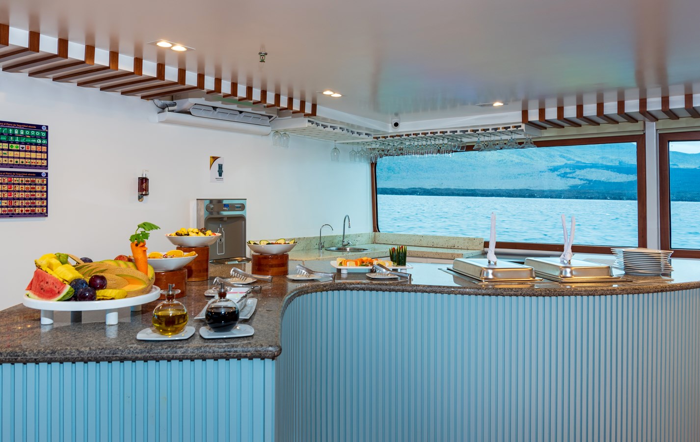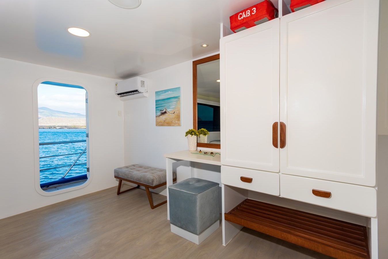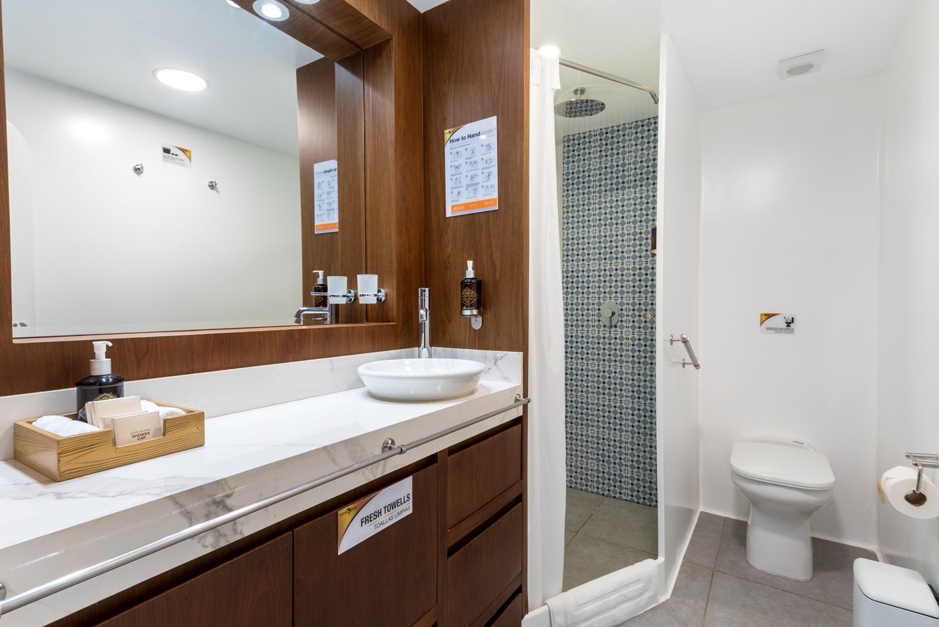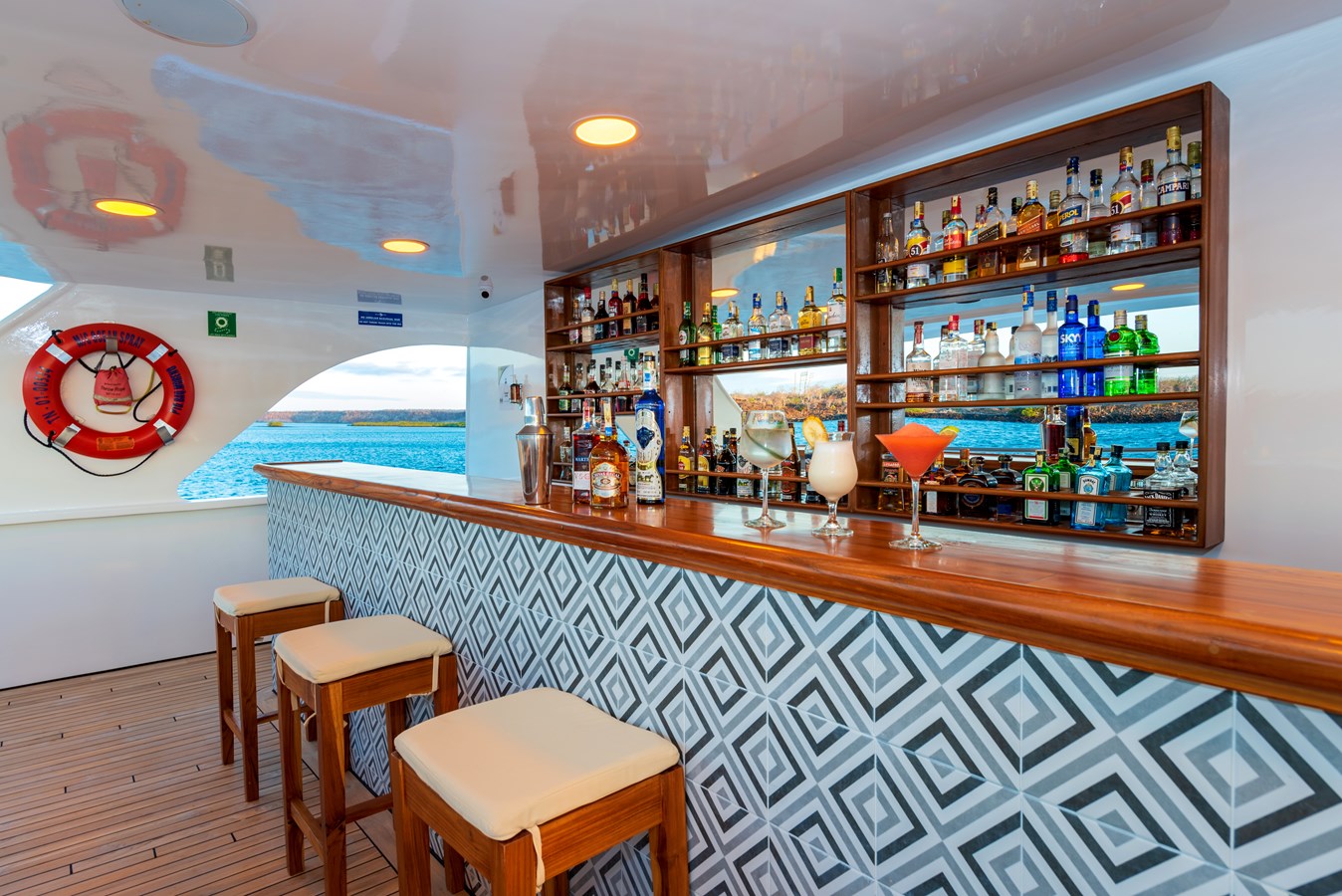 The classic catamaran Ocean Spray offers exceptional performance and comfort for cruising in the Galapagos. Its elegant design includes a spacious shaded sundeck with a Jacuzzi and sun chairs, providing guests with the perfect place to relax while on board. Each of the spacious cabins features a private balcony, enhancing the comfort and luxury of your Galapagos cruise experience. Ocean Spray’s impressive speed, top-notch guides, and well-planned itineraries make it an ideal choice for exploring the Galapagos in style. Kayaks and paddleboards are also available for guests to use, adding to the adventure.