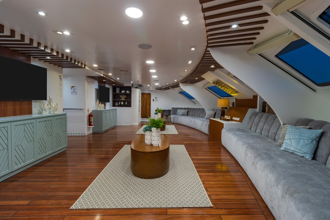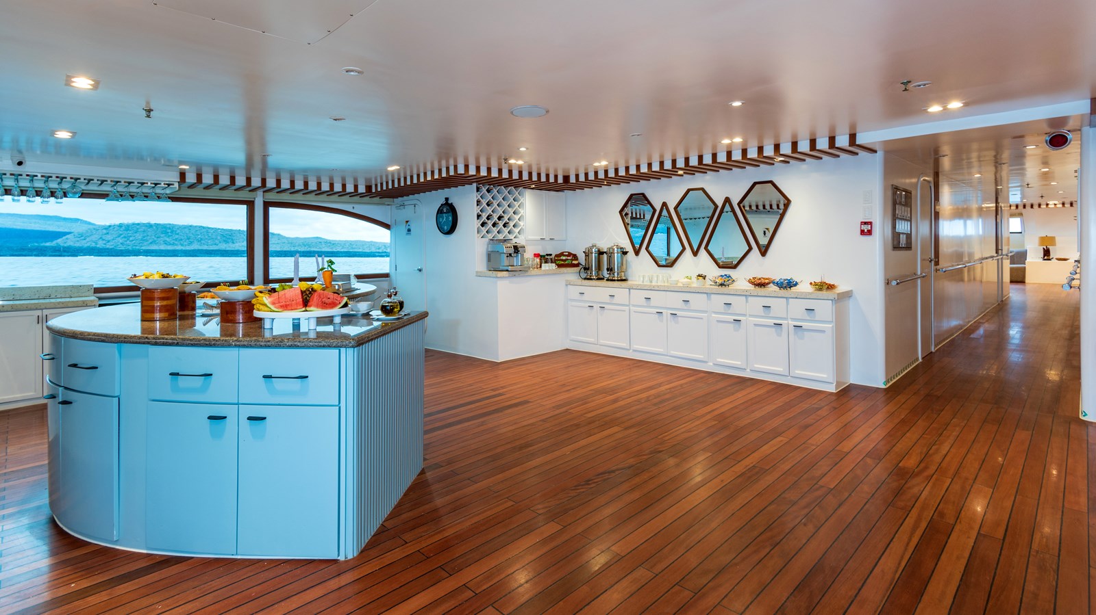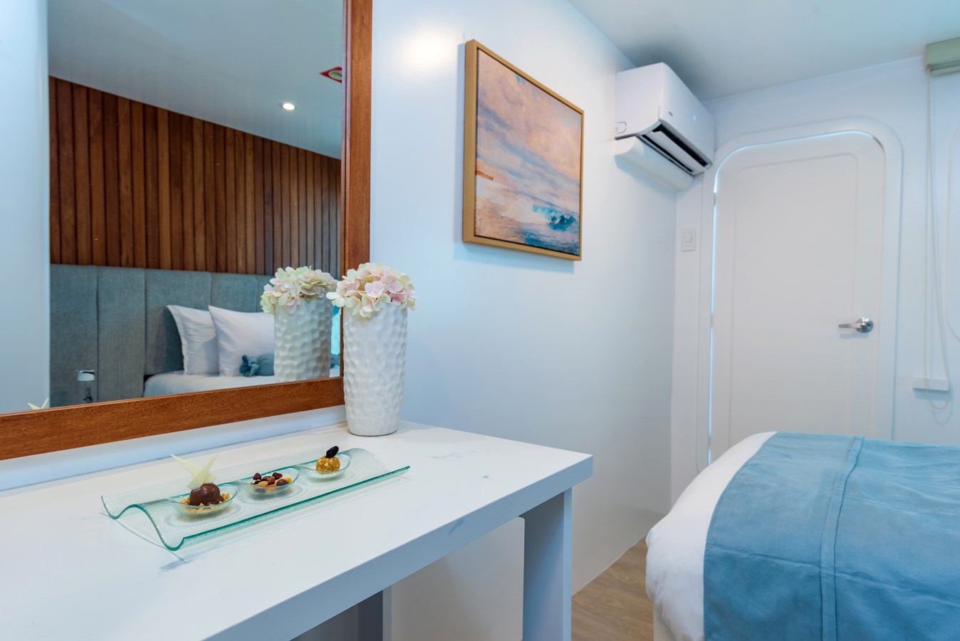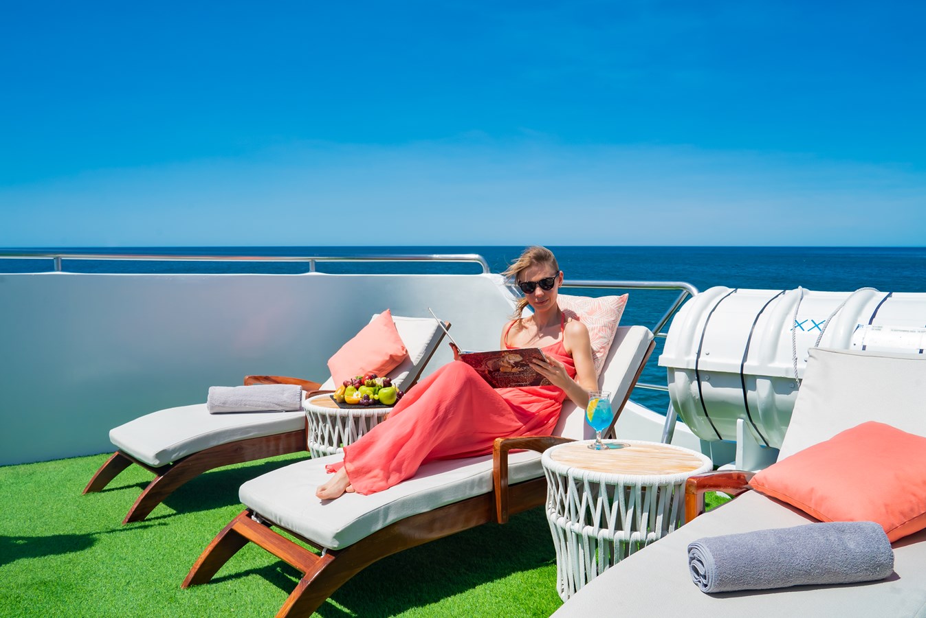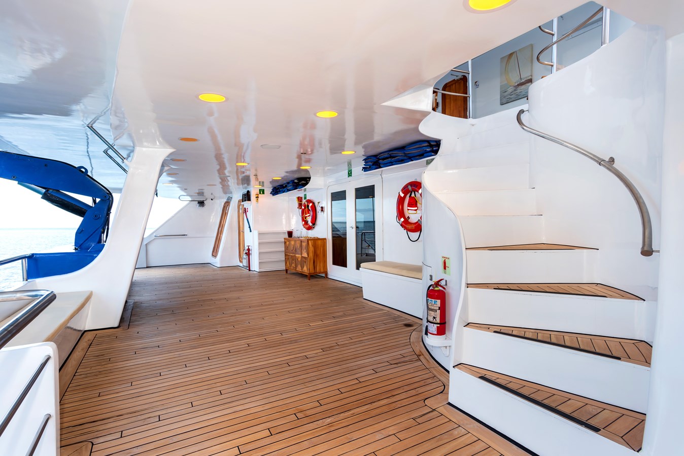 The classic catamaran Ocean Spray offers exceptional performance and comfort for cruising in the Galapagos. Its elegant design includes a spacious shaded sundeck with a Jacuzzi and sun chairs, providing guests with the perfect place to relax while on board. Each of the spacious cabins features a private balcony, enhancing the comfort and luxury of your Galapagos cruise experience. Ocean Spray’s impressive speed, top-notch guides, and well-planned itineraries make it an ideal choice for exploring the Galapagos in style. Kayaks and paddleboards are also available for guests to use, adding to the adventure.