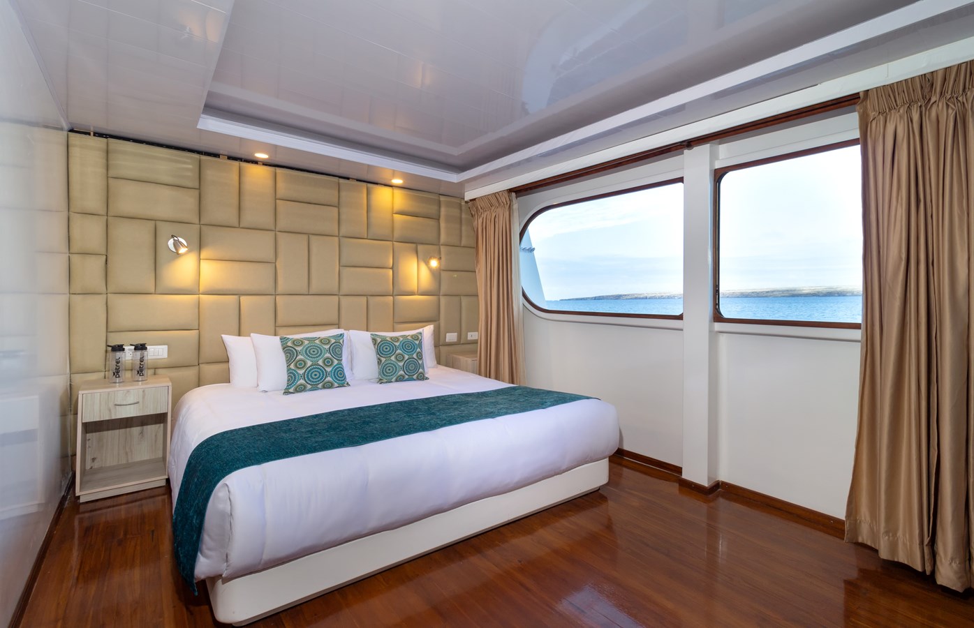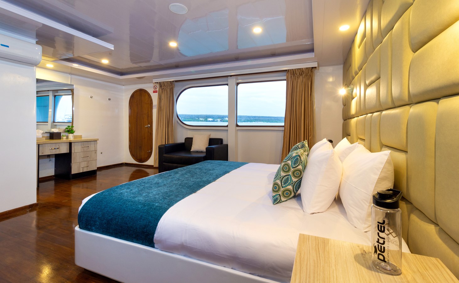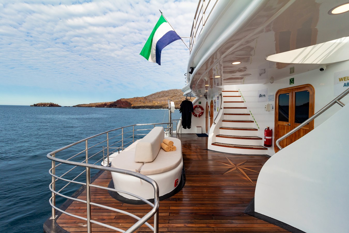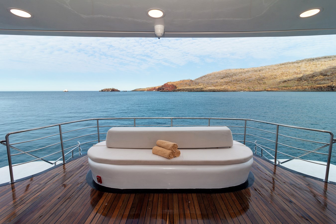 Upper Deck: On the Upper Deck, there are 4 spacious staterooms, each with a private balcony and large windows, as well as a premium single cabin for solo travelers. The bridge of the M/C Petrel is also on this deck, and passengers can visit it and receive an explanation on the cutting-edge technology used for sailing by the Captain or First Officer. There is also a wildlife observation platform where there are comfortable sofas for watching the many wildlife species in the air and in the waters surrounding the catamaran. Lucky passengers may even spot dolphins, rays, sharks, and whales in the crystalline Galapagos waters!