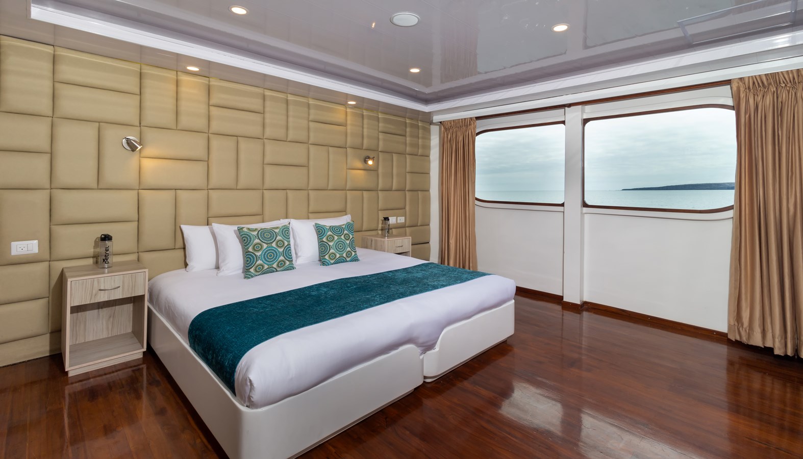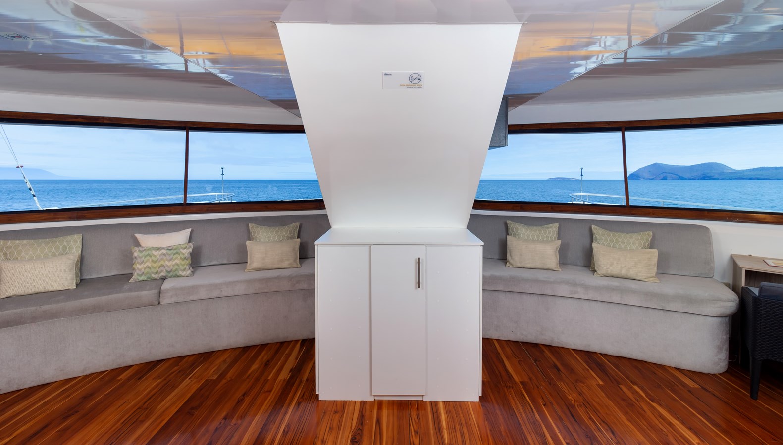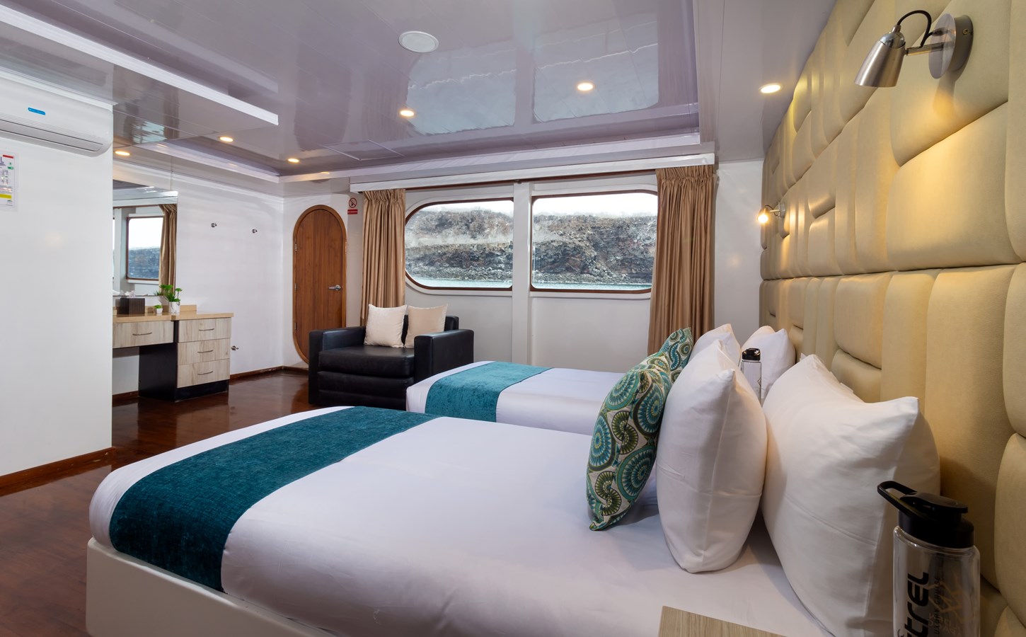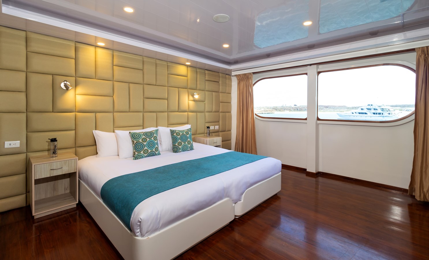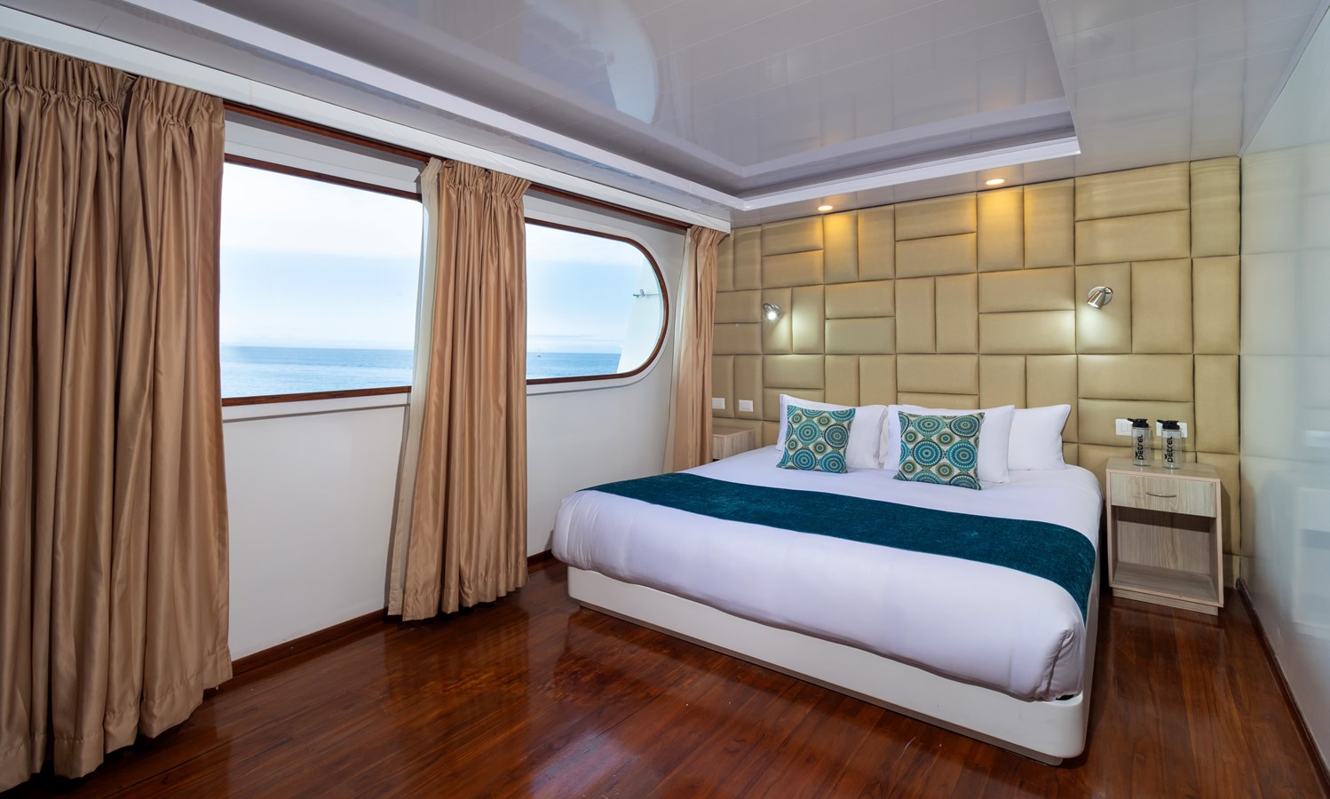 Upper Deck: On the Upper Deck, there are 4 spacious staterooms, each with a private balcony and large windows, as well as a premium single cabin for solo travelers. The bridge of the M/C Petrel is also on this deck, and passengers can visit it and receive an explanation on the cutting-edge technology used for sailing by the Captain or First Officer. There is also a wildlife observation platform where there are comfortable sofas for watching the many wildlife species in the air and in the waters surrounding the catamaran. Lucky passengers may even spot dolphins, rays, sharks, and whales in the crystalline Galapagos waters!
