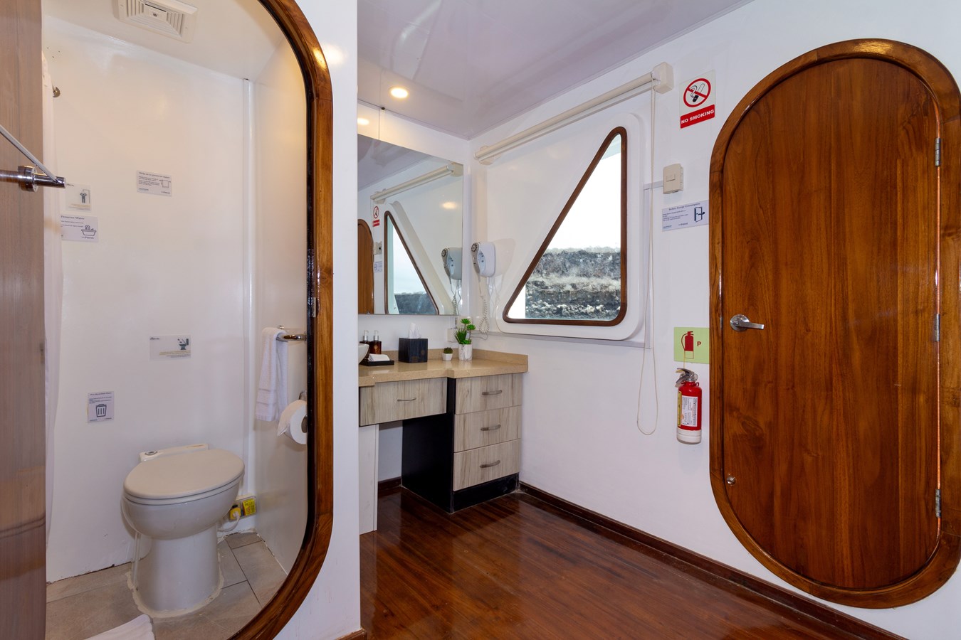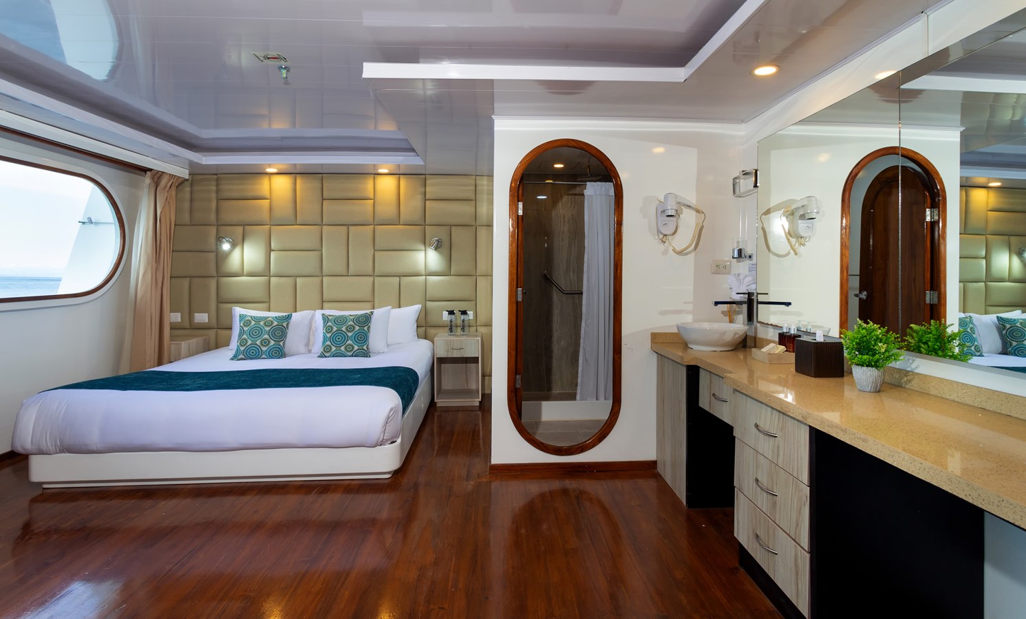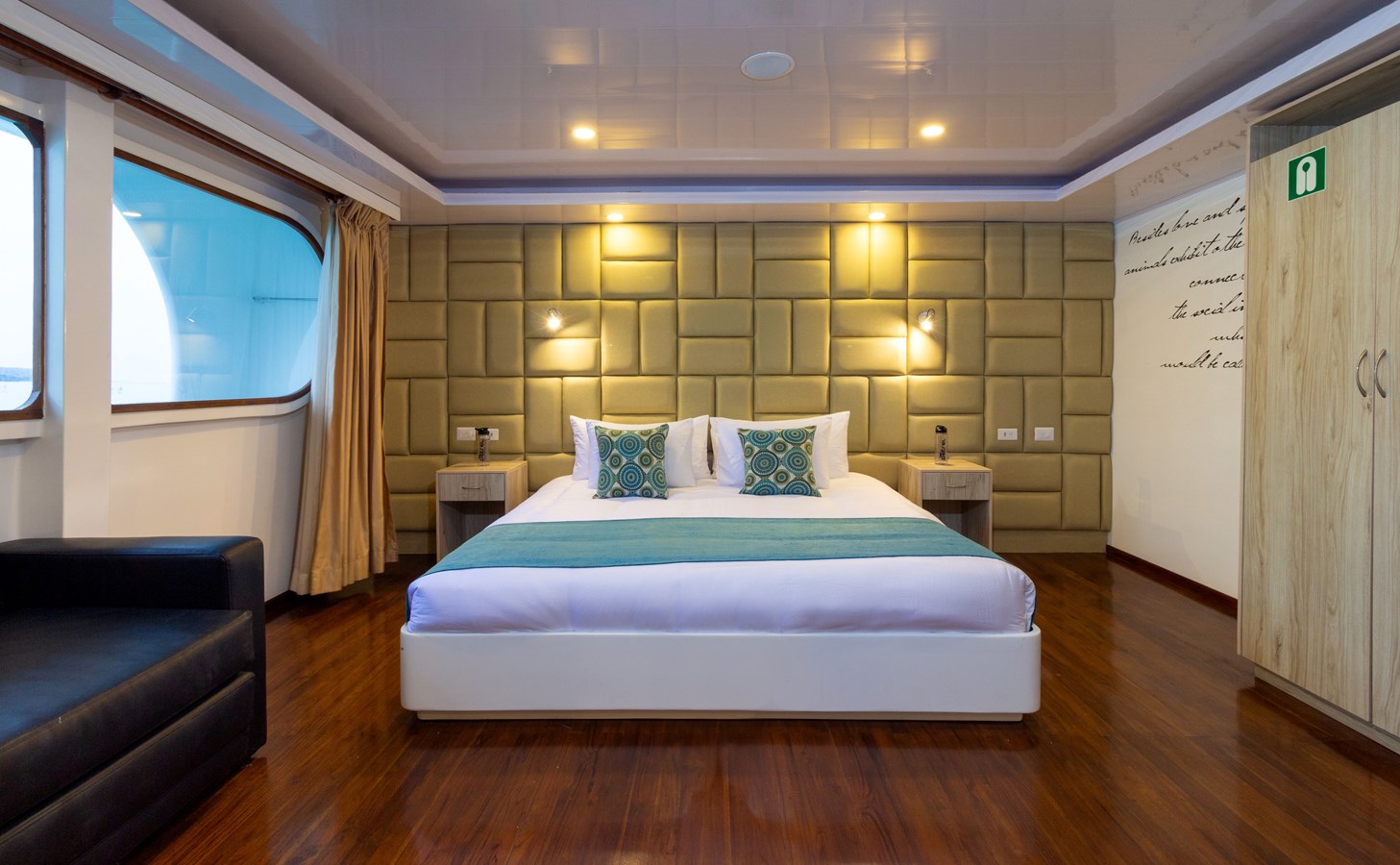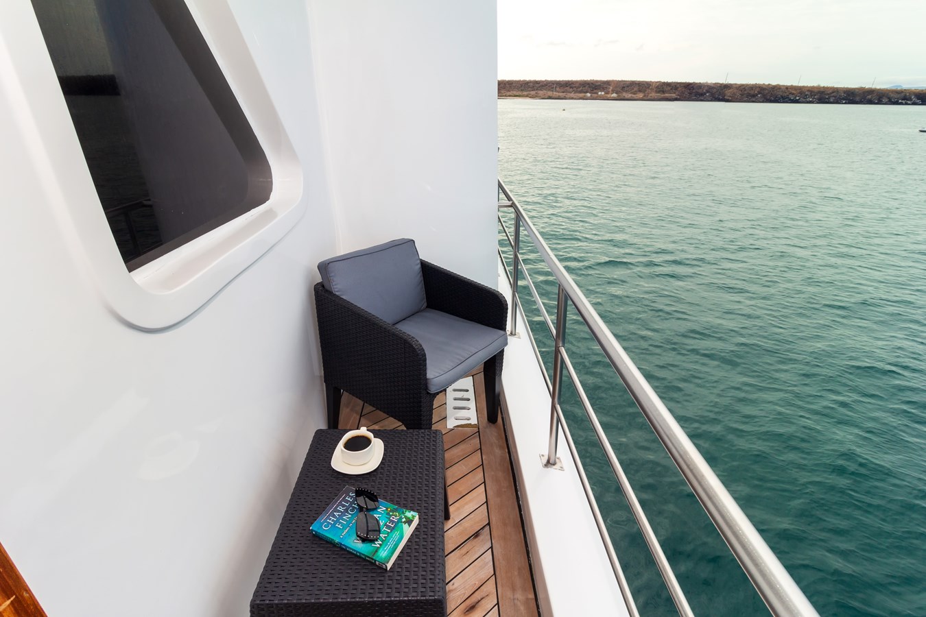 Upper Deck: On the Upper Deck, there are 4 spacious staterooms, each with a private balcony and large windows, as well as a premium single cabin for solo travelers. The bridge of the M/C Petrel is also on this deck, and passengers can visit it and receive an explanation on the cutting-edge technology used for sailing by the Captain or First Officer. There is also a wildlife observation platform where there are comfortable sofas for watching the many wildlife species in the air and in the waters surrounding the catamaran. Lucky passengers may even spot dolphins, rays, sharks, and whales in the crystalline Galapagos waters!
