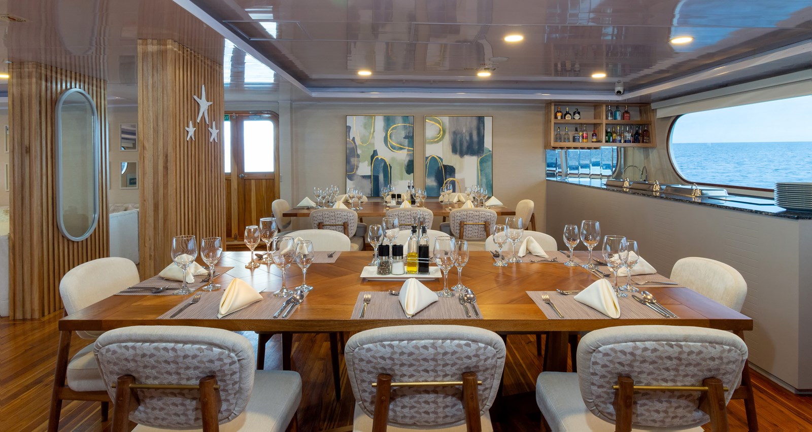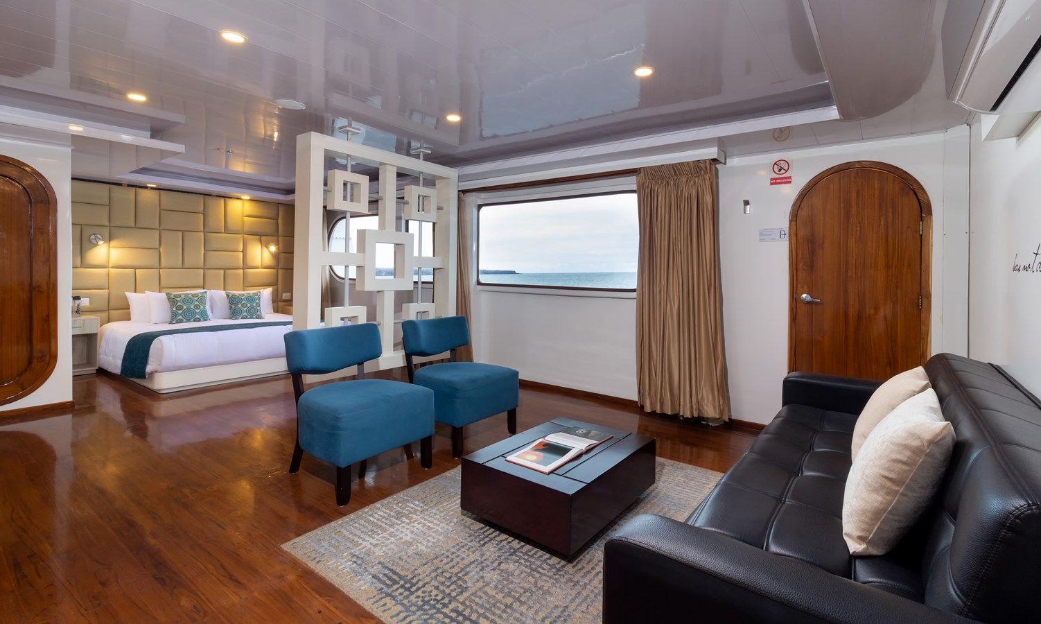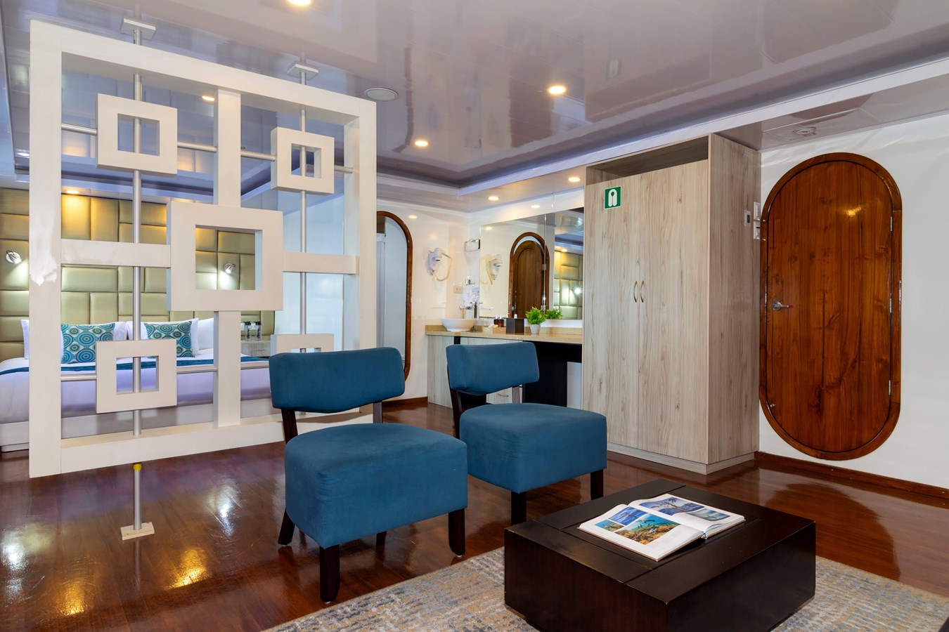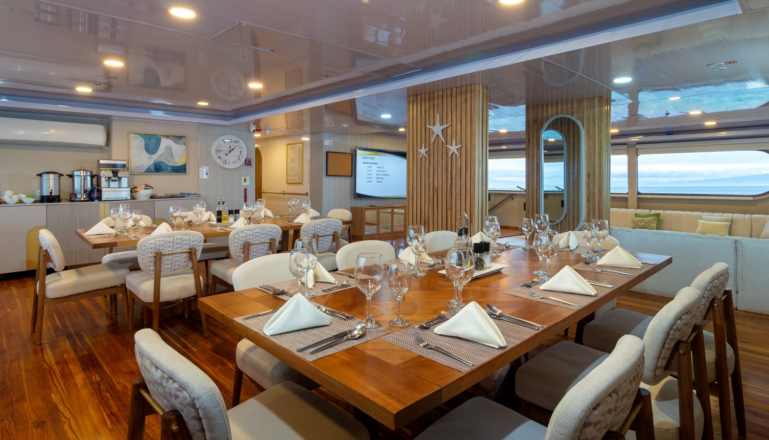 Main Deck: The journey begins on the Main Deck, where guests are welcomed with refreshing drinks and snacks after their explorations. This deck also houses the dining area, which offers panoramic views of the archipelago, and a comfortable briefing area for daily talks about upcoming activities. Two premium staterooms and two spacious master suites, each measuring 460 ft² (43 m²) with private balconies, are located here.