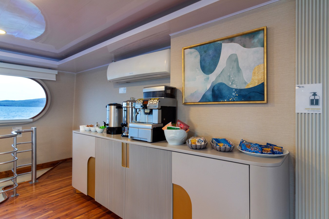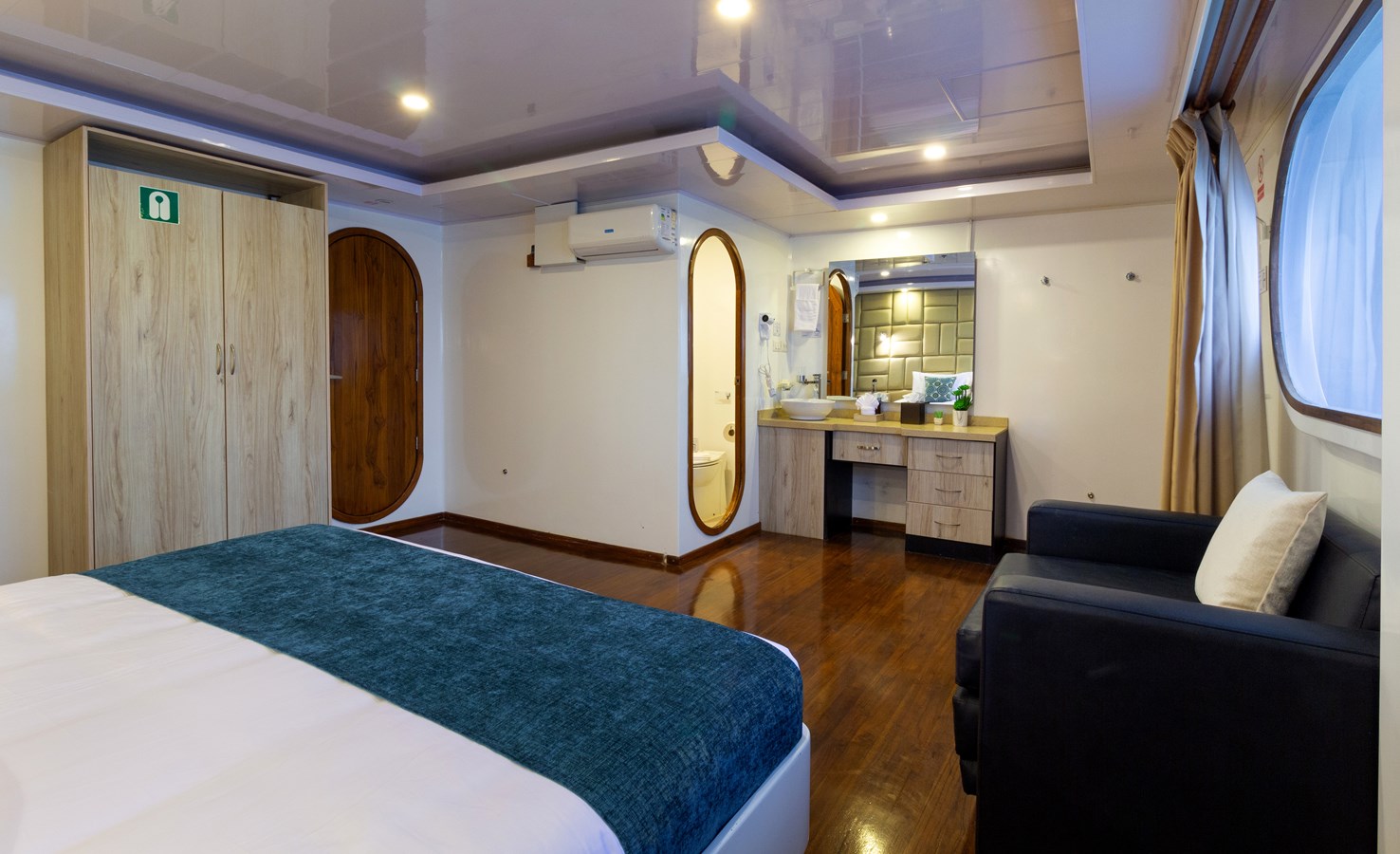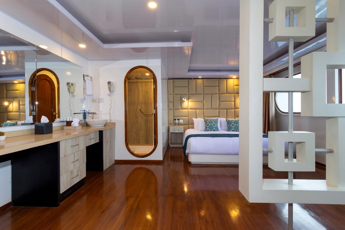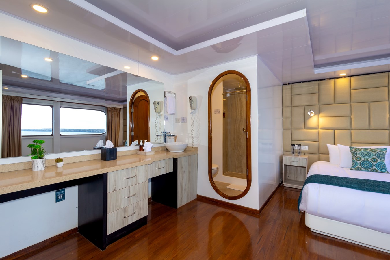 Main Deck: The journey begins on the Main Deck, where guests are welcomed with refreshing drinks and snacks after their explorations. This deck also houses the dining area, which offers panoramic views of the archipelago, and a comfortable briefing area for daily talks about upcoming activities. Two premium staterooms and two spacious master suites, each measuring 460 ft² (43 m²) with private balconies, are located here.