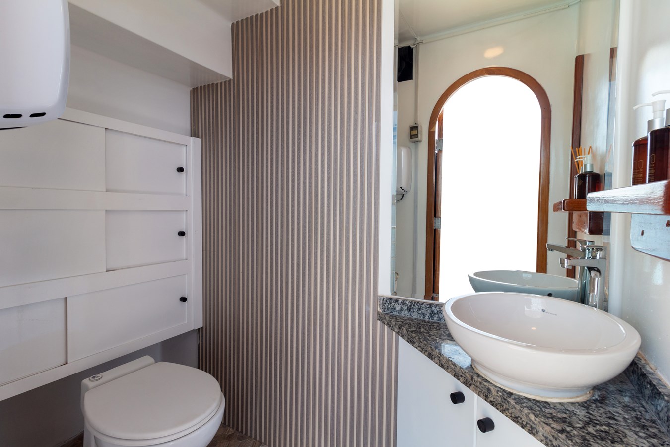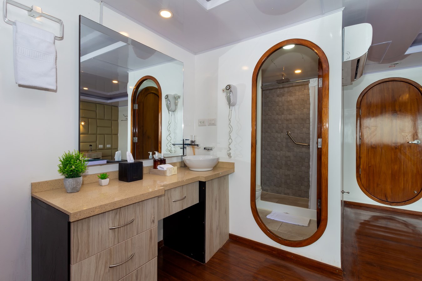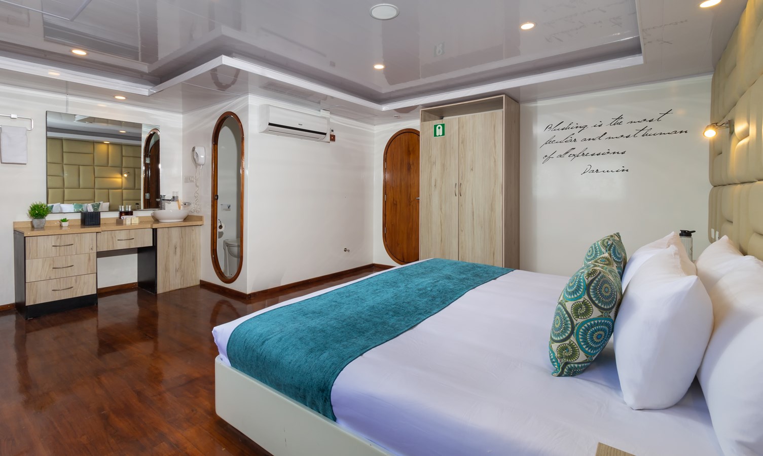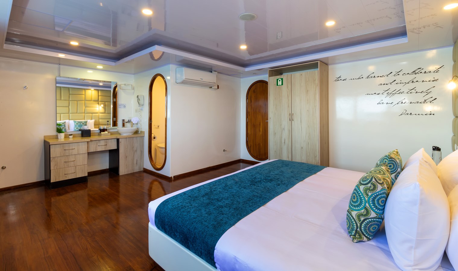 Main Deck: The journey begins on the Main Deck, where guests are welcomed with refreshing drinks and snacks after their explorations. This deck also houses the dining area, which offers panoramic views of the archipelago, and a comfortable briefing area for daily talks about upcoming activities. Two premium staterooms and two spacious master suites, each measuring 460 ft² (43 m²) with private balconies, are located here.