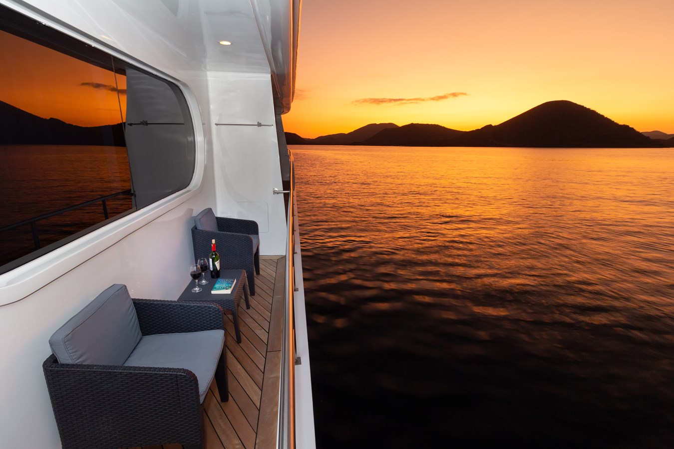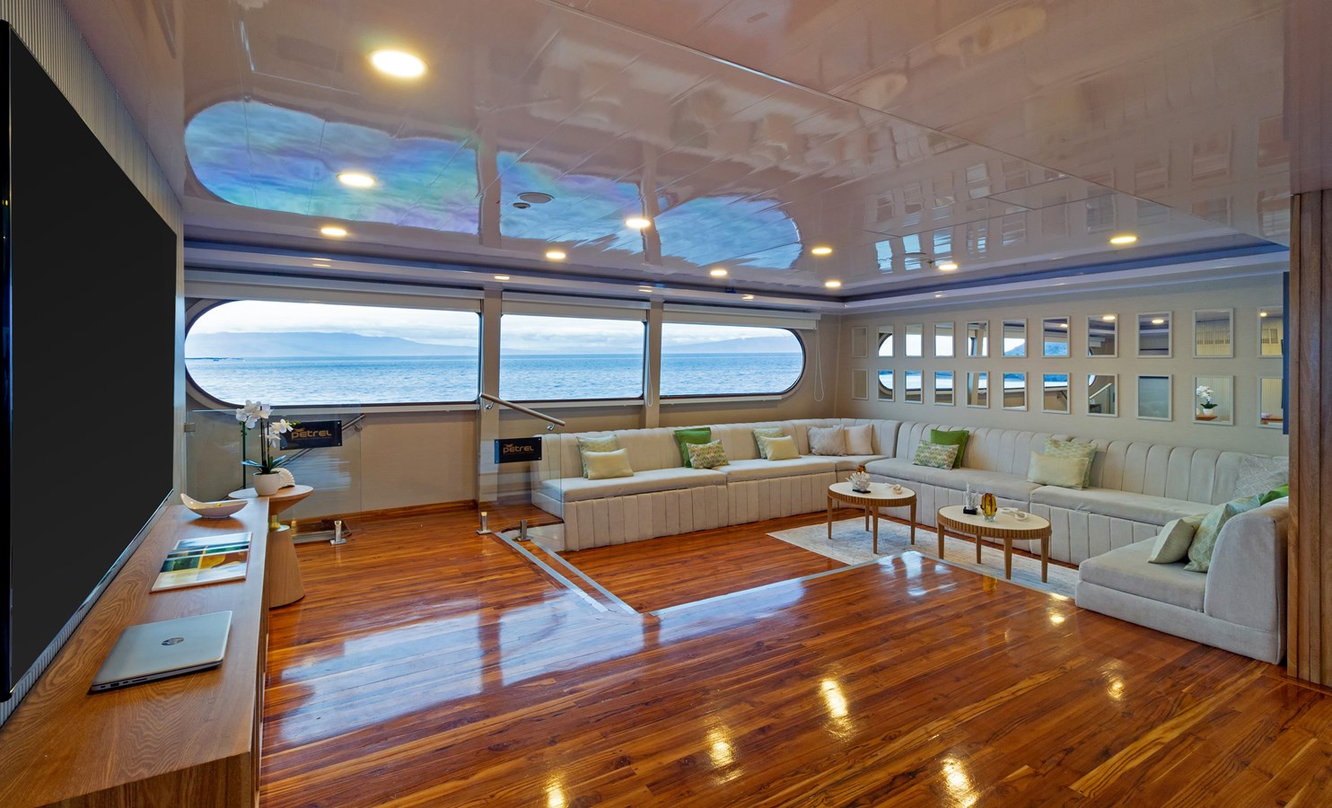 Main Deck: Guests board the M/C Petrel on the Main Deck, where delicious drinks and snacks are served after each exploration. The dining area, offering panoramic views of the archipelago, and a comfortable briefing area where daily talks are given on the activities that passengers will enjoy the following day are also located on this deck. There are also two premium staterooms and two spacious master suites, each of which measures an enormous 460 ft² (43 m²) and has a private balcony.