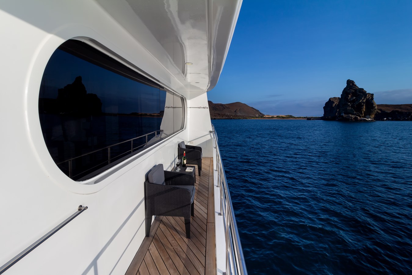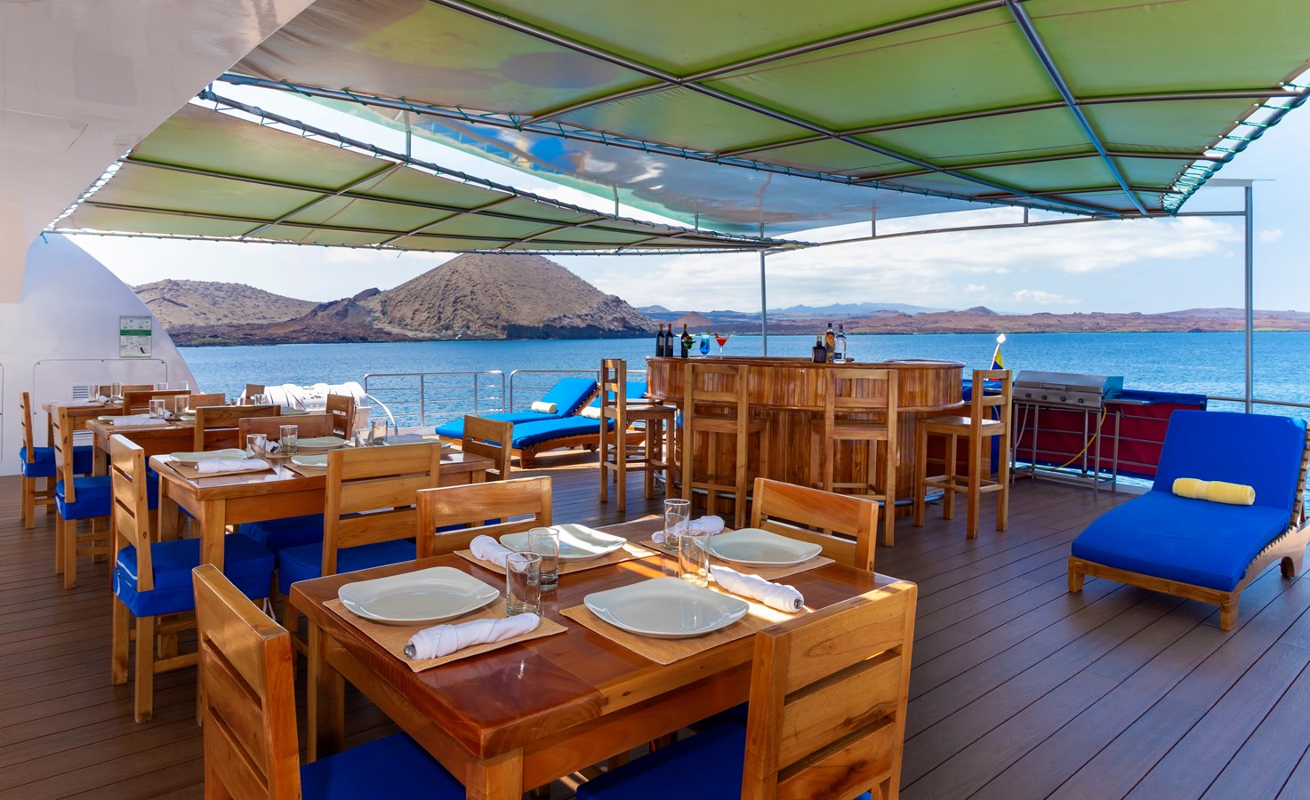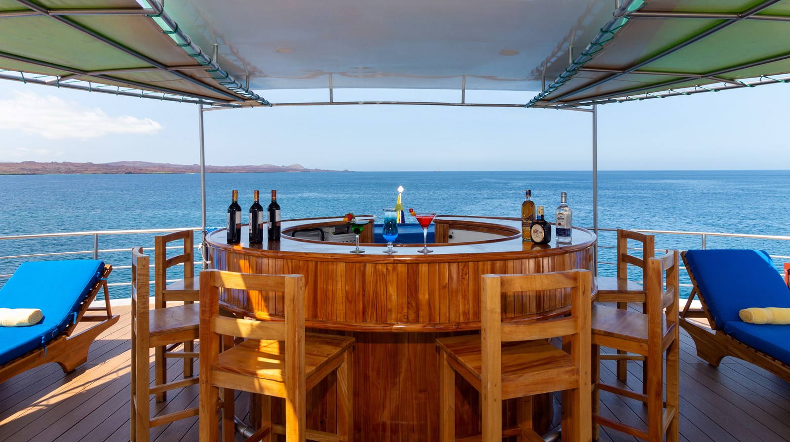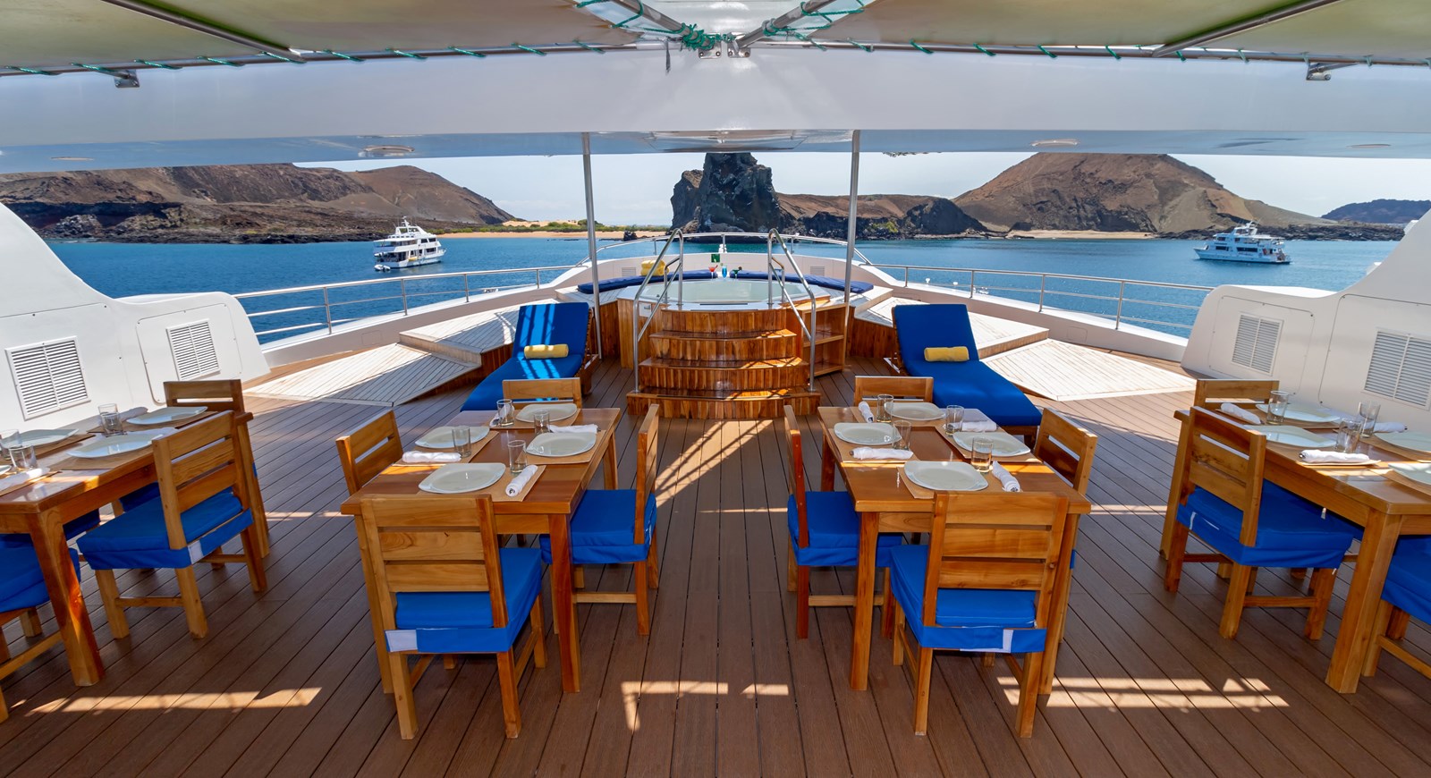 Sun Deck: The Sun Deck is the partially covered, al-fresco top deck of the M/C Petrel. It has a fully stocked bar where passengers can delight in an impressive range of refreshing drinks after a long day of exploring the islands, and an open-air dining area that is ideal for enjoying local farm-to-table meals when the weather is nice. There is also a hexagonal whirlpool for up to 6 people, surrounded by a sunning area and several comfortable lounge chairs that are perfect for basking in the warm tropical sunlight.