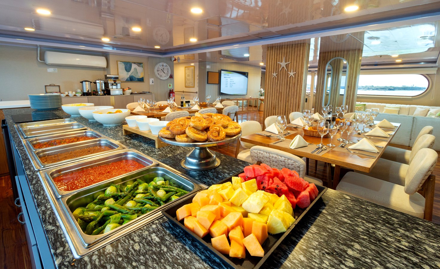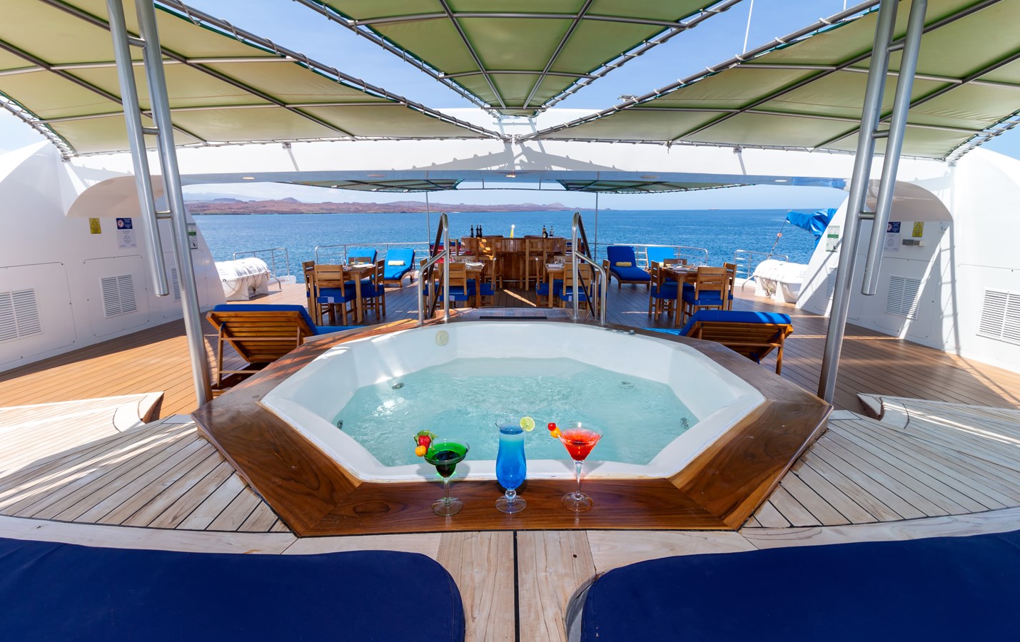 Sun Deck: The partially covered Sun Deck offers a fully stocked bar where passengers can enjoy a wide selection of refreshing drinks after a day of exploration. The open-air dining area is perfect for enjoying meals when the weather is pleasant. A hexagonal whirlpool accommodating up to 6 people is surrounded by a sunning area with comfortable lounge chairs, perfect for relaxing in the warm tropical sunlight.