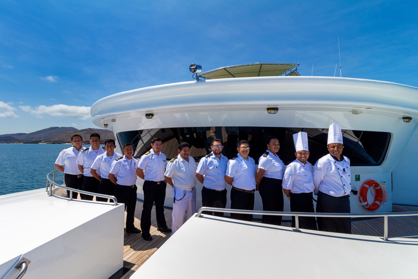 The catamaran can accommodate up to 16 guests and has a crew of 11 members, including a top-level guide.