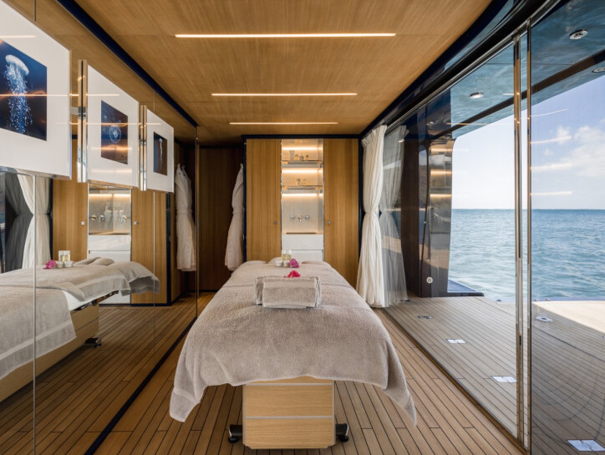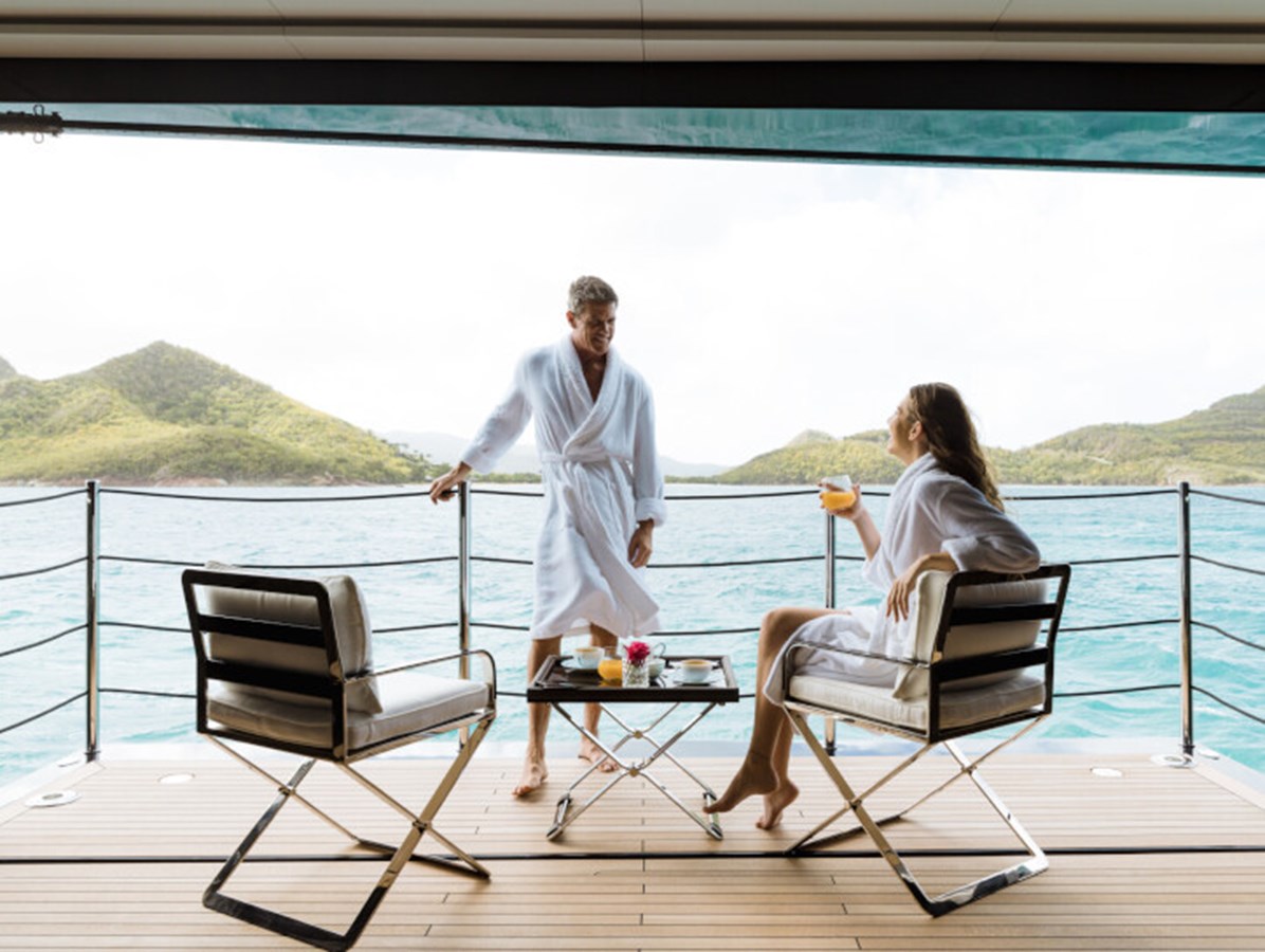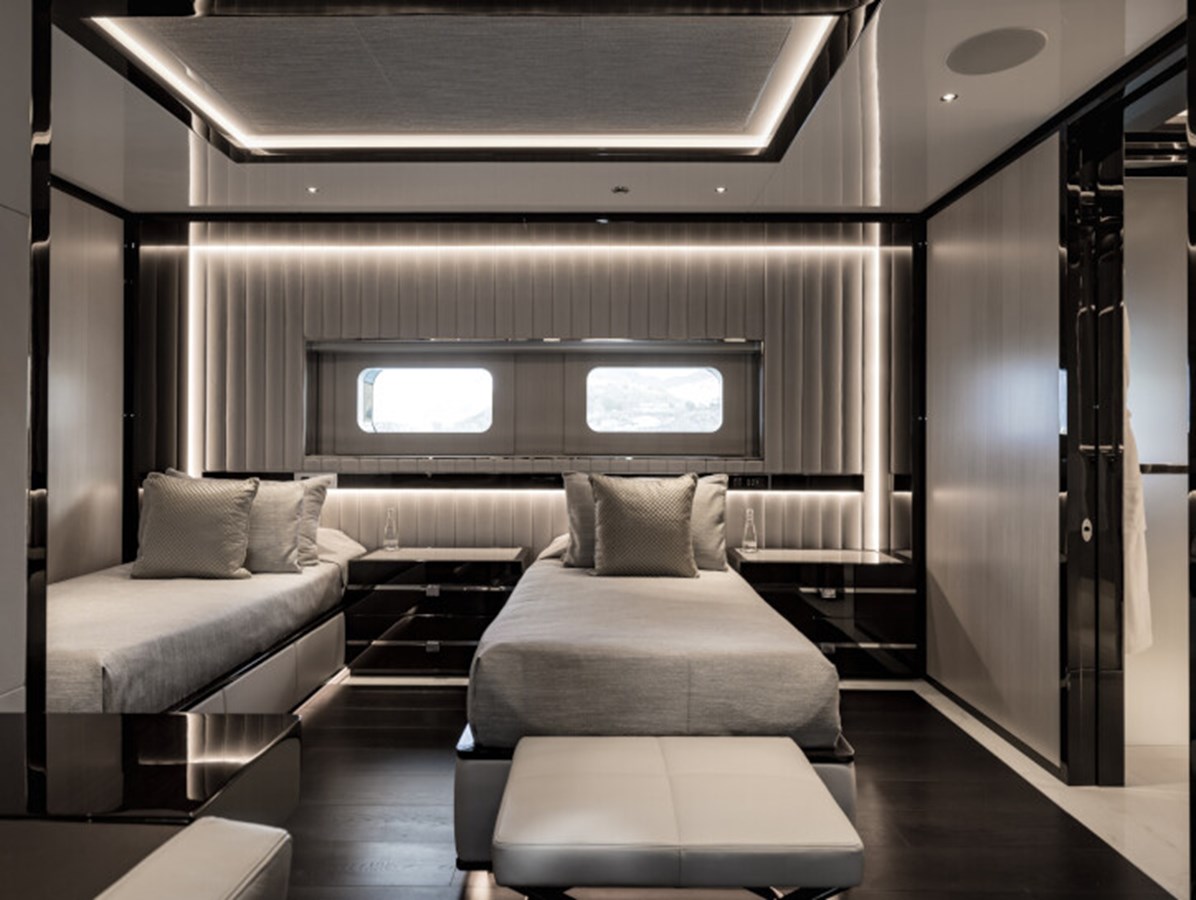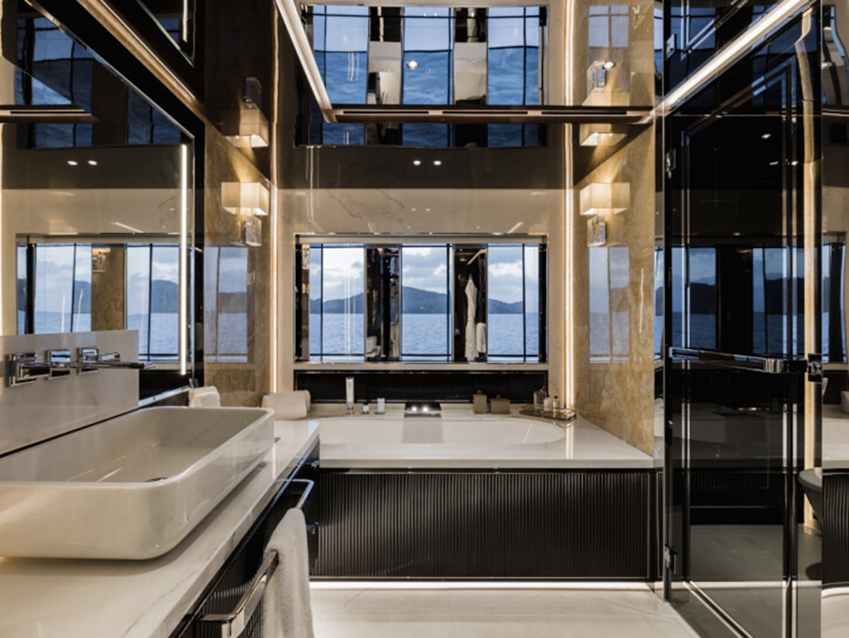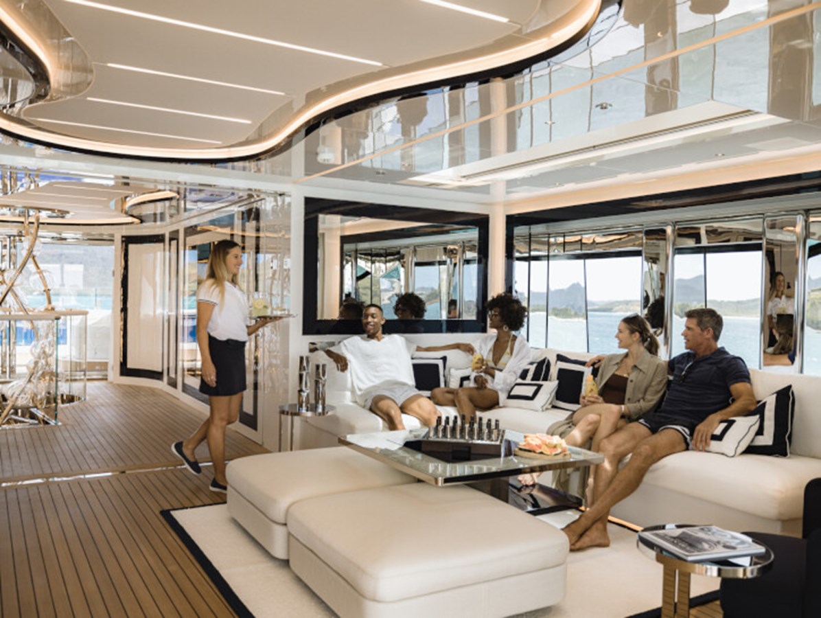 RESILIENCE can accommodate 12 guests across seven cabins, including a full-beam master suite on the main deck with fold-down terraces, his and her bathrooms and an office, which can convert to a single cabin, as required.