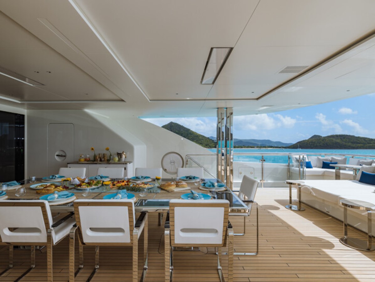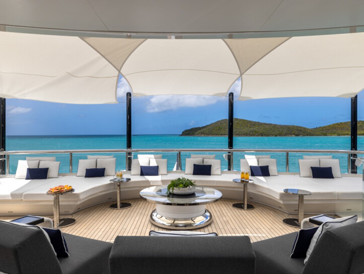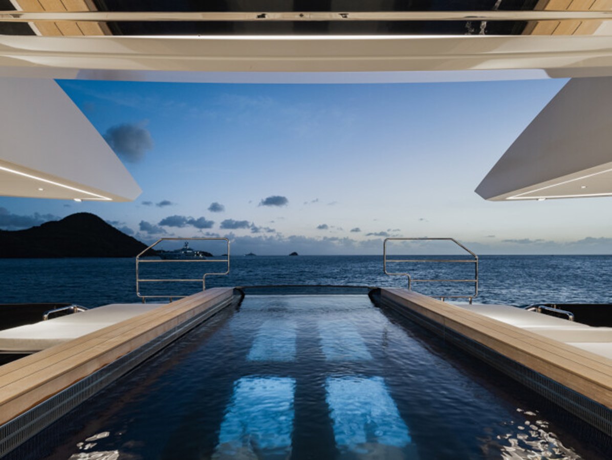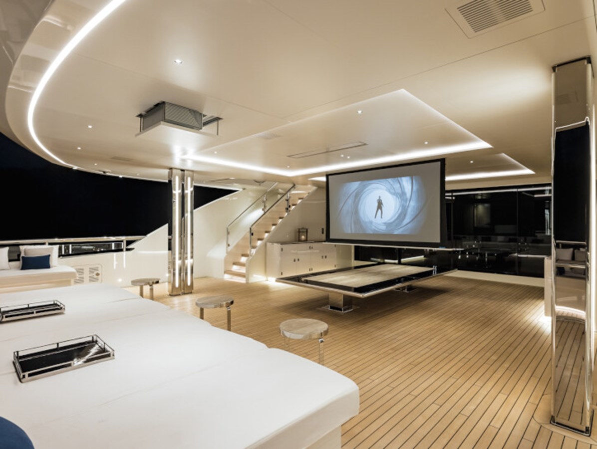 This exquisite yacht, with a classic profile and midnight blue hull, comes with a raft of amenities that will keep even the most demanding of guests satisfied, including a pool and a jacuzzi, a vast beach club and a cinema under the stars.