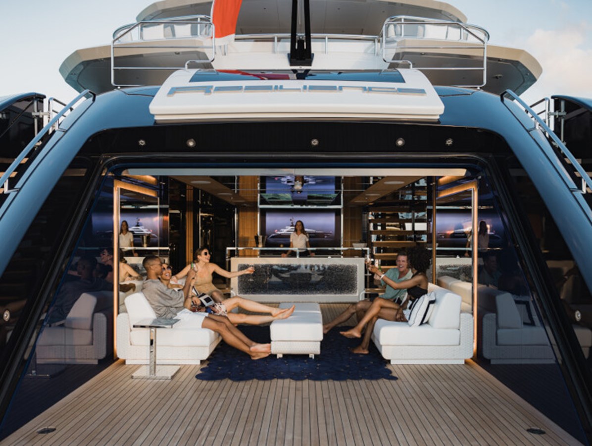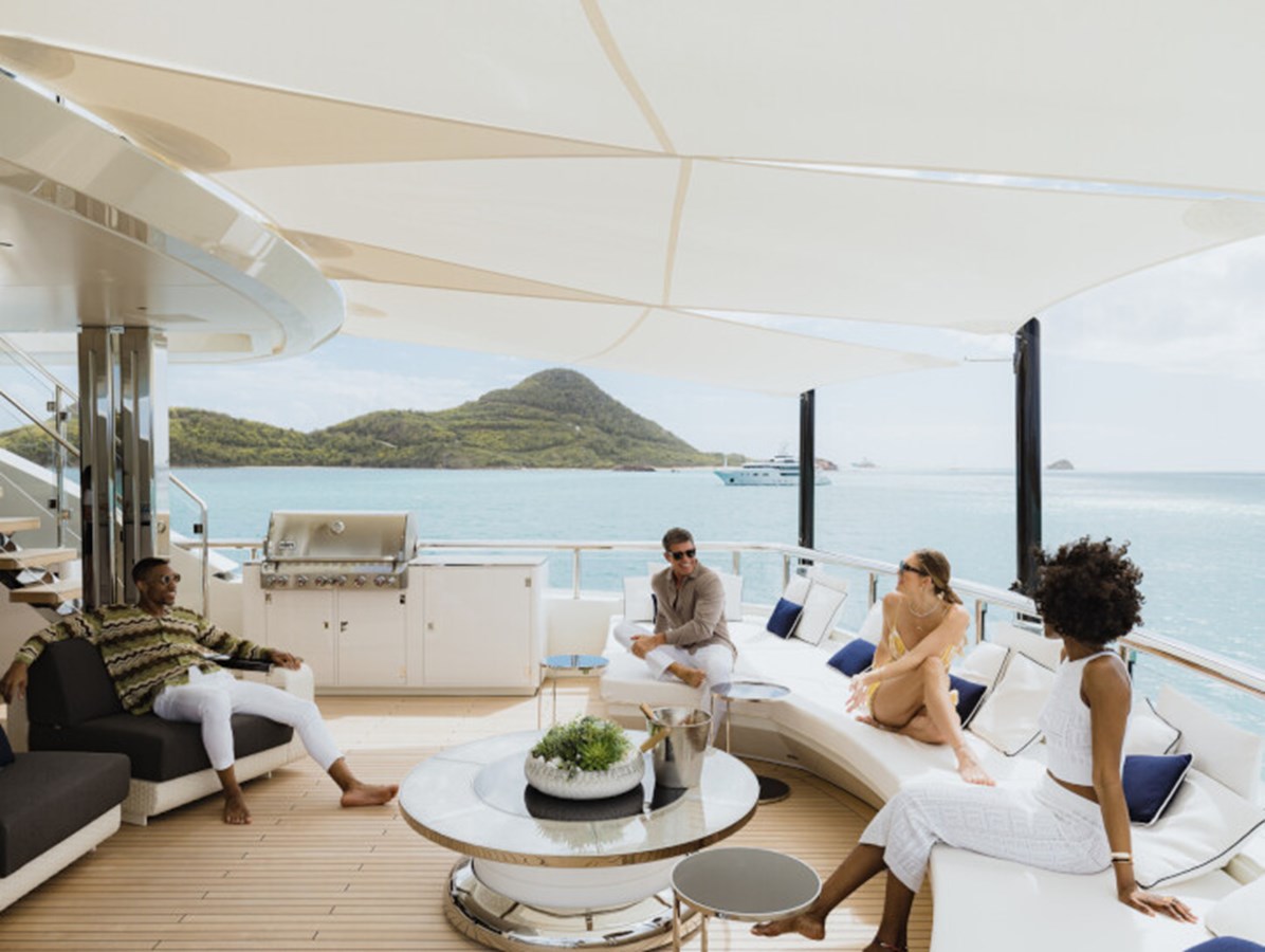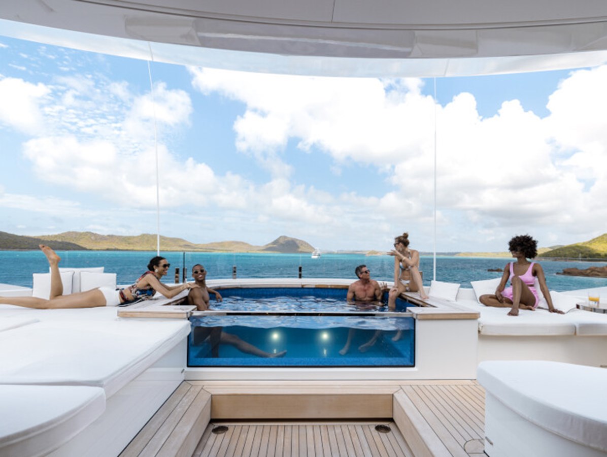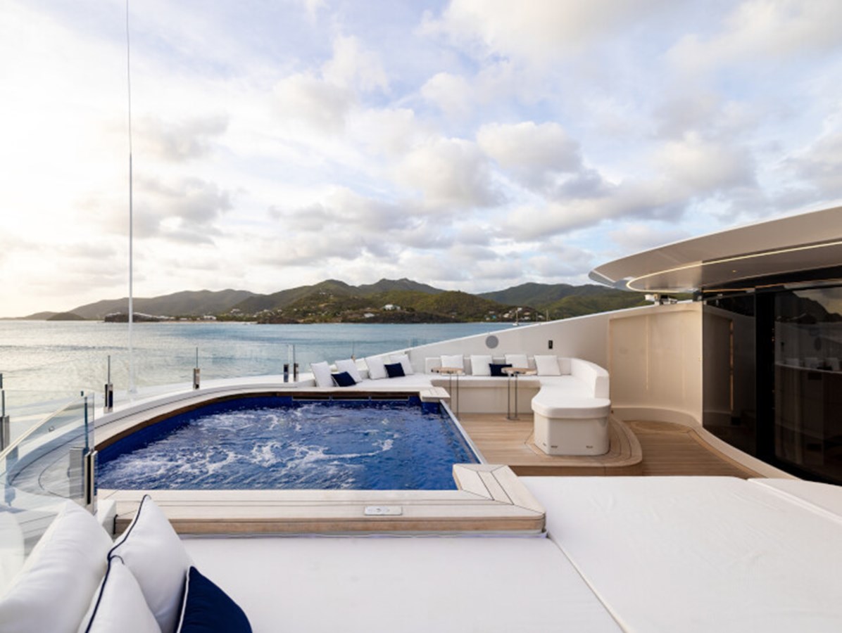 This exquisite yacht, with a classic profile and midnight blue hull, comes with a raft of amenities that will keep even the most demanding of guests satisfied, including a pool and a jacuzzi, a vast beach club and a cinema under the stars.