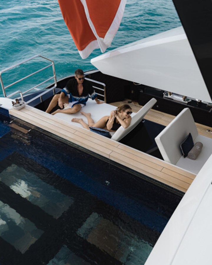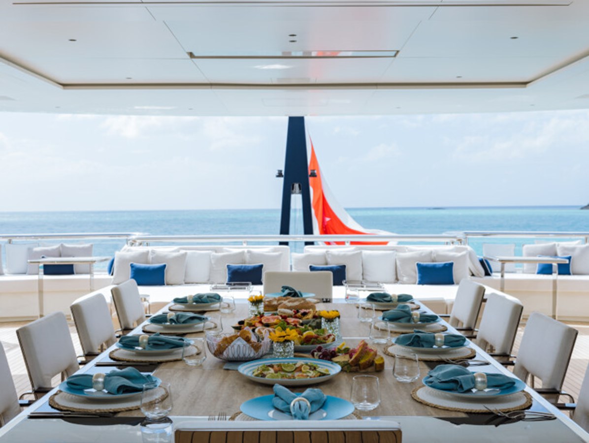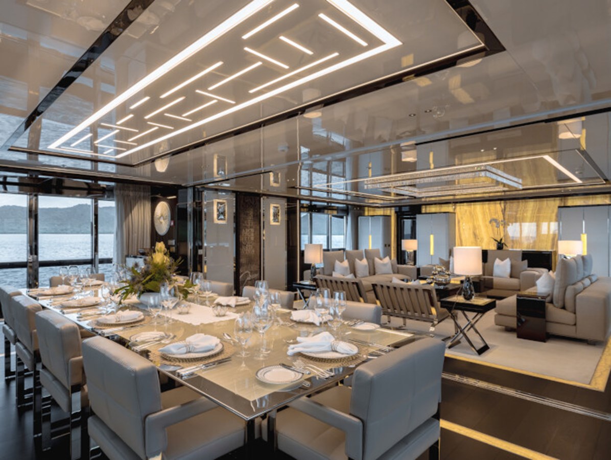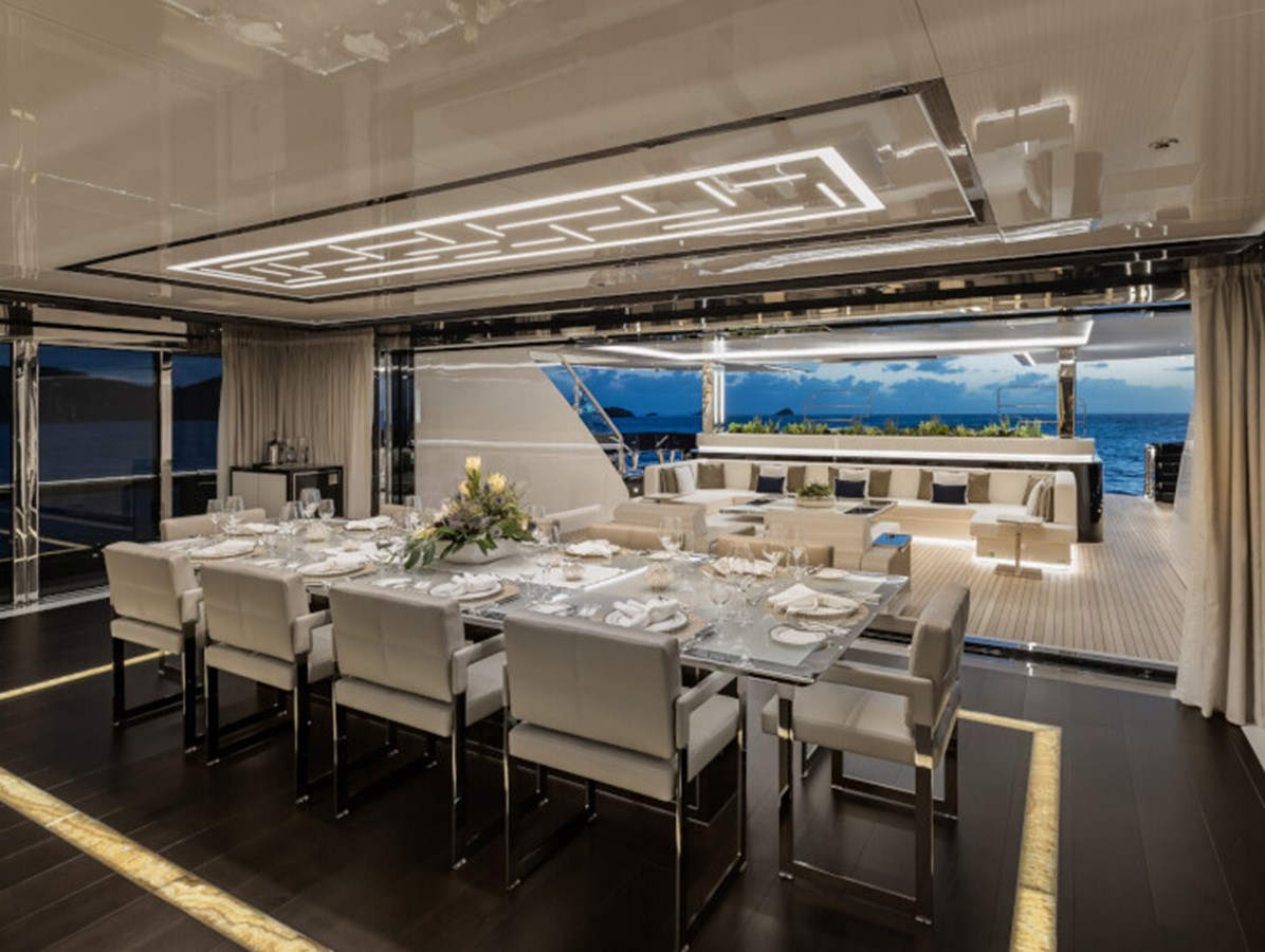 There’s a generous main deck salon, with a separate dining area that can be closed off with sliding glass doors for more privacy, while the light-filled sky lounge has a more casual nautical feel.