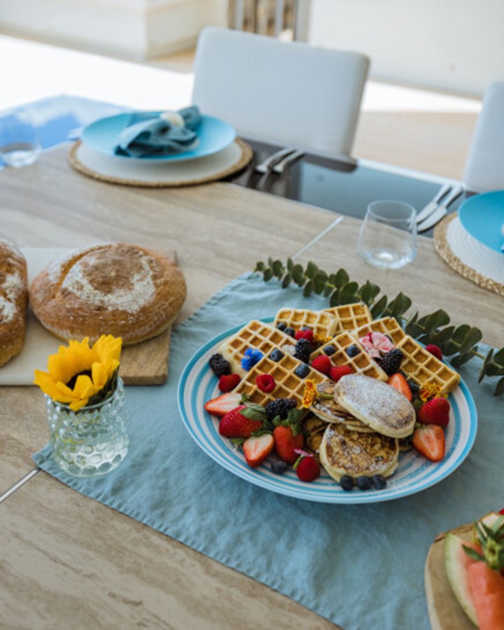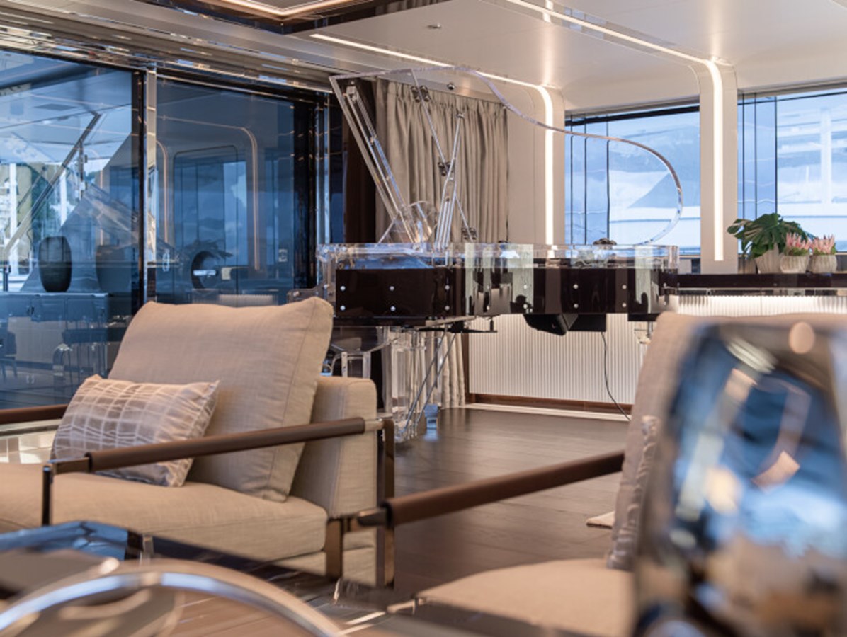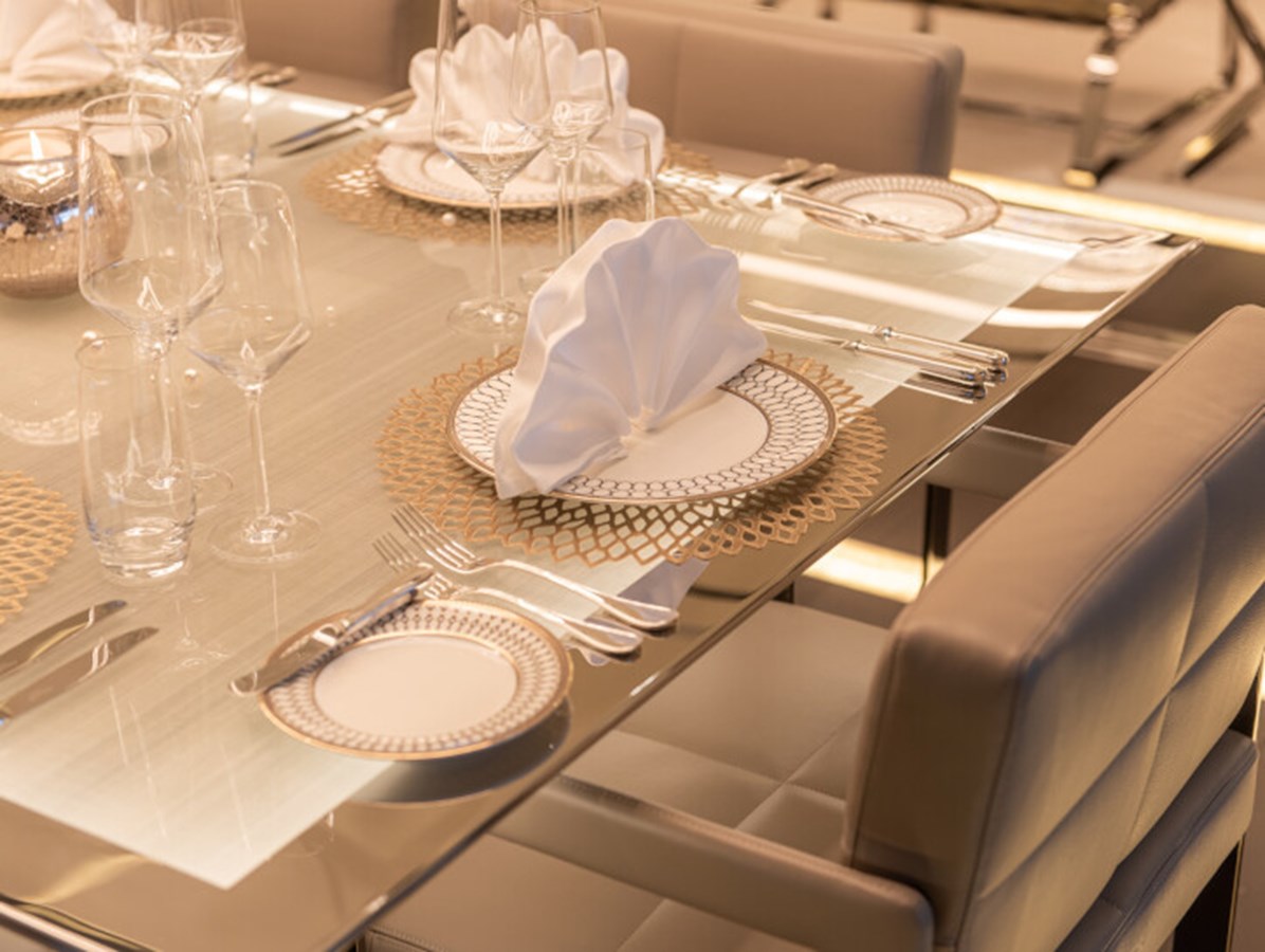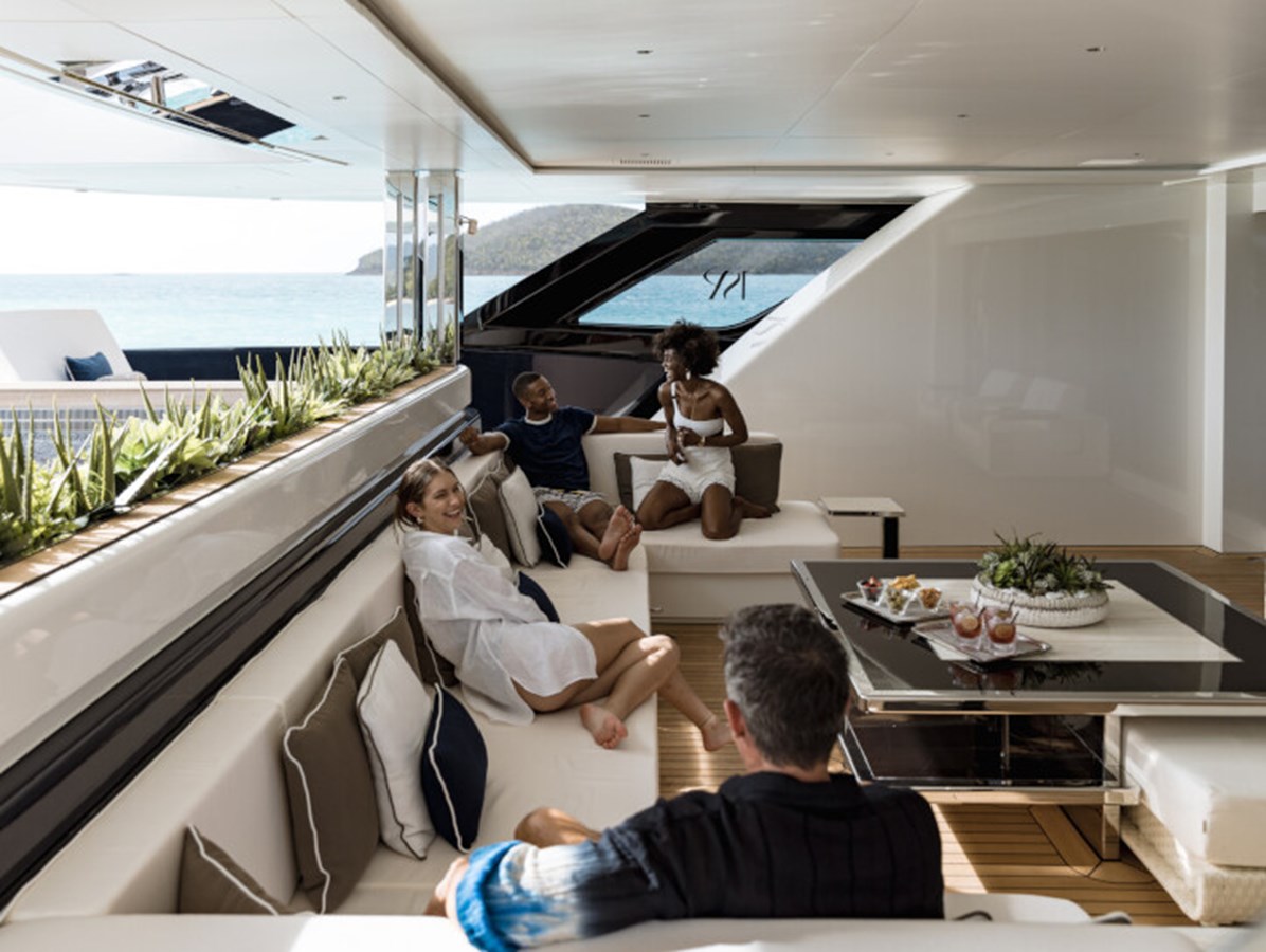 There’s a generous main deck salon, with a separate dining area that can be closed off with sliding glass doors for more privacy, while the light-filled sky lounge has a more casual nautical feel.