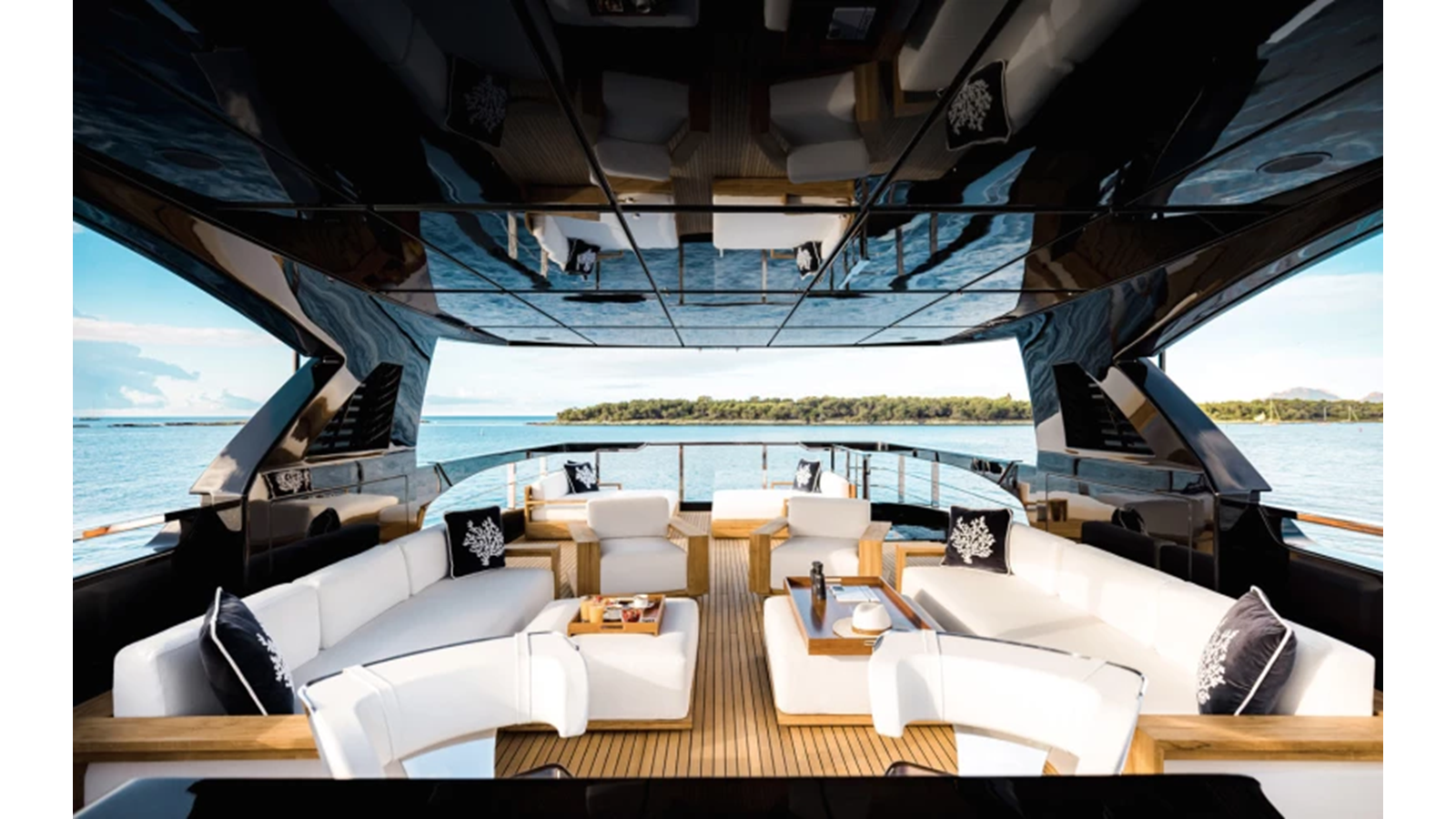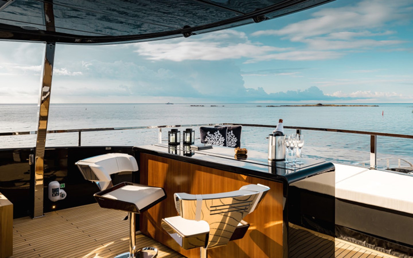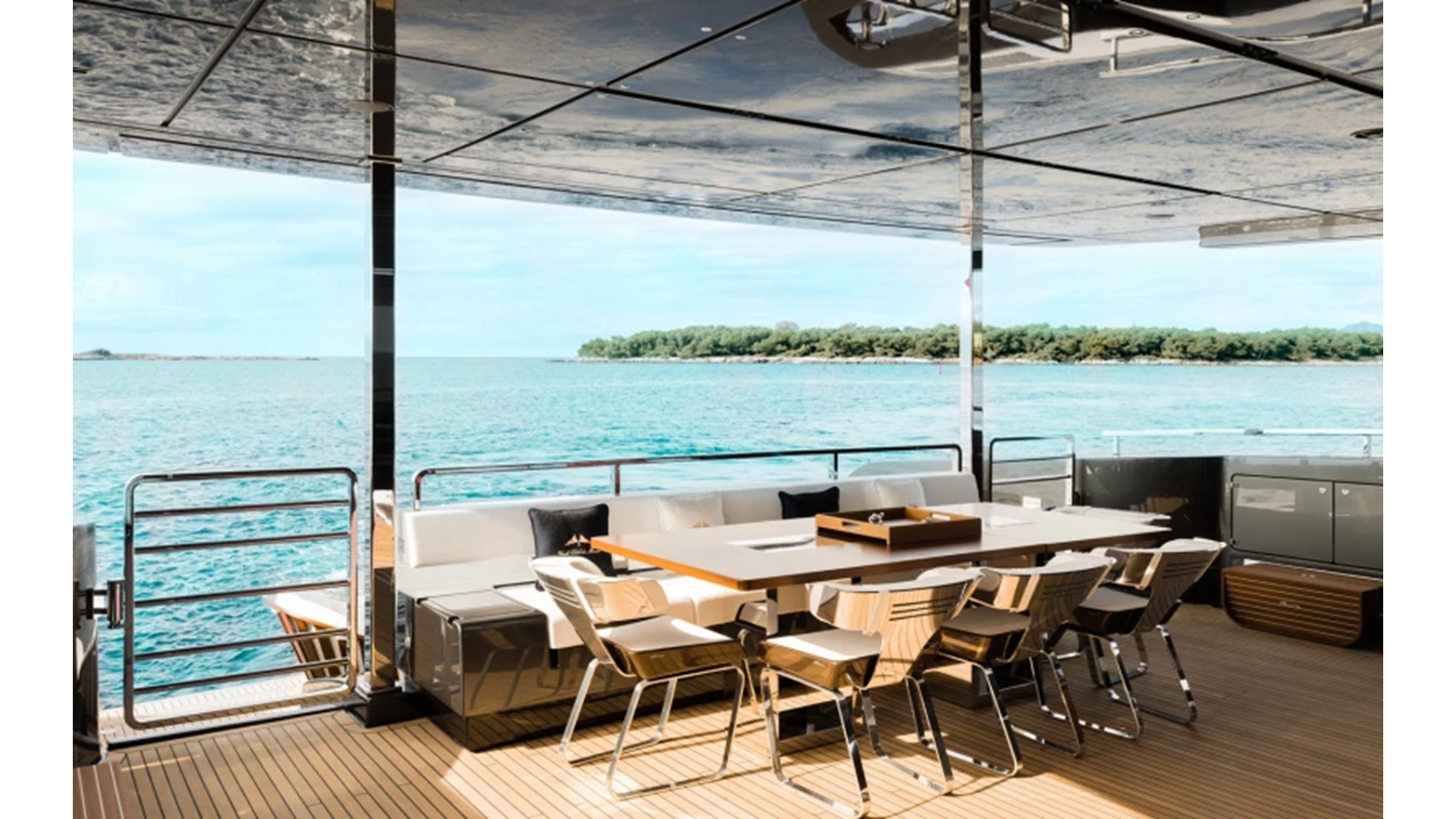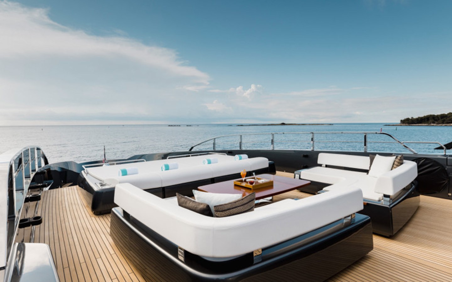 The outdoor areas are optimized to fully experience close contact with the water: the stern area, set low and open to the water, is divided into a large beach club and a cockpit of over 60 square metres. Forward, guests can choose between a lounge, a large sun pad and other intimate and inviting spaces. The exterior spaces are rounded out by an alfresco dining area, accommodating up to ten people on the upper deck, and a relaxation area on the sundeck.