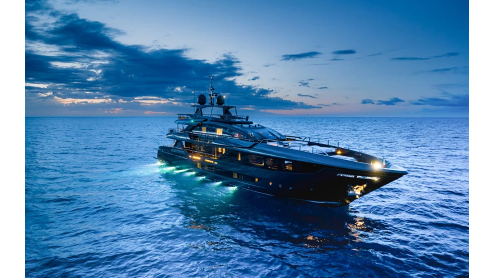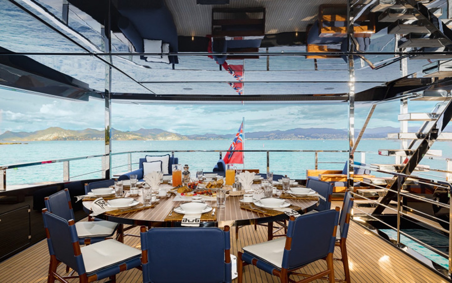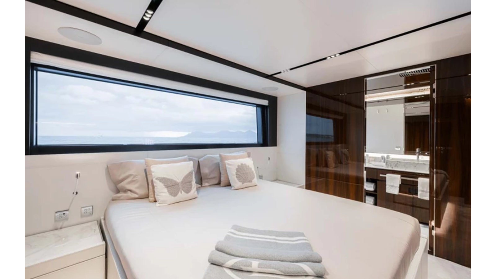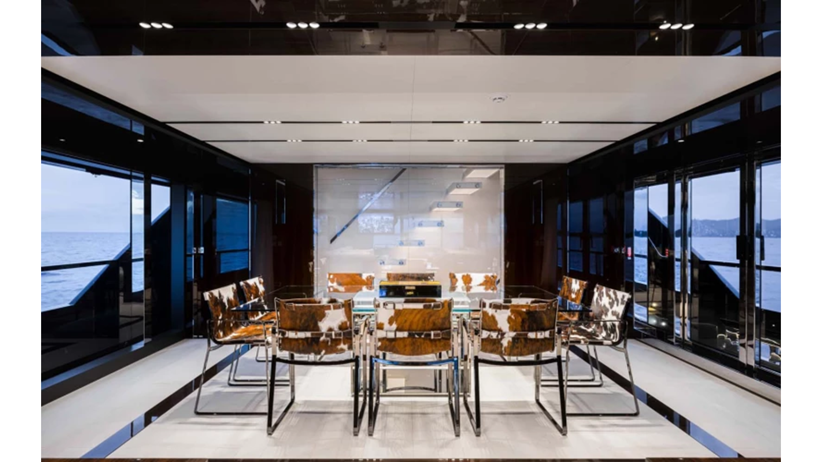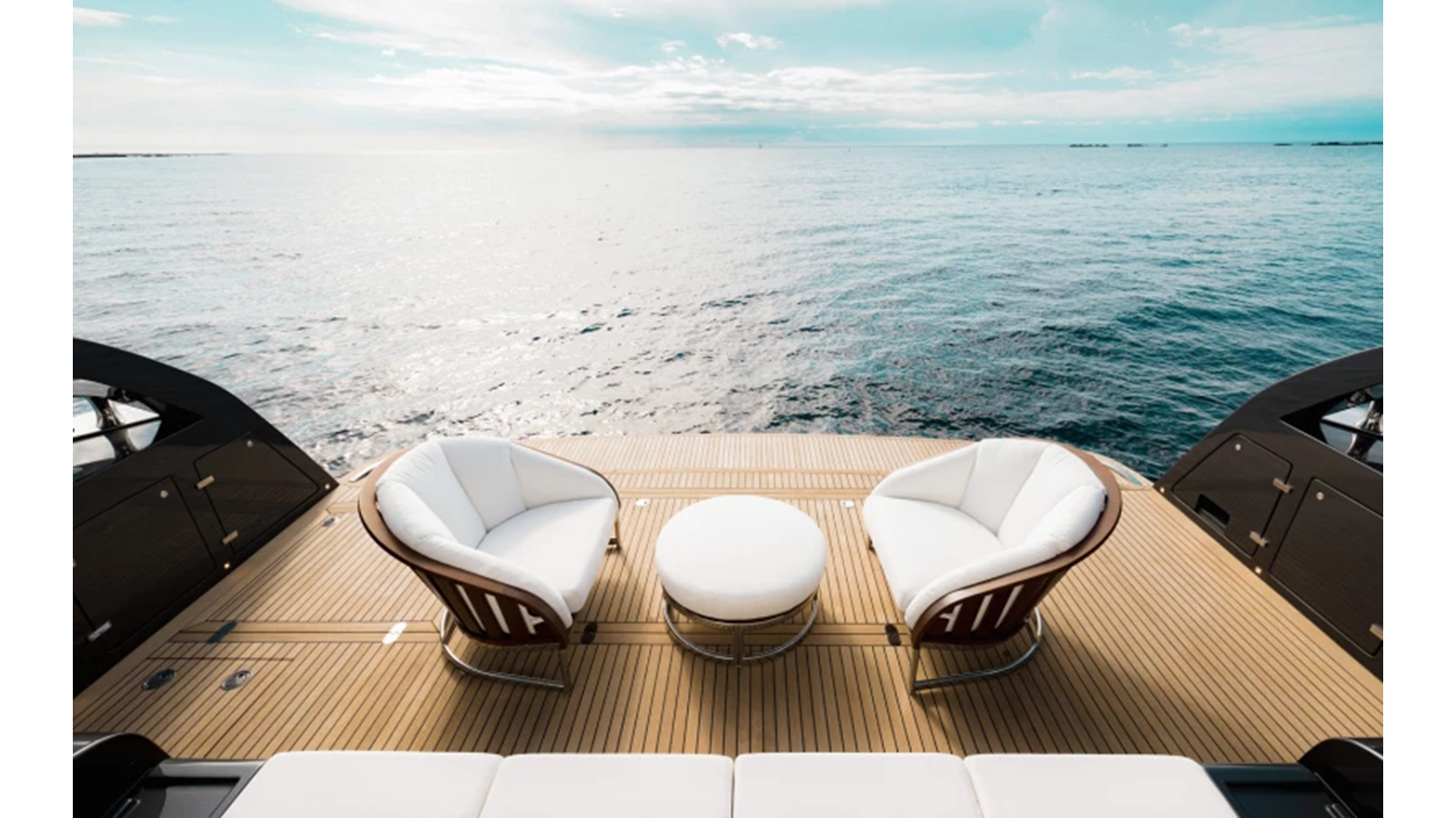 The outdoor areas are optimized to fully experience close contact with the water: the stern area, set low and open to the water, is divided into a large beach club and a cockpit of over 60 square metres. Forward, guests can choose between a lounge, a large sun pad and other intimate and inviting spaces. The exterior spaces are rounded out by an alfresco dining area, accommodating up to ten people on the upper deck, and a relaxation area on the sundeck.