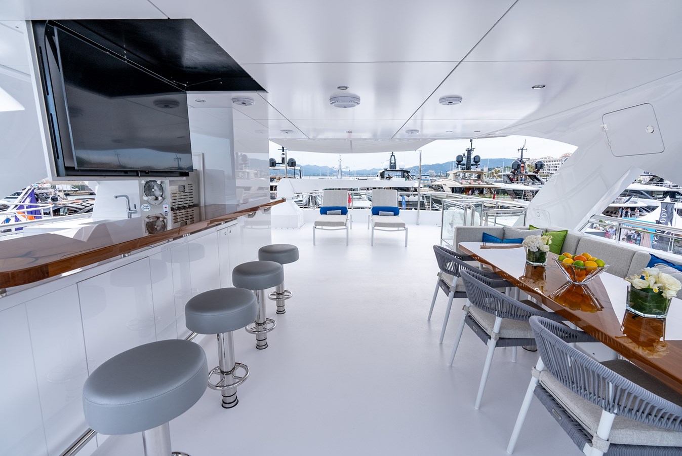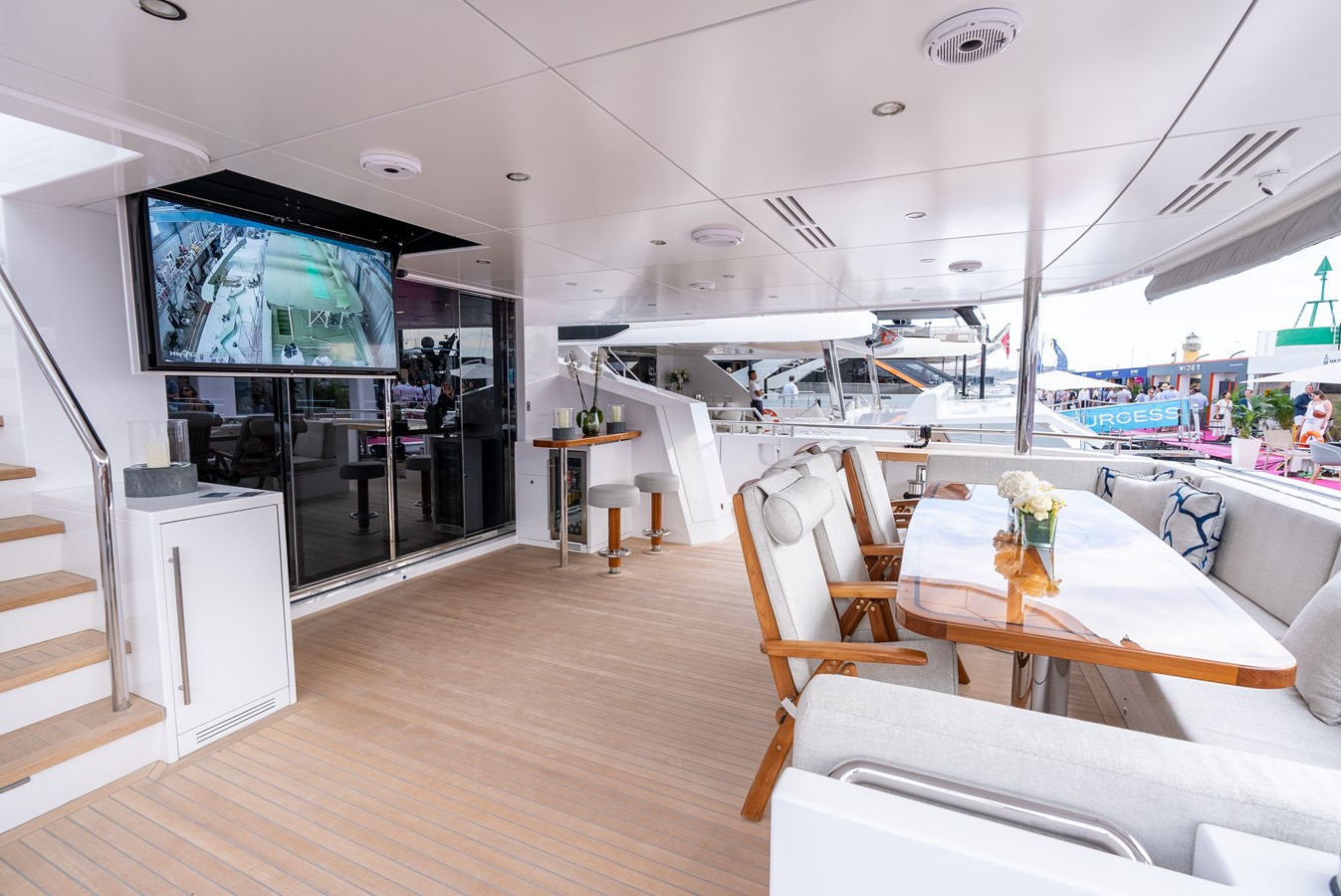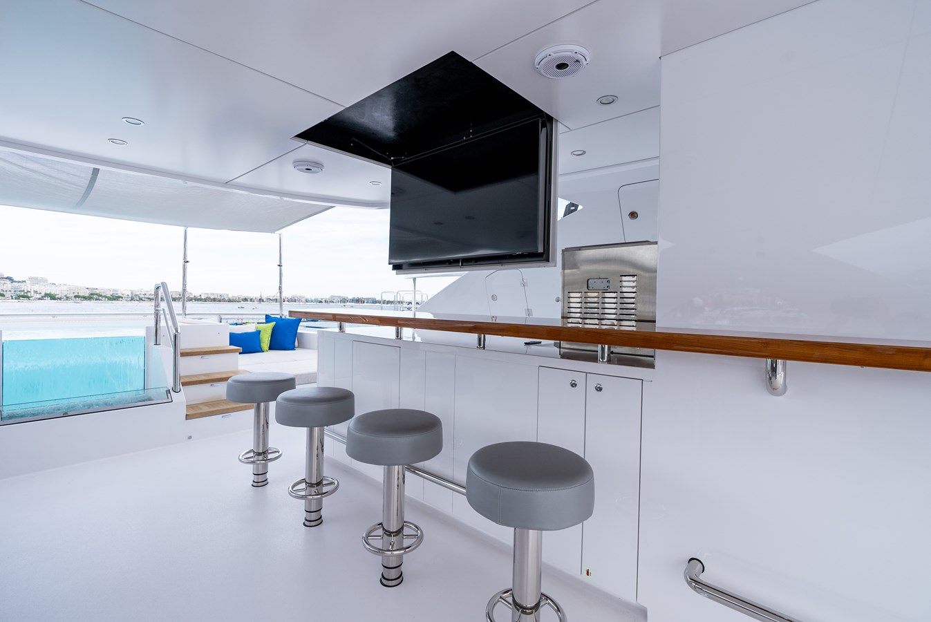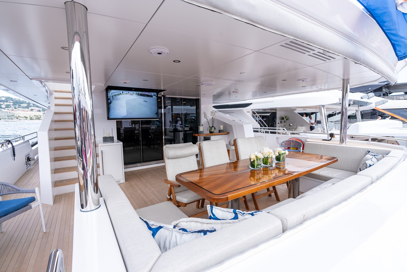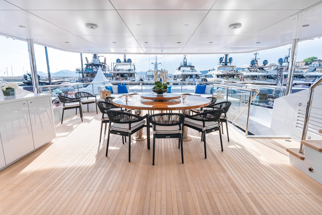 Elevate to the sundeck and immerse yourself in the waterfall infinity-style Jacuzzi and have lunch in the roomy dining area. An additional bar and day head are located on this level for accessibility and convenience. Roam around to the oversized sunbed on the bow and soak up some sun rays, all while getting lost in your favorite book…or the view! Moving down to the special feature in the beach club, there is a hydraulic swim platform that can open at anchor for sunbathing and spectating. Also at the beach club, take a turn in the steam room.