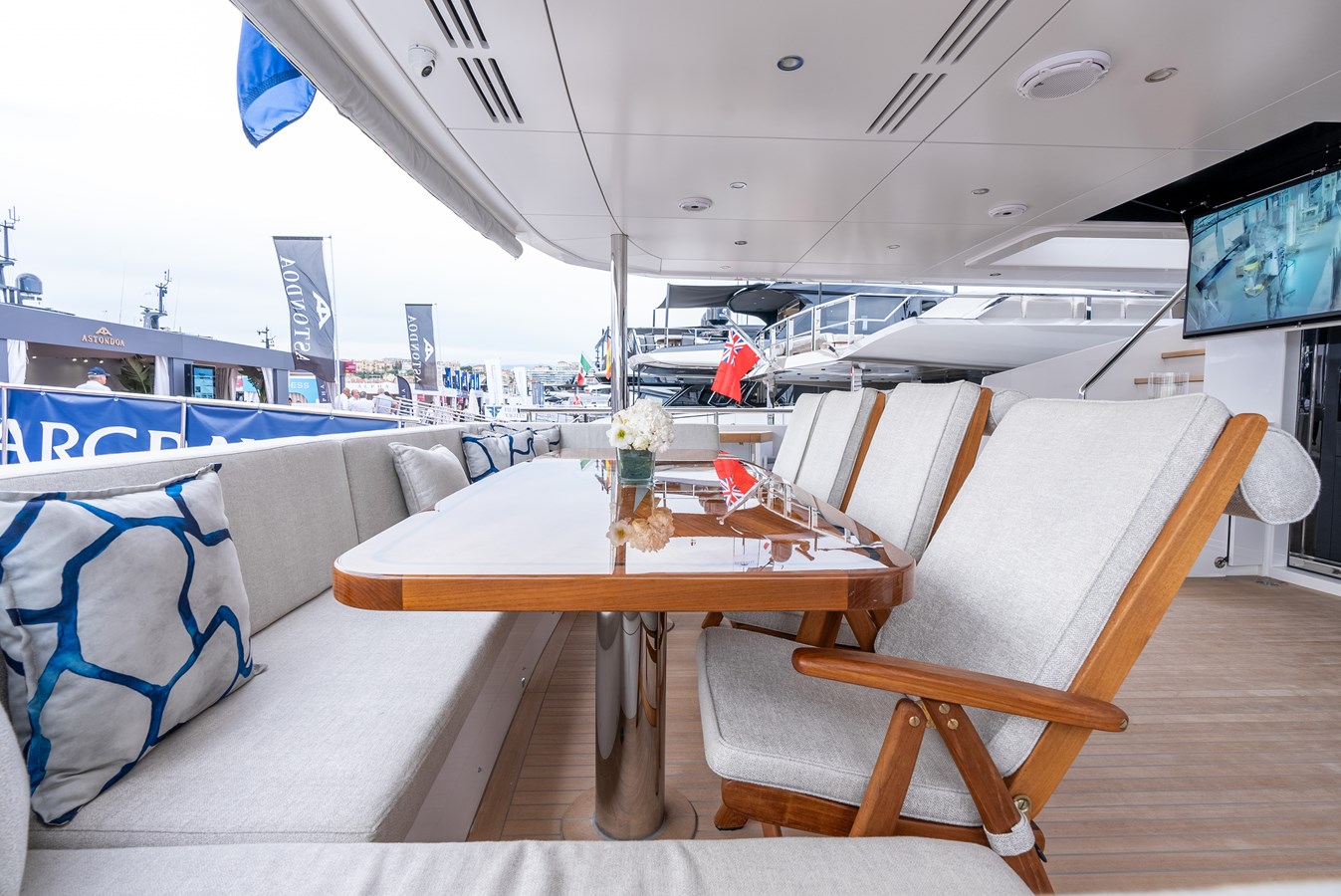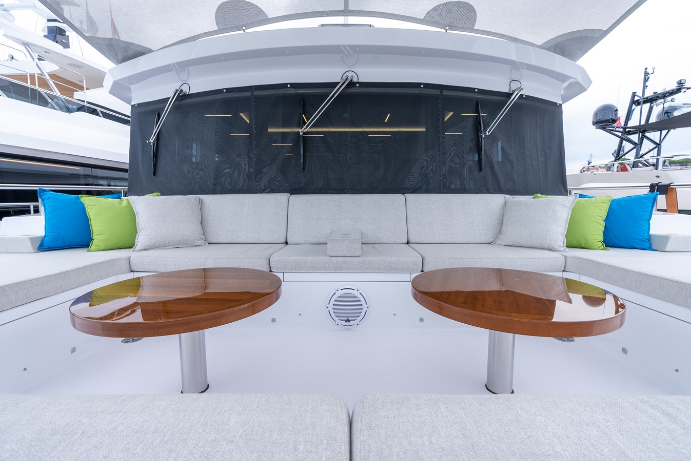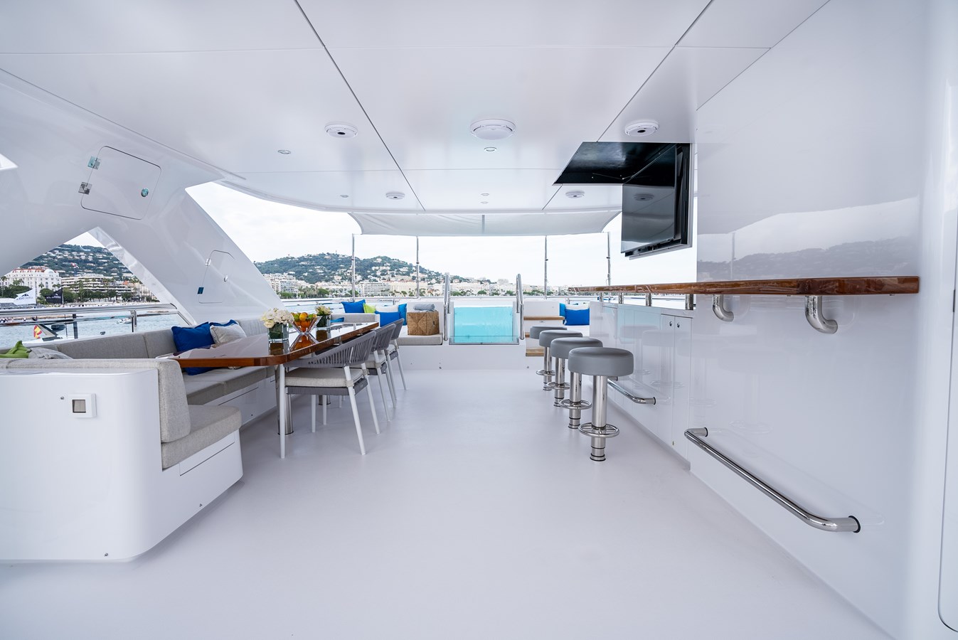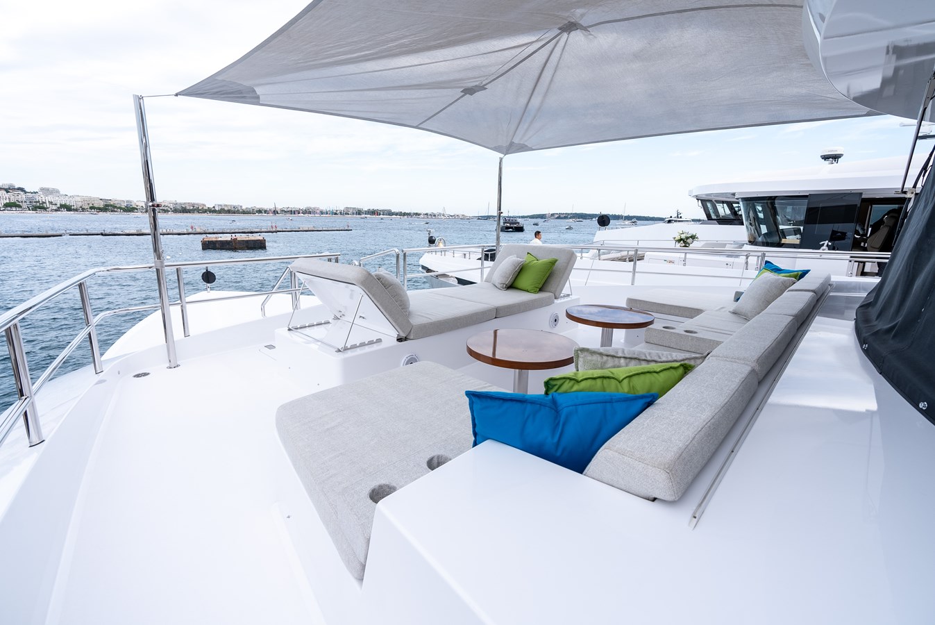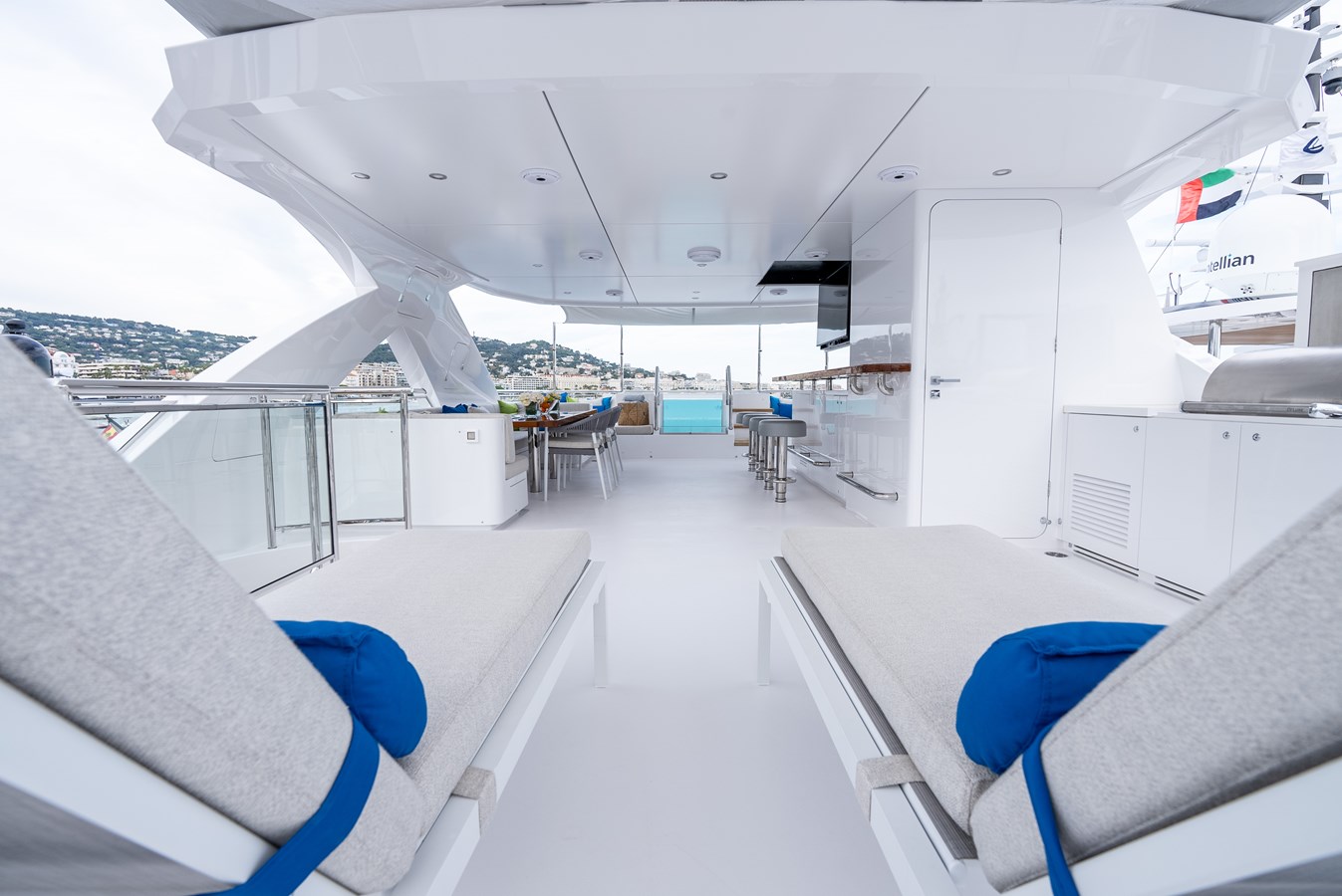 Elevate to the sundeck and immerse yourself in the waterfall infinity-style Jacuzzi and have lunch in the roomy dining area. An additional bar and day head are located on this level for accessibility and convenience. Roam around to the oversized sunbed on the bow and soak up some sun rays, all while getting lost in your favorite book…or the view! Moving down to the special feature in the beach club, there is a hydraulic swim platform that can open at anchor for sunbathing and spectating. Also at the beach club, take a turn in the steam room.