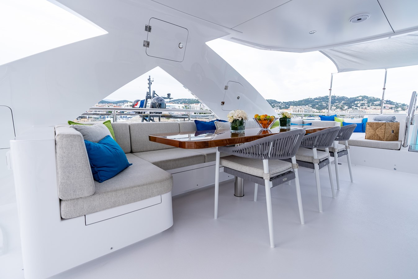 Welcome Aboard ROMEO FOXTROT, Hargrave’s 2022 116’ tri-deck superyacht. Her sleek design features a luxury five-stateroom configuration, including a full-beam on-deck master suite, as well as king-sized beds in all staterooms. Modern finishes see soft grey and white tones beautifully contrasting the mahogany wooden floors throughout. Enjoy a cocktail with ocean views from the glass-top bar in the sky lounge or relax in the lush salon, bathed in natural light and equipped with all of the latest in cutting-edge technology.