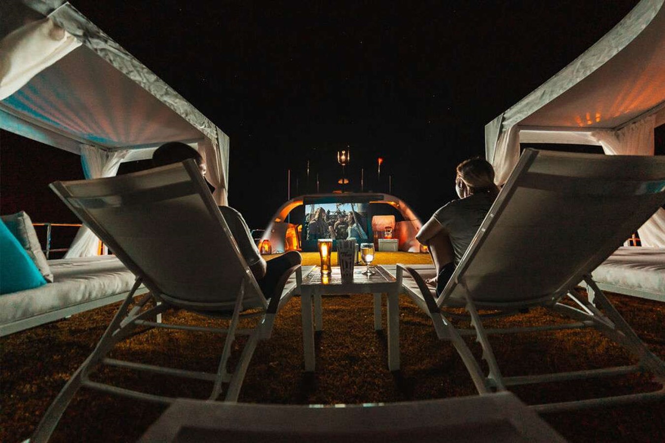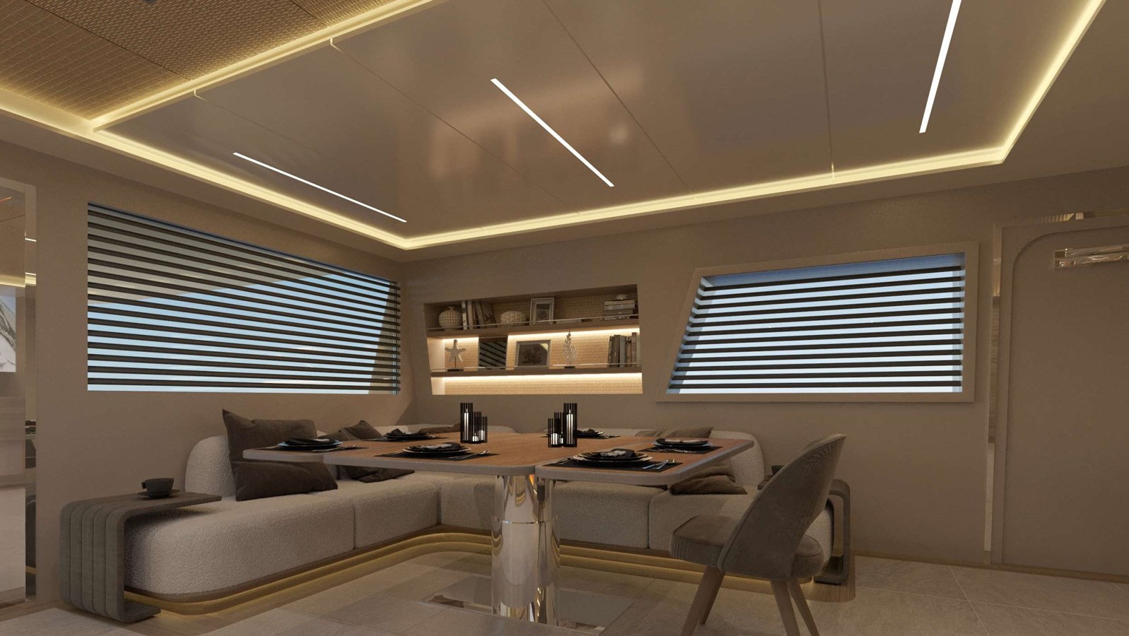 Moving up to the SUN DECK during the day is akin to stepping into a private garden in an exclusive villa. Two custom cabanas easily offer comfort to 3 adults each with shade as desired overhead and around. If more sun is preferred, two chaise and two comfortable bean bags can be positioned where guests wish. A ‘jump seat’ sunpad situated in front of the helm on this level also provides the best view from above. The grassy texture covering this deck is soothing and non-slip underfoot while also giving an ‘island’ feel. As the moon rises, this deck transforms to a whole new experience of its own. Whether experiencing movie night with the oversized cinema in position or an elegant dinner under the stars, this is the most favored space aboard by most.