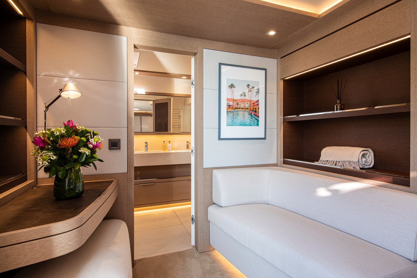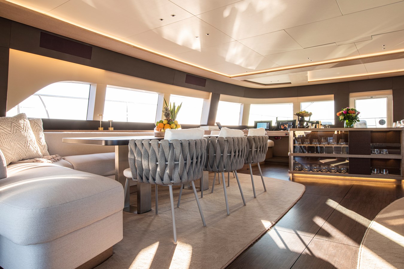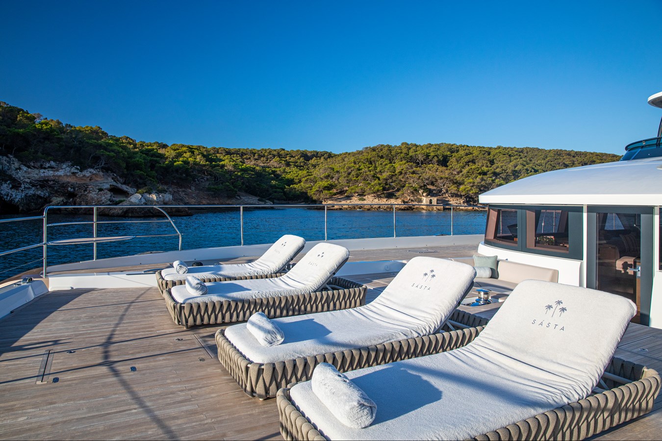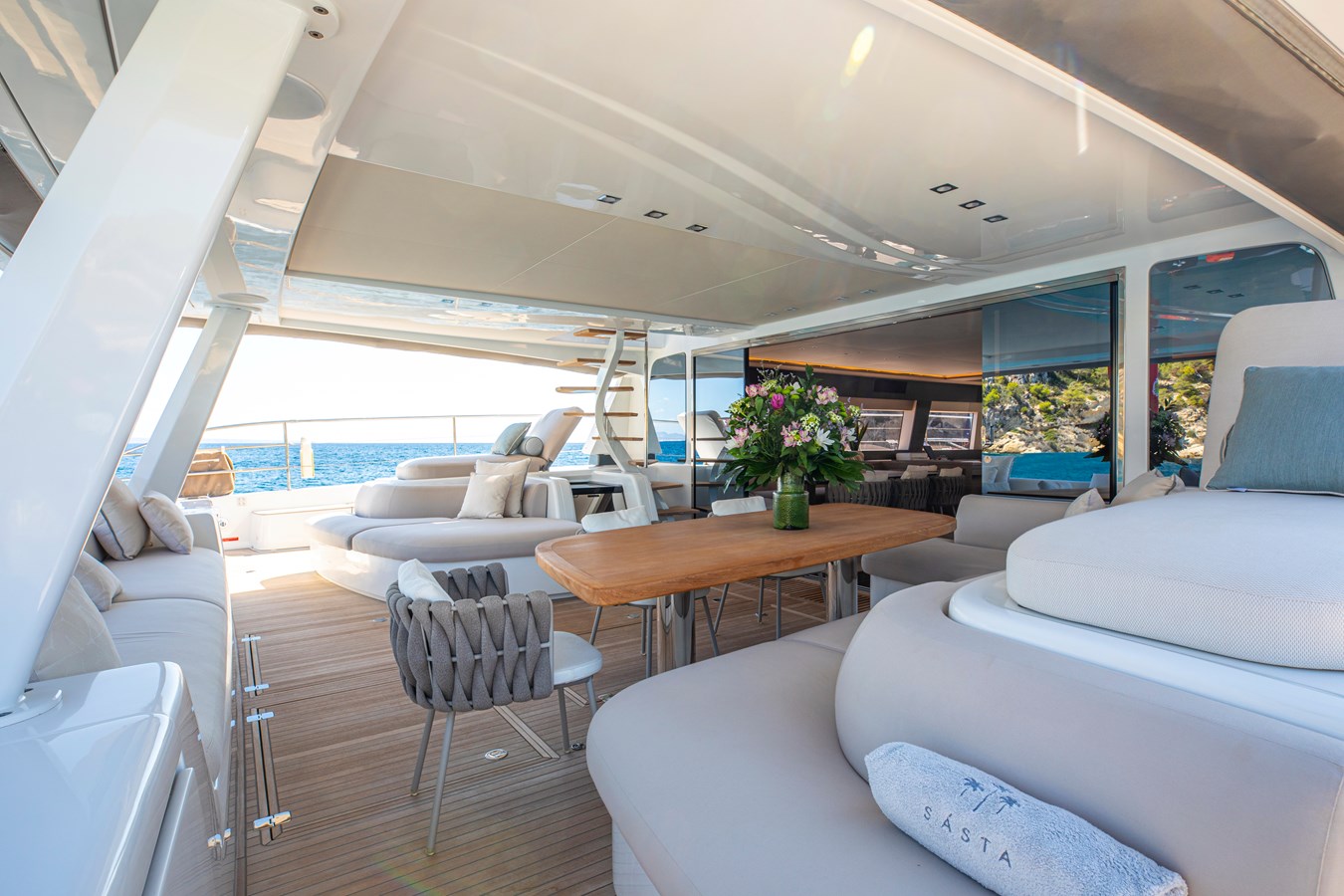 SÁSTA meaning ‘satisfied’ in old Irish answers every need a guest might have. Providing spacious and convivial living areas, enabling free circulation between interior and exterior while also integrating luxurious cabins optimizing comfort and fun at every design aspect. Her champagne-coloured hull during sundawn, makes SÁSTA an unrivalled jewel nicely blending in with the natural environment.