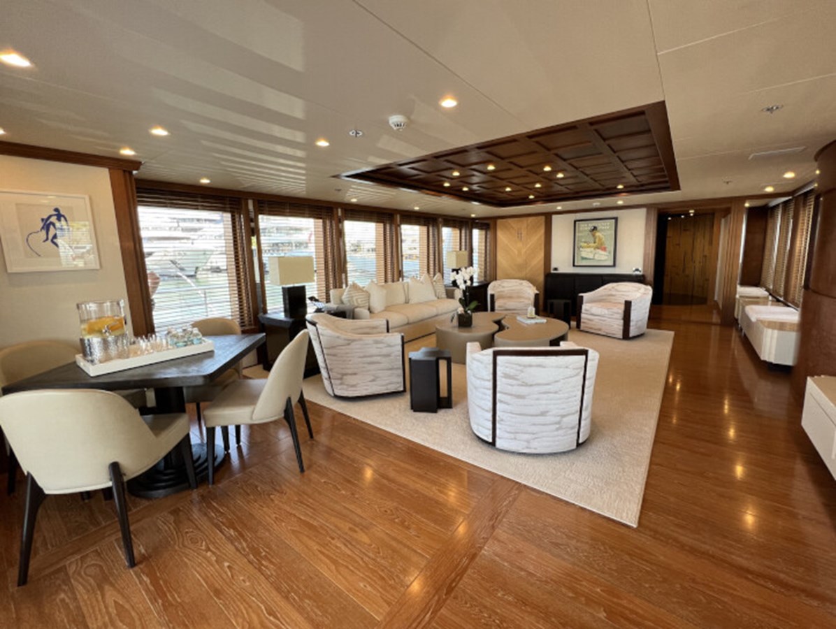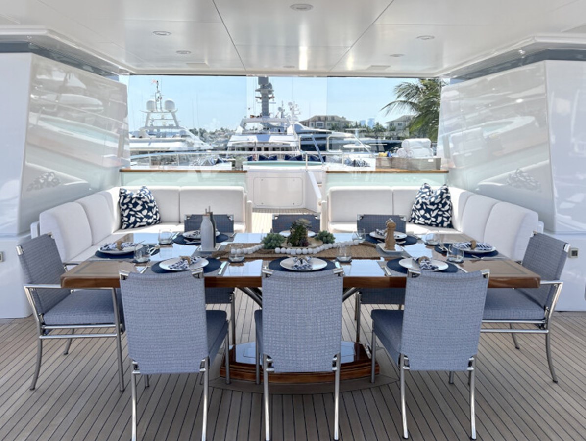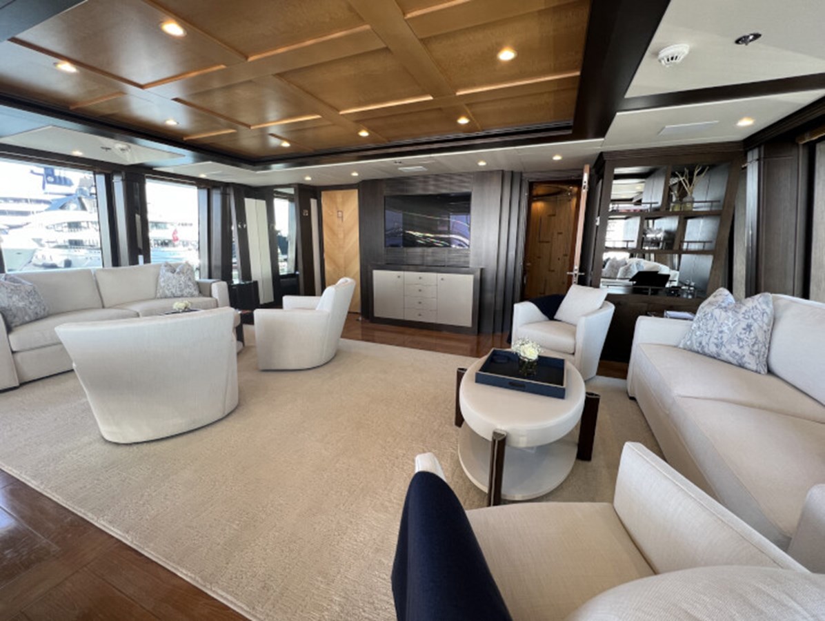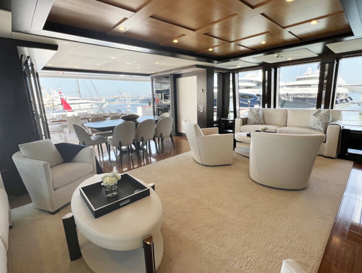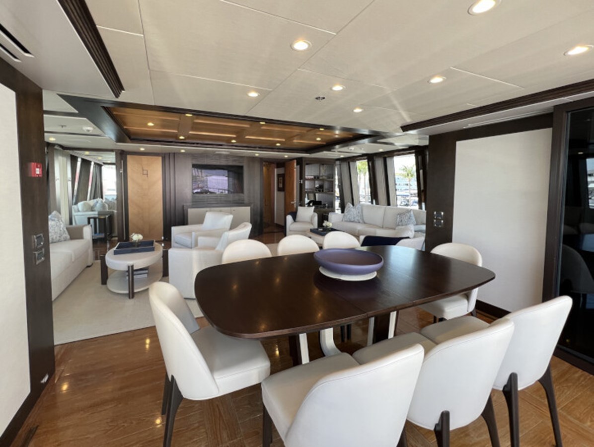 There is a second sophisticated indoor socialising space in the bridge deck salon, with a TV and lounge area, plus an indoor dining table. Bifold doors connect the space to the upper deck aft.