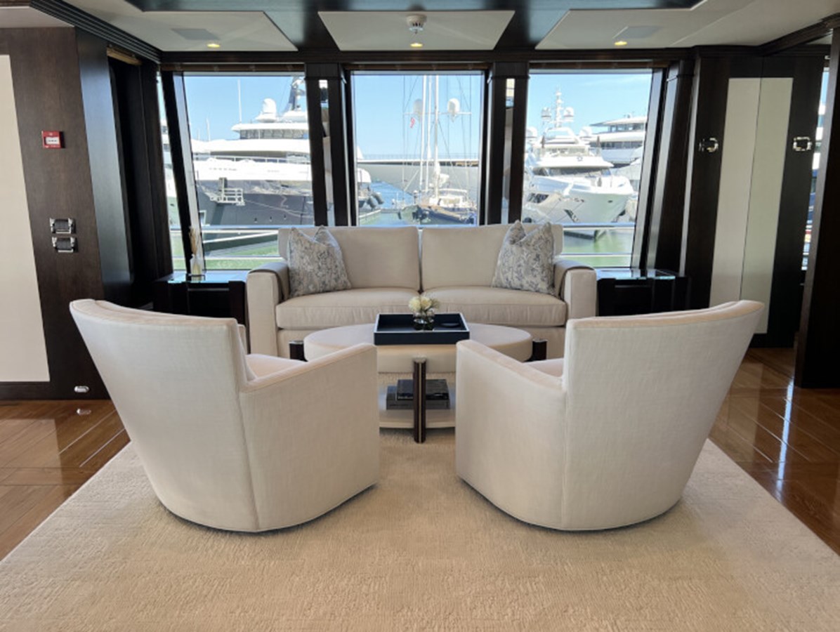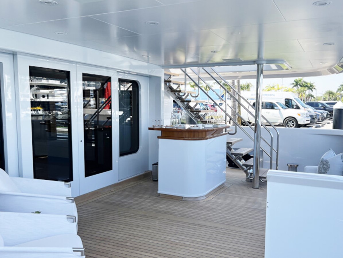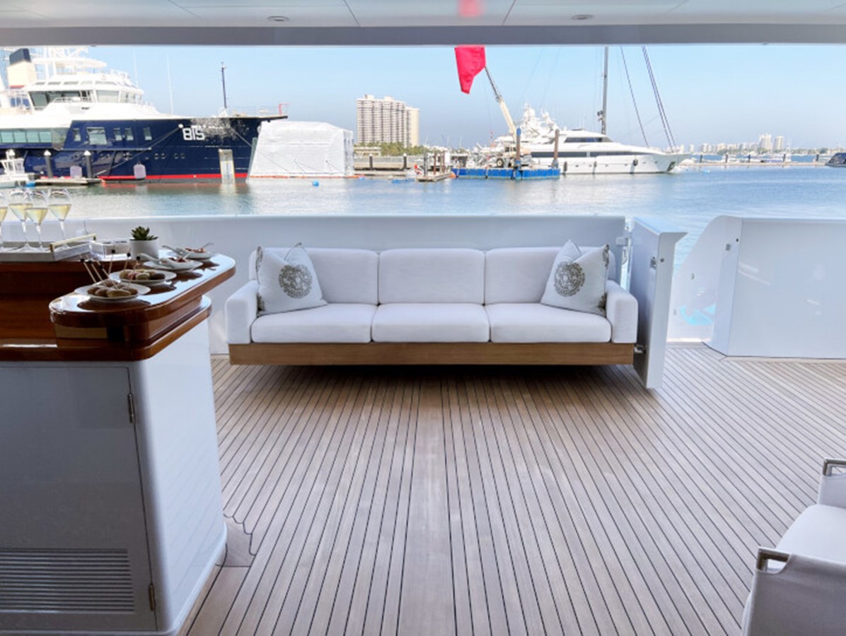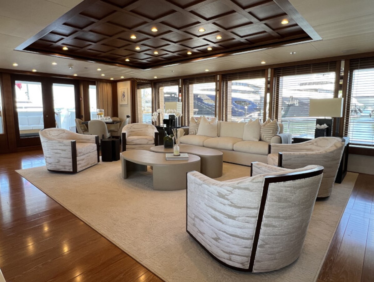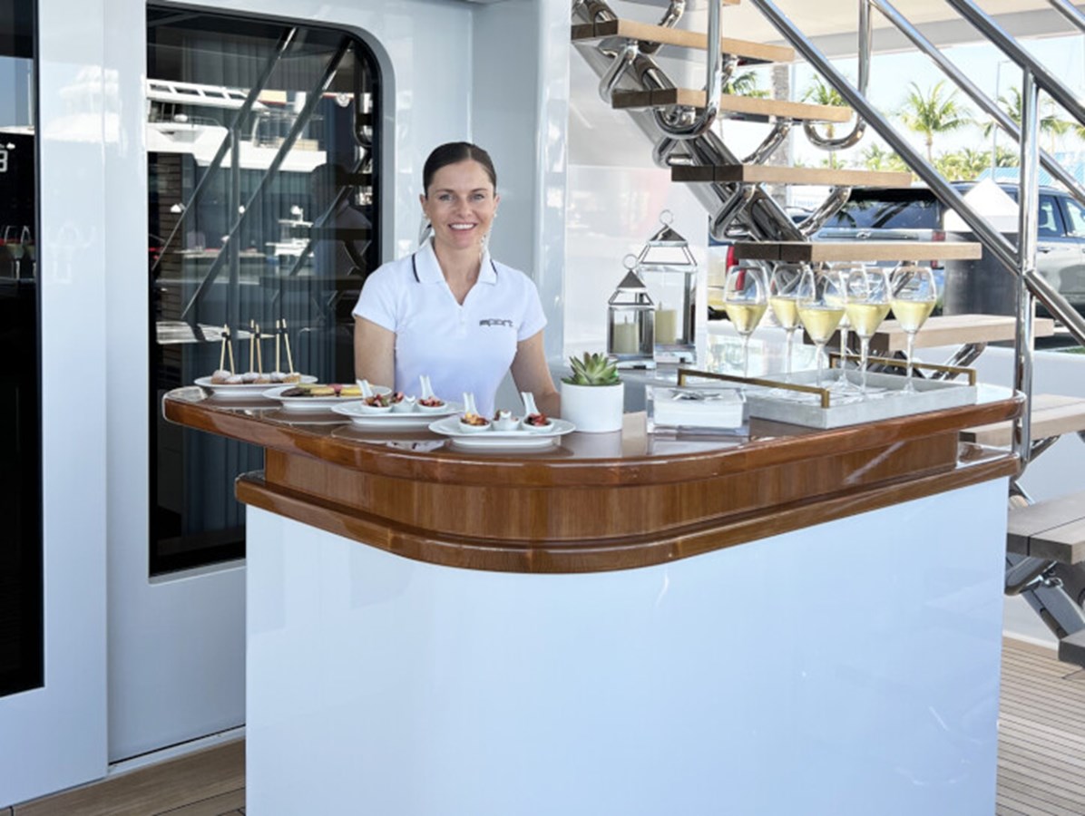 There is a second sophisticated indoor socialising space in the bridge deck salon, with a TV and lounge area, plus an indoor dining table. Bifold doors connect the space to the upper deck aft.